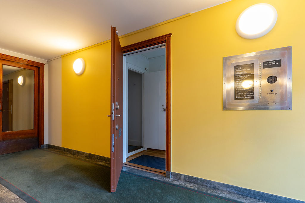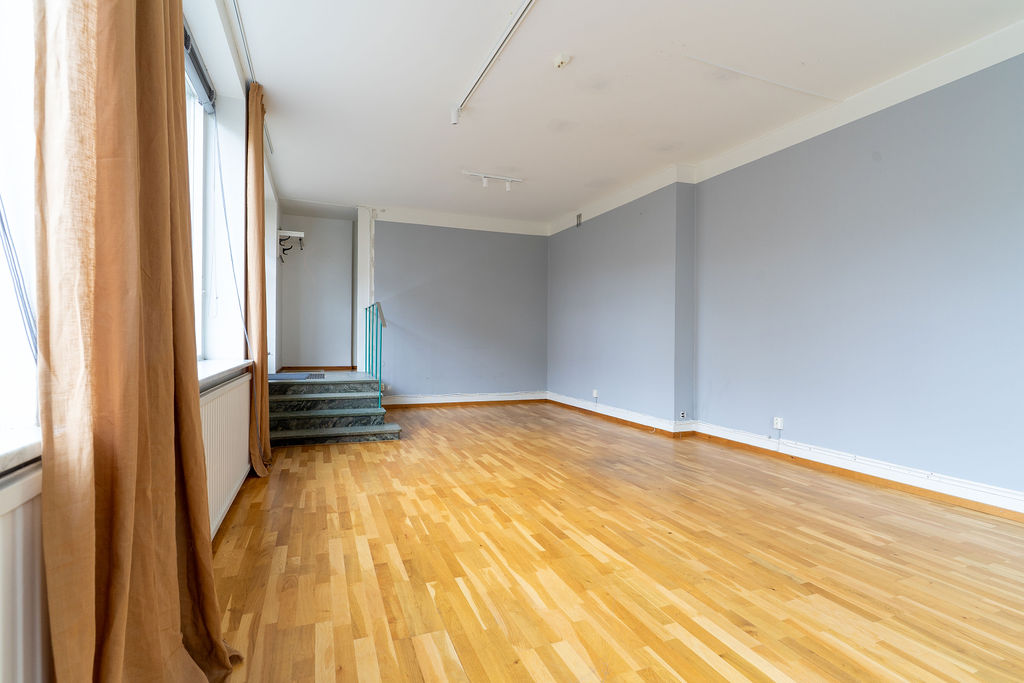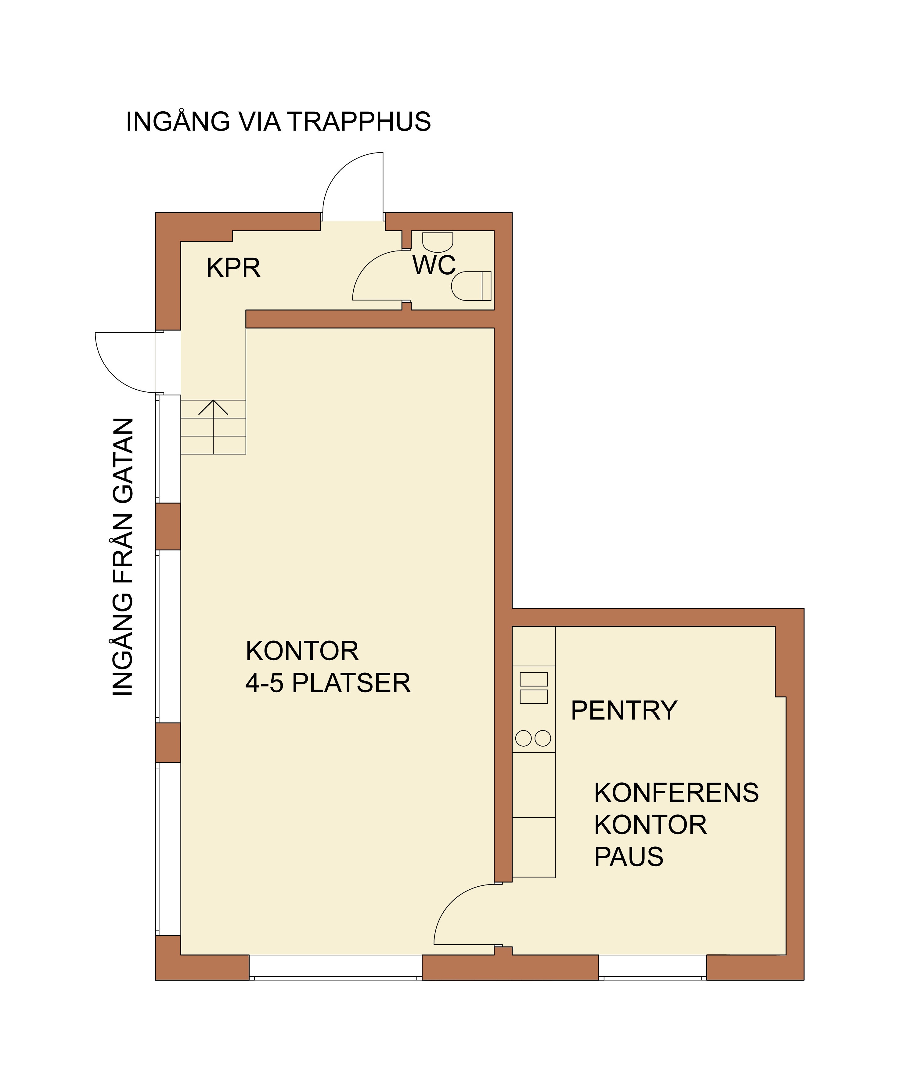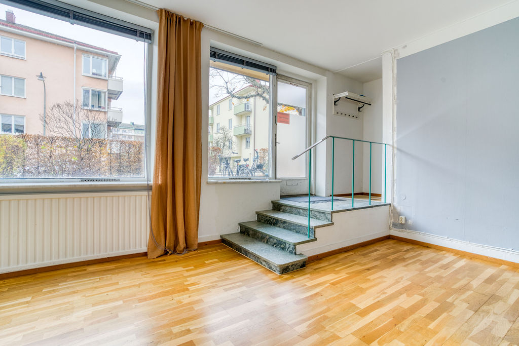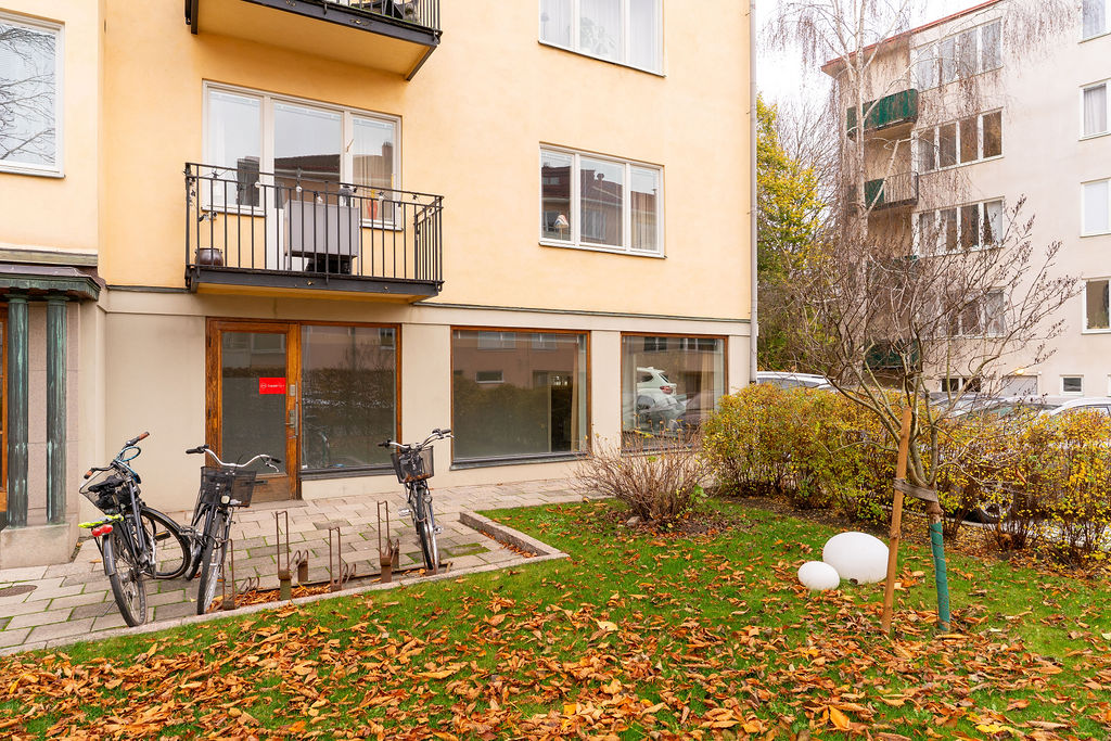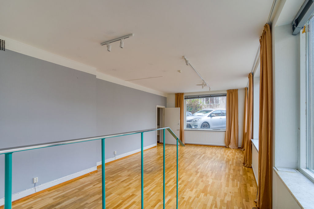 Lokalen har två entréer, den ena en egen ingång direkt från Brantingsgatan och den andra via trapphuset. Det största rummet om ca 38 m2 nyttjas förslagsvis som kontor, kundyta/ mottagning alternativt showroom. Fyra stora skyltfönster gör lokalen mycket ljus samt erbjuder fina möjligheter att exponera produkter eller varumärke. Innanför det stora rummet finns ytterligare ett rum om ca 17,5 m2 där lokalens exklusiva pentry är placerat. Detta rum har en hög säkerhetsnivå med ett gallerförsett fönster och låsbar säkerhetsdörr. Intill entrén mot trapphuset finns en mindre wc.