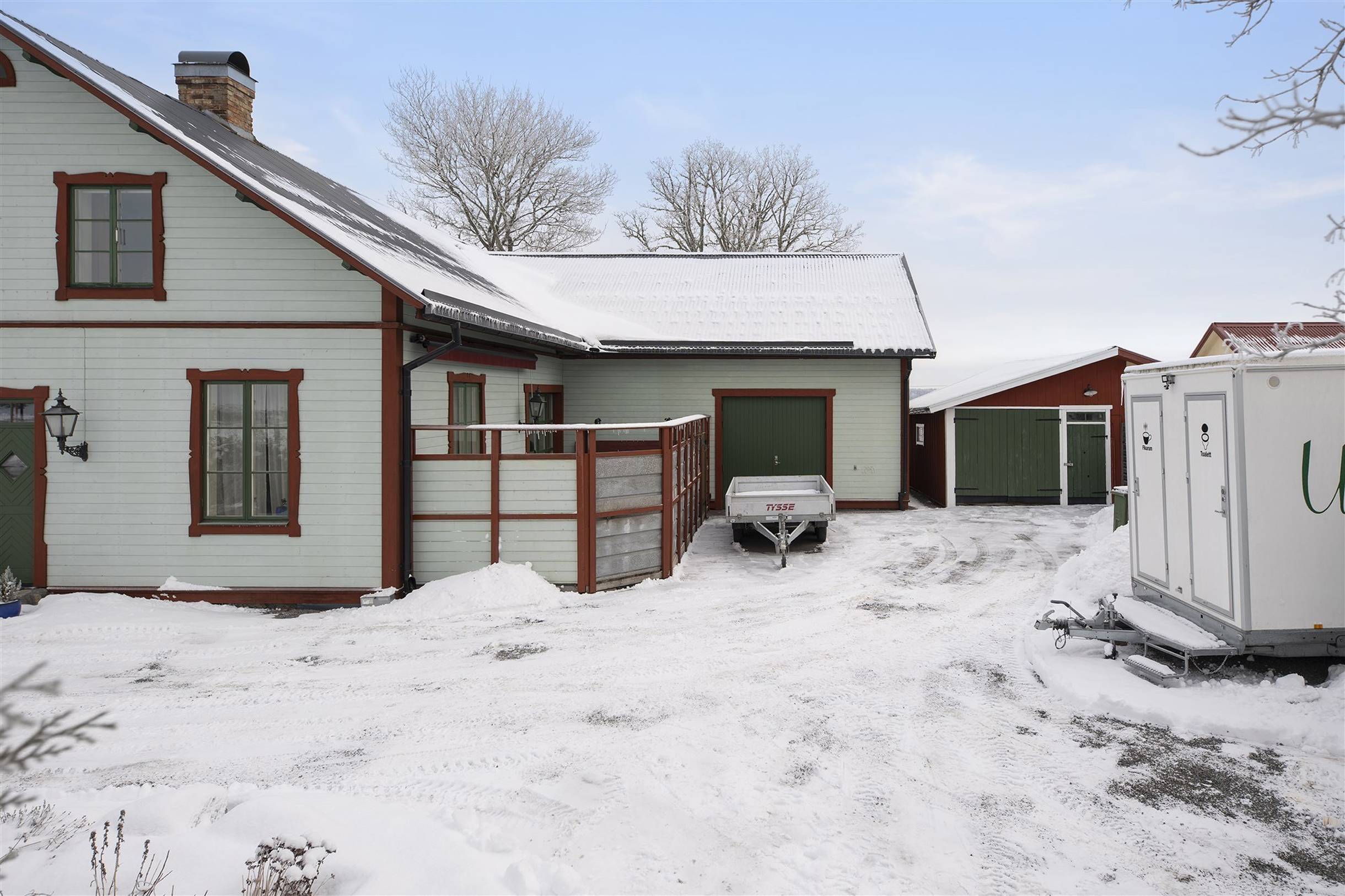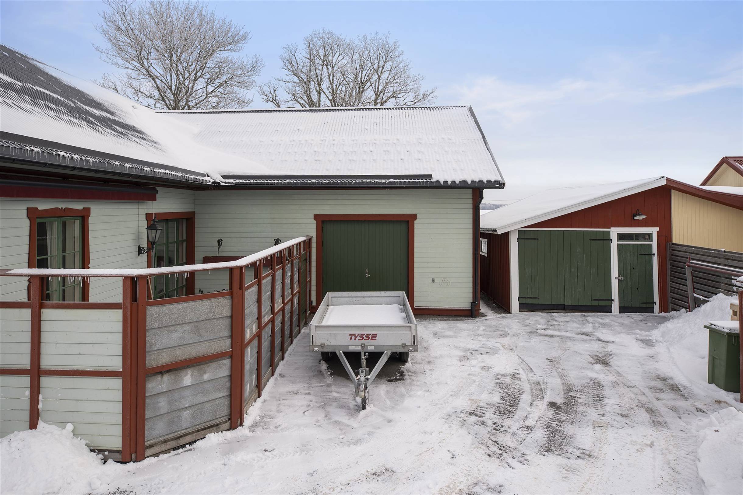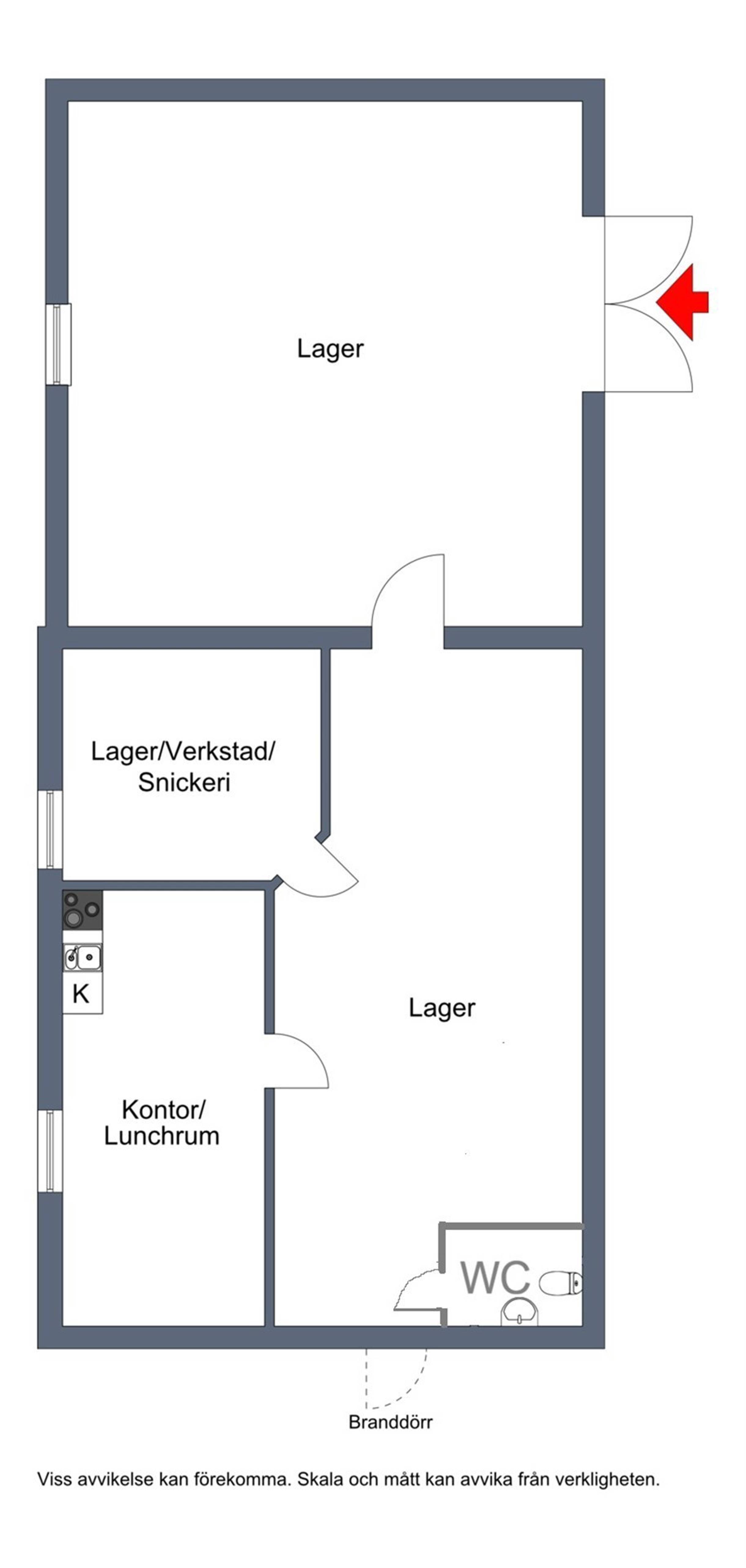 Planlösningen om 143 kvm erbjuder ett rymligt garage med port och asfalterat golv som även har plats för lagerdel. Vidare finns lager/förråd med rejäl takhöjd med rymlig toalett med handfat. Ytterligare finns ett mindre lager/produktion- eller snickeri. Vägg i vägg ligger ett kontor och mellan dessa är det en glasvägg. Kontoret är avlångt med ett pentry och lunchgrupp i ena delen och två arbetsplatser i den andra.