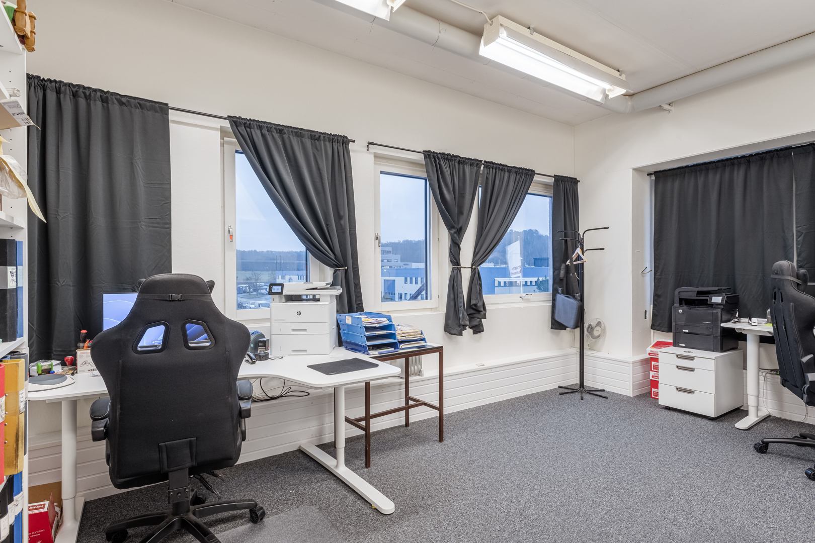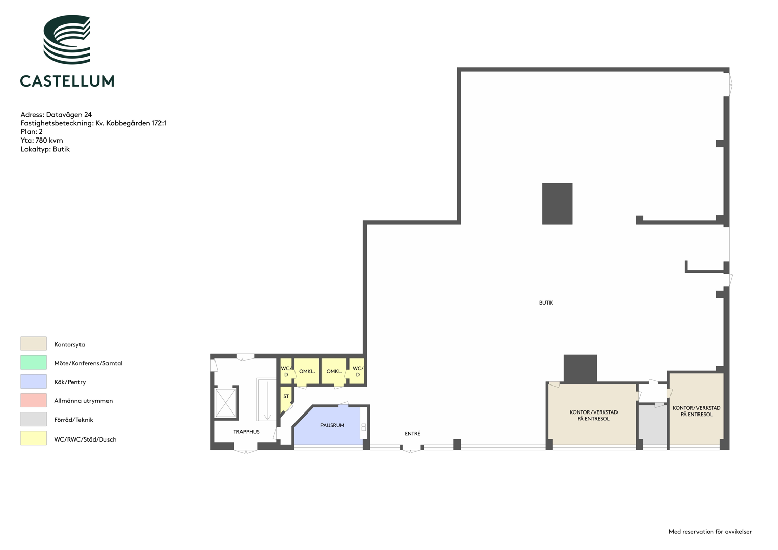 Befintlig planlösning är en öppen yta med generös takhöjd, ett entresol, pausyta samt omklädningsrum, dusch och wc. Det finns port med lastbrygga