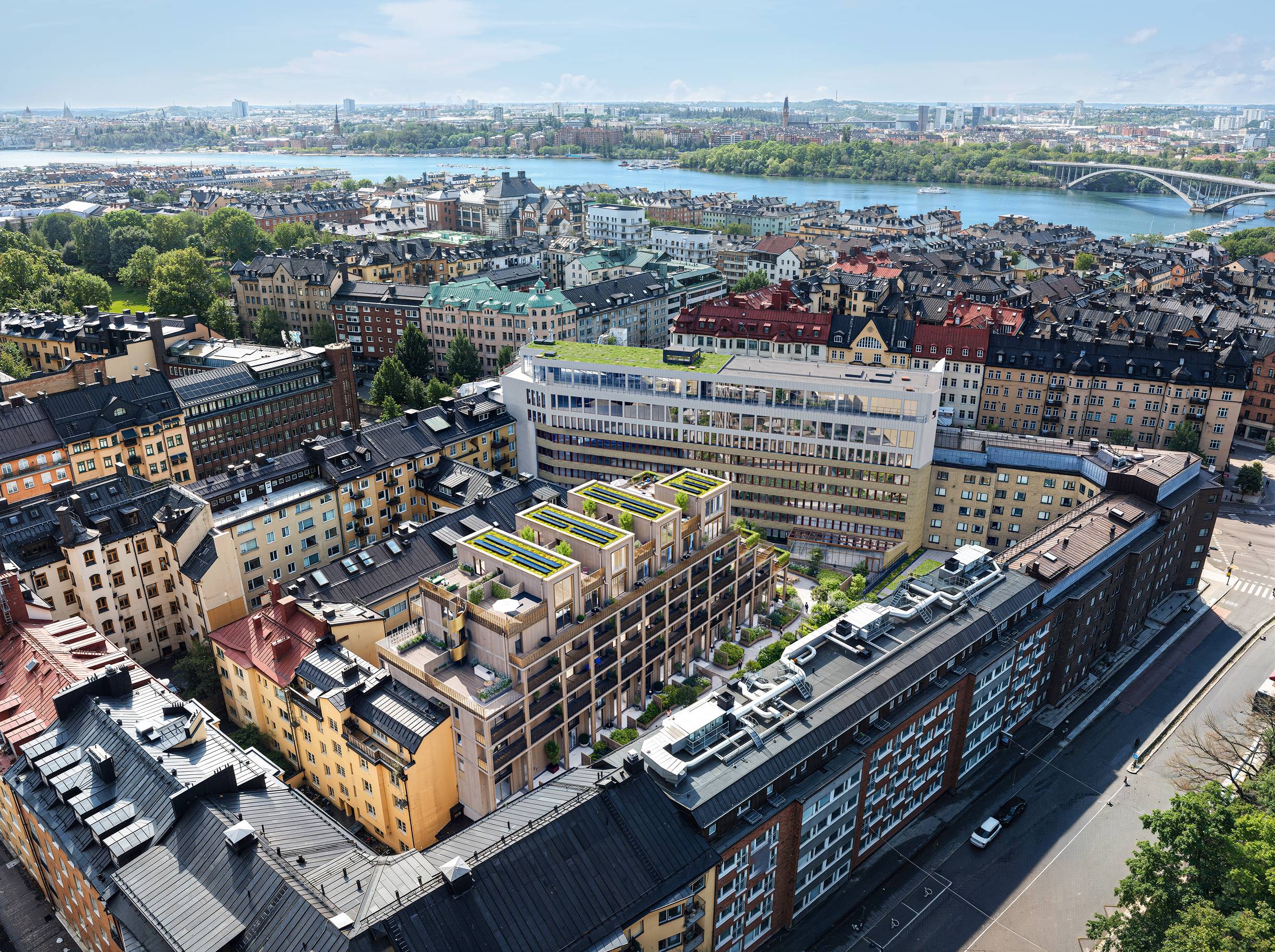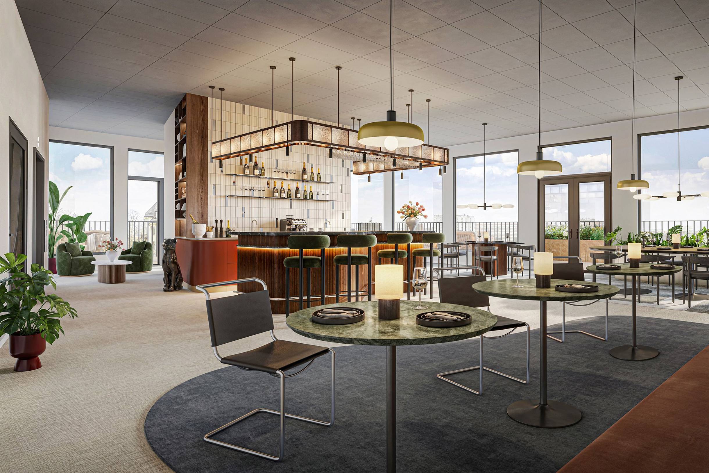 Högst upp i huset finns nu en unik penthouse-lokal om 963 kvm med panoramafönster från golv till tak, 360 graders utsikt över Stocksholms takåsar, spetsigt designkoncept och påkostade materialval. Lokalens självklara samlingsplats är en slående bar där morgonens kaffekopp smakar extra bra. Att dessutom kunna glida ut på den 90 kvm stora, helt privata takterrassen, gör att kaffet smakar ännu bättre.