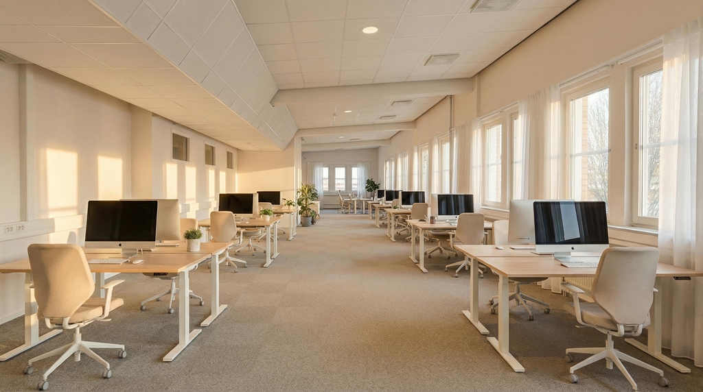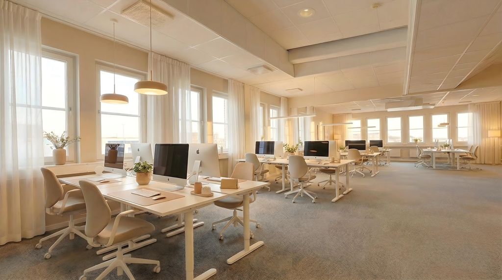 Lokalen erbjuder generösa kontorsytor med öppna arbetsytor placerade längs fönsterrader i flera väderstreck, vilket ger ett fint ljusinsläpp och en ljus och luftig arbetsmiljö. Det finns tre mötesrum i varierande storlekar, från mindre samtalsrum till ett större konferensrum anpassat för presentationer och styrelsemöten. Därutöver finns tre mindre samtalsrum, väl lämpade för mindre grupper eller enskilda samtal.