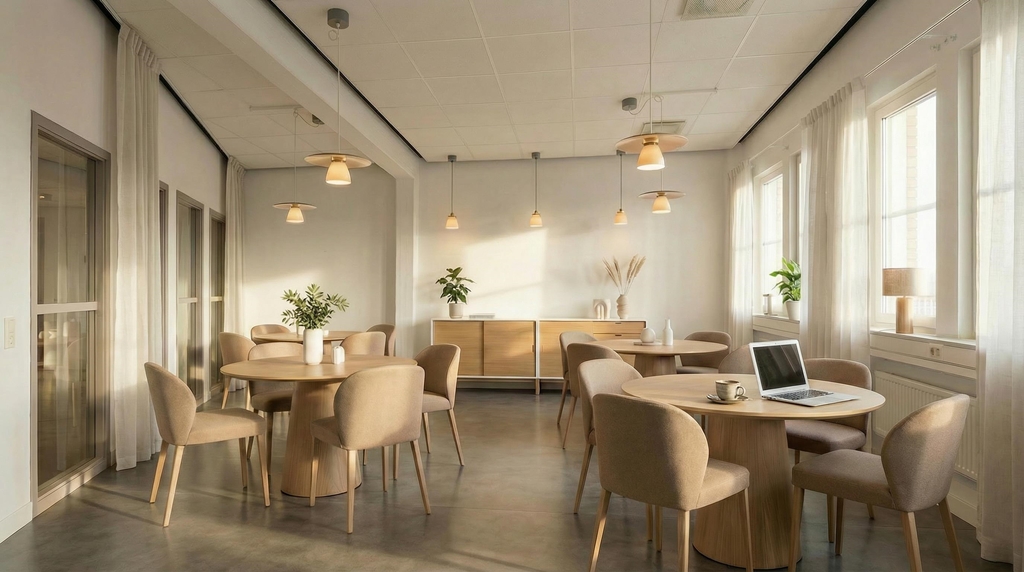 Ett rymligt pausrum med tillhörande pentry och loungedel skapar en naturlig samlingsplats för luncher och informella möten.