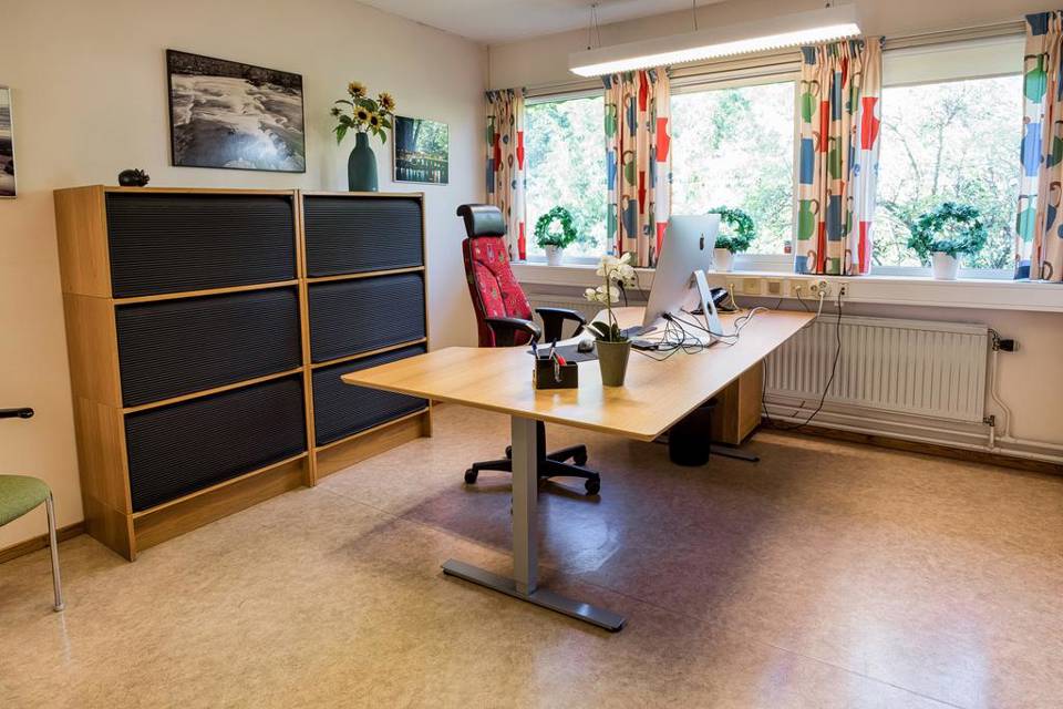 Välskött kontorsfastighet där huvudbyggnaden rymmer 12-13 stora kontorsrum. Här finns sammanträdesrum samt ett konferensrum som har flyttbar vägg mot lunchrummet så att större träffar fungerar med personal och kunder. Stort brandsäkert arkiv. Rummen avdelas med glasytor som ger en ljus och öppen känsla,här finns en rymlig reception.
