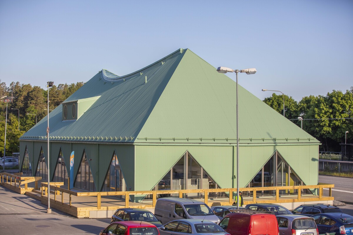 Fasaden som är i enhetlig volym och fungerar på både väggar och tak är en grön sinuskorrugerad plåt som är formbar och ger byggnaden ett textilt uttryck. Färgen är dessutom ytterligare en blinkning åt koppartälten i Haga.