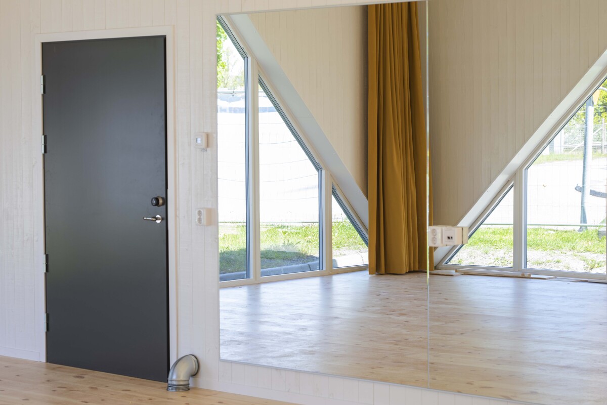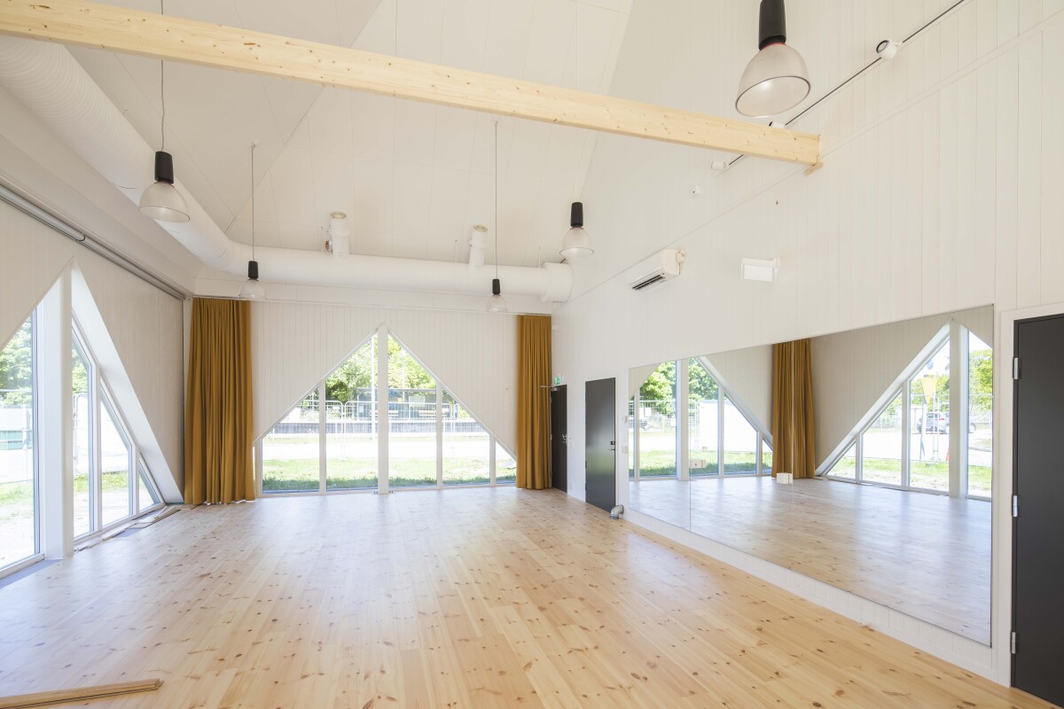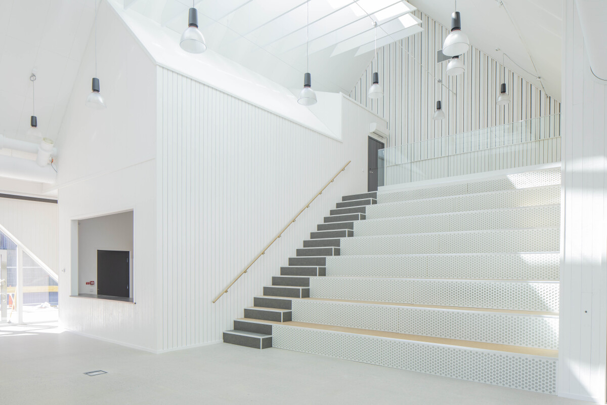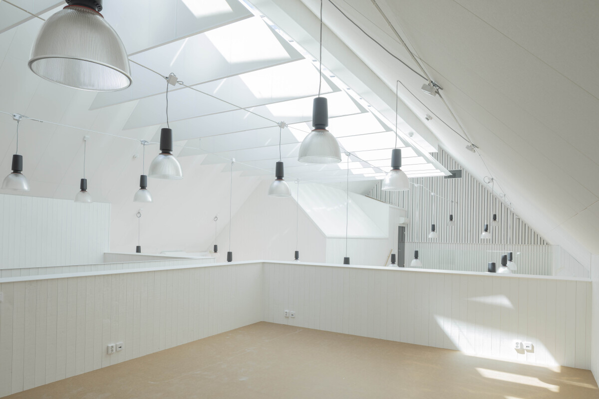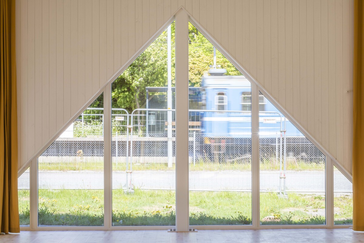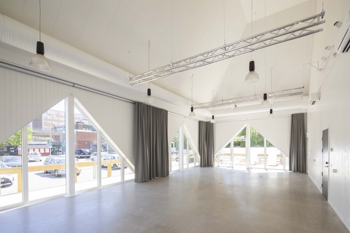 Ett tydligt designelement är det 30 meter långa takfönstret som tillsammans med de triangulära fönstren skapar en härlig inomhusatomsfär.