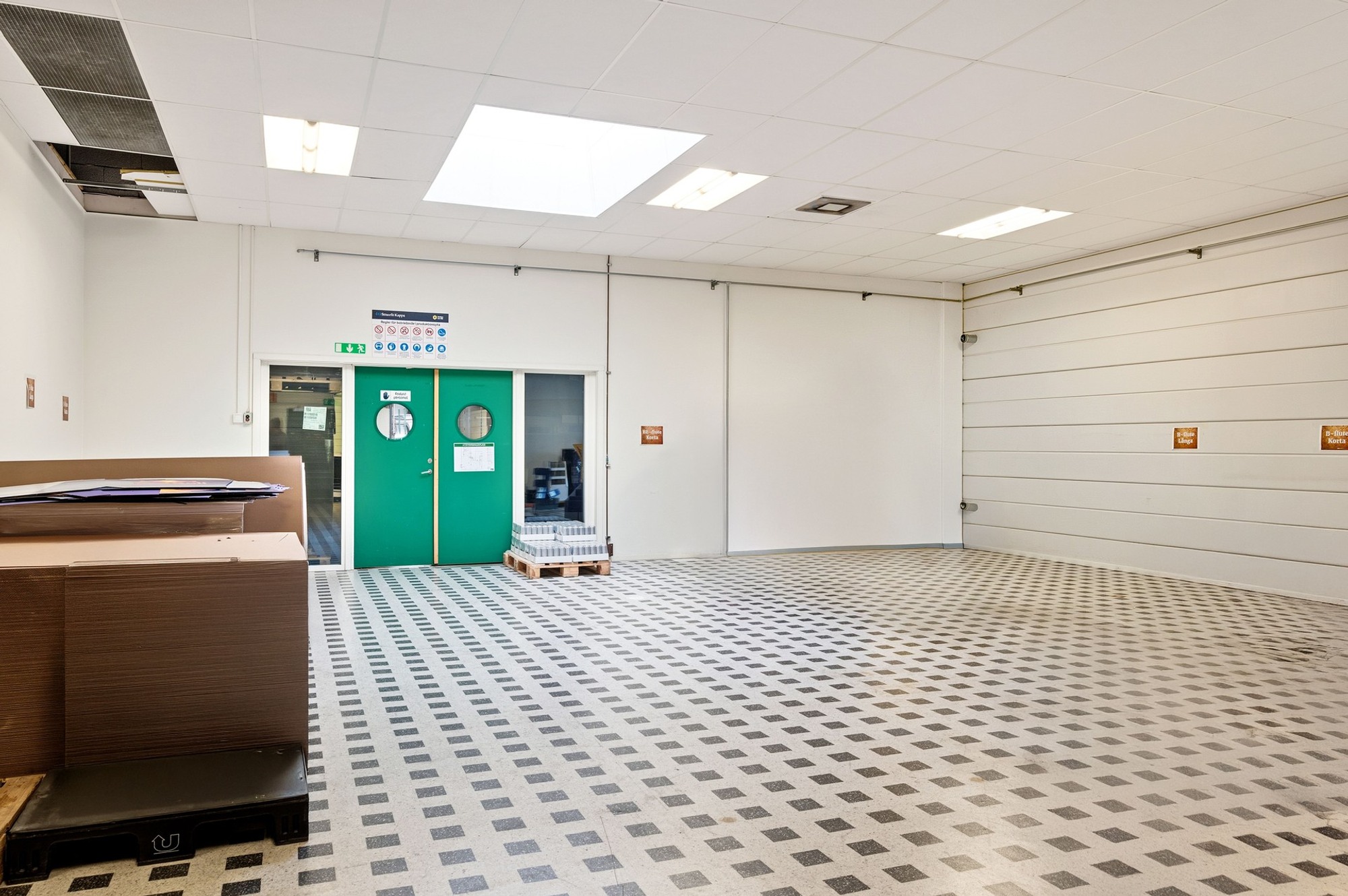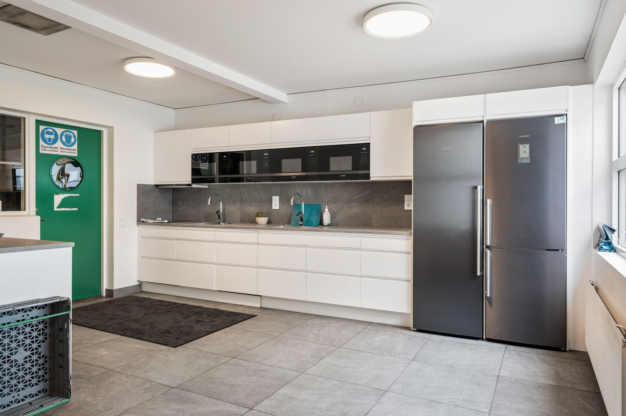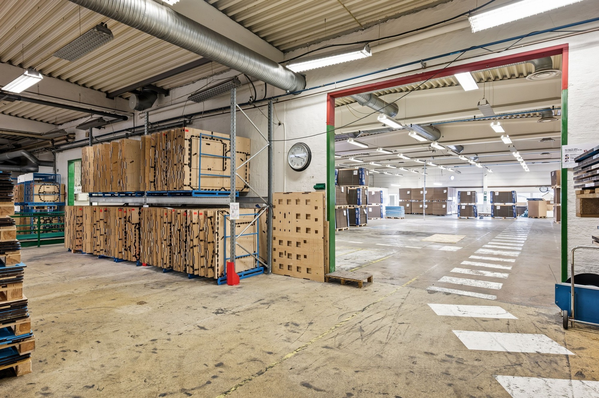 Lokalen är uppdelad i två delar – en kontorsdel och en större lagerdel. Kontoren är placerade kring ett centralt mötesutrymme med närhet till pentry och pausrum. Lagerdelen erbjuder öppna ytor, ett kök med matplats, lastport samt en öppning med rullband direkt till container för smidig hantering. En sektion har förhöjd takhöjd, perfekt för höglager eller större utrustning. Planlösningen är flexibel och skapar en effektiv arbetsmiljö med smidig koppling mellan kontor och lager.