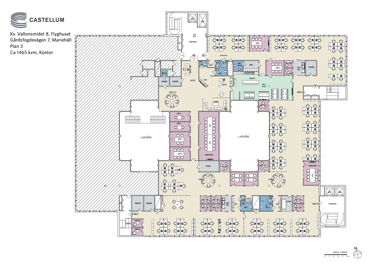I mittkärnan av lokalen finns en ljusgård som ger ett härligt ljusinsläpp och skapar en ljus och trevlig arbetsmiljö.