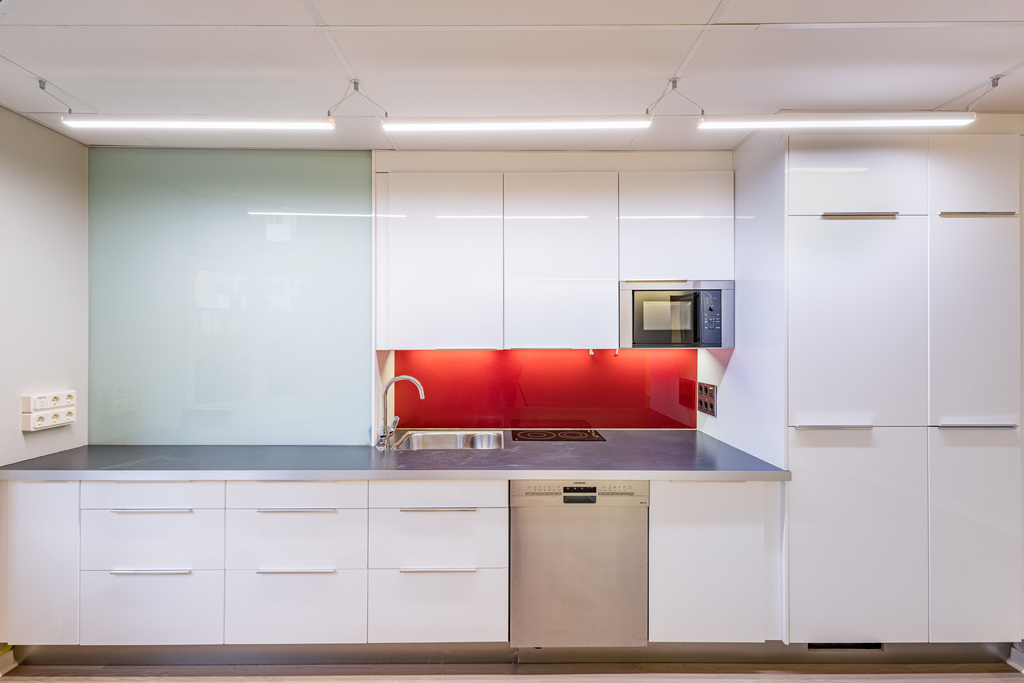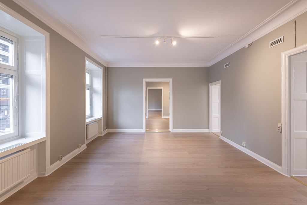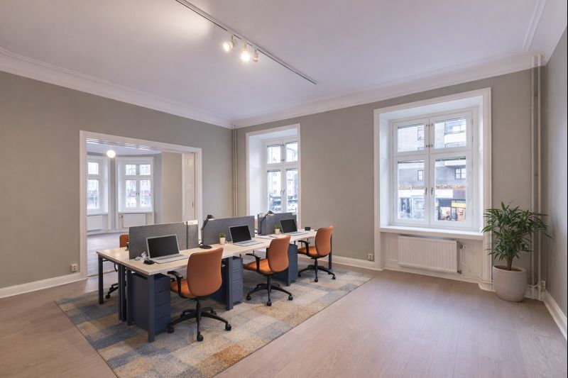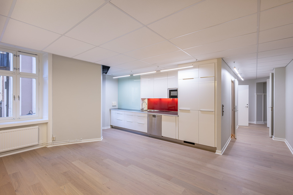 Kontoret på ca 210 kvm är genomtänkt planerat med tre stora öppna kontorsrum som ger flexibilitet för olika arbetsgrupper. Ett välutrustat konferensrum och ett separat samtalsrum möjliggör professionella möten och diskreta samtal. Det stora pentryt har generöst utrymme för matplats, vilket skapar naturliga mötespunkter för personalen.