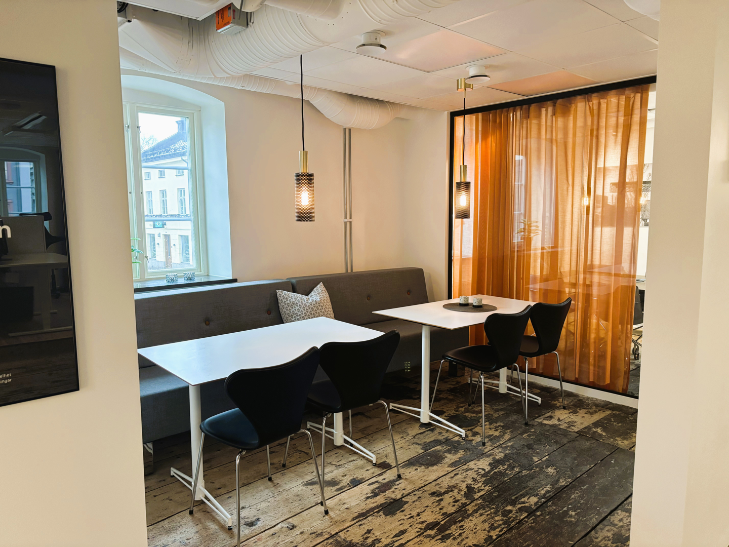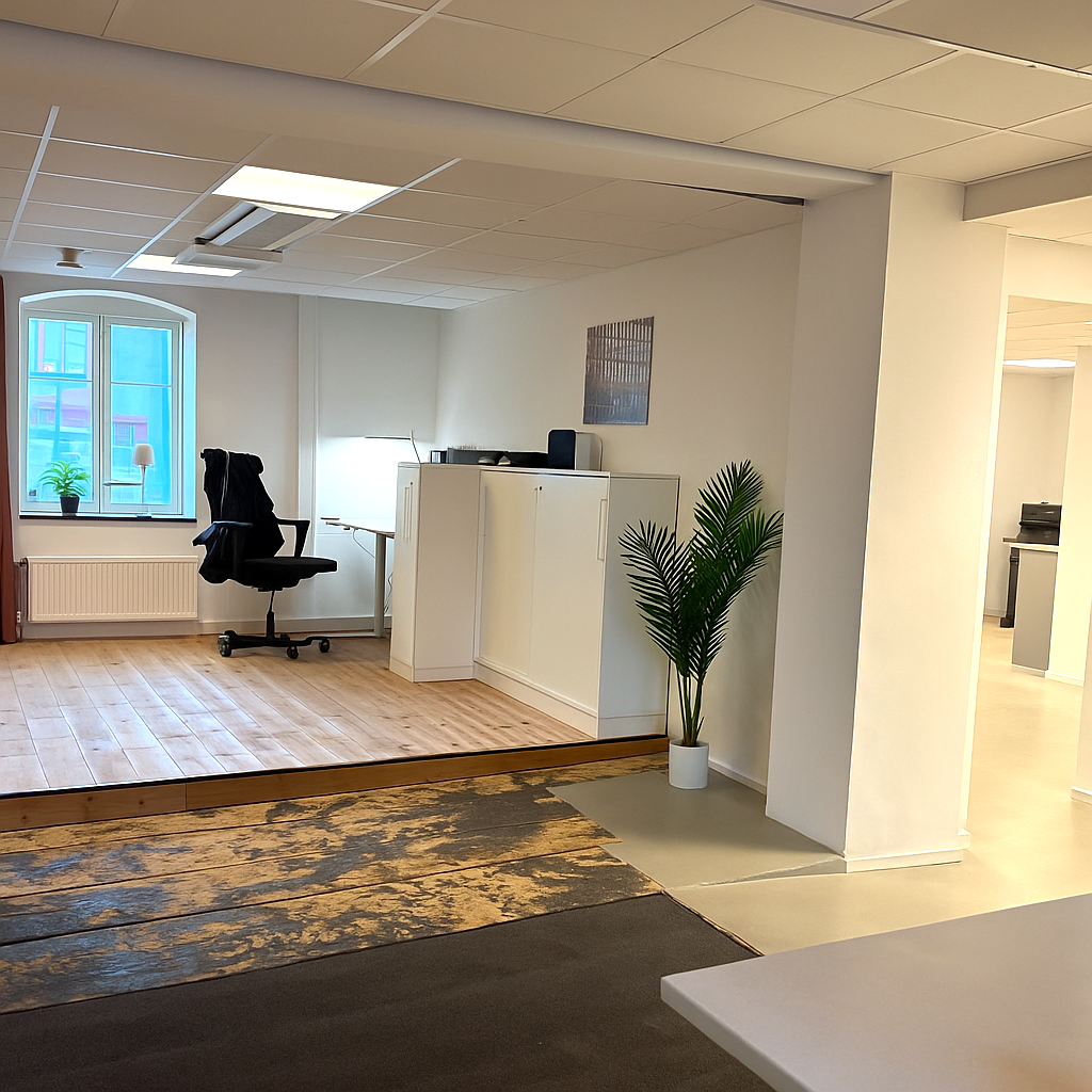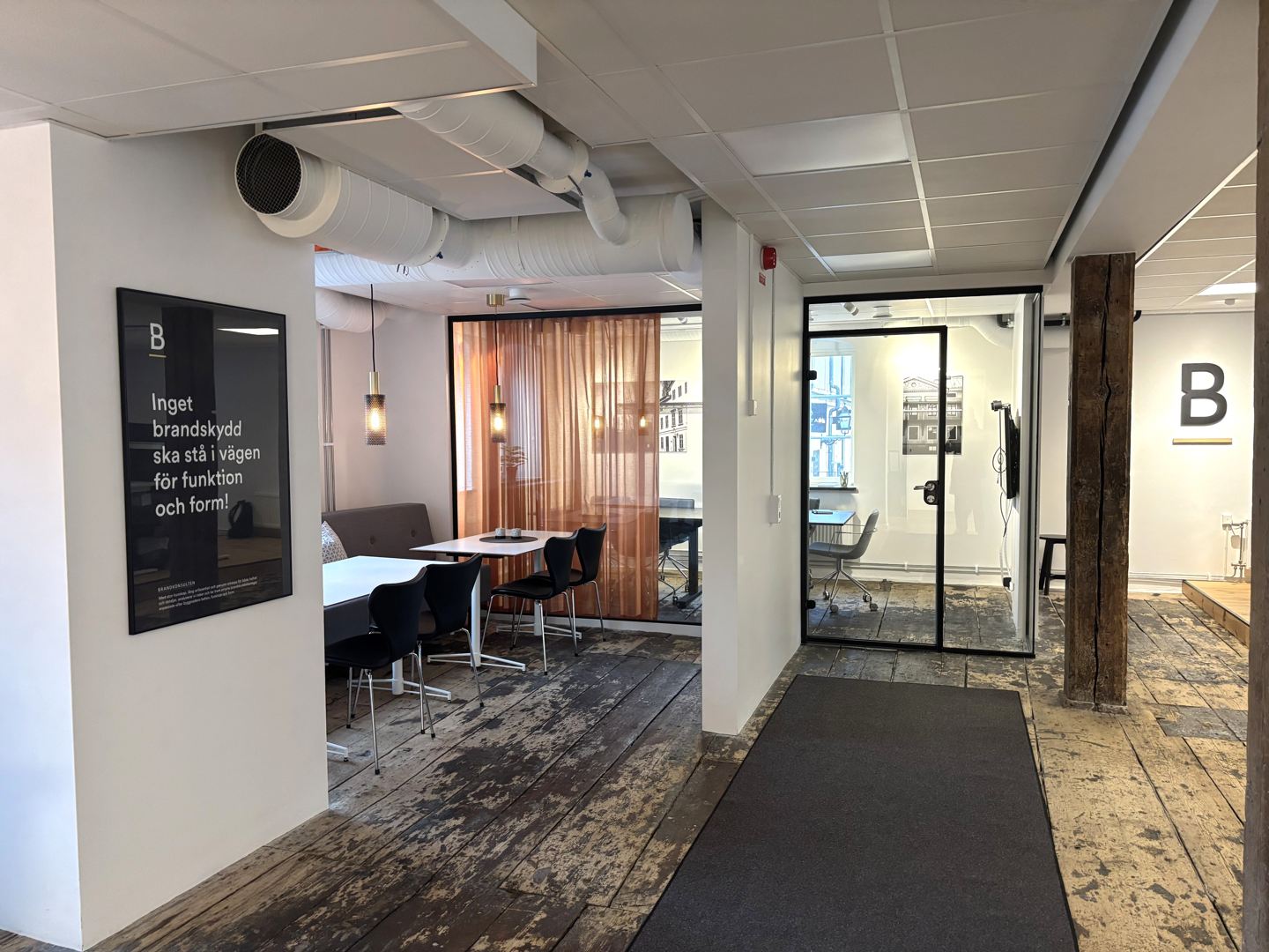 Lokalen präglas av stora fönster som flödar av dagsljus, och vackra trägolv med patina som ger karaktär. De genomtänkta detaljerna – från belysningen till färgsättningen – skapar en varm och professionell atmosfär där både kreativitet och effektivitet får plats - ett kontor att trivas i.