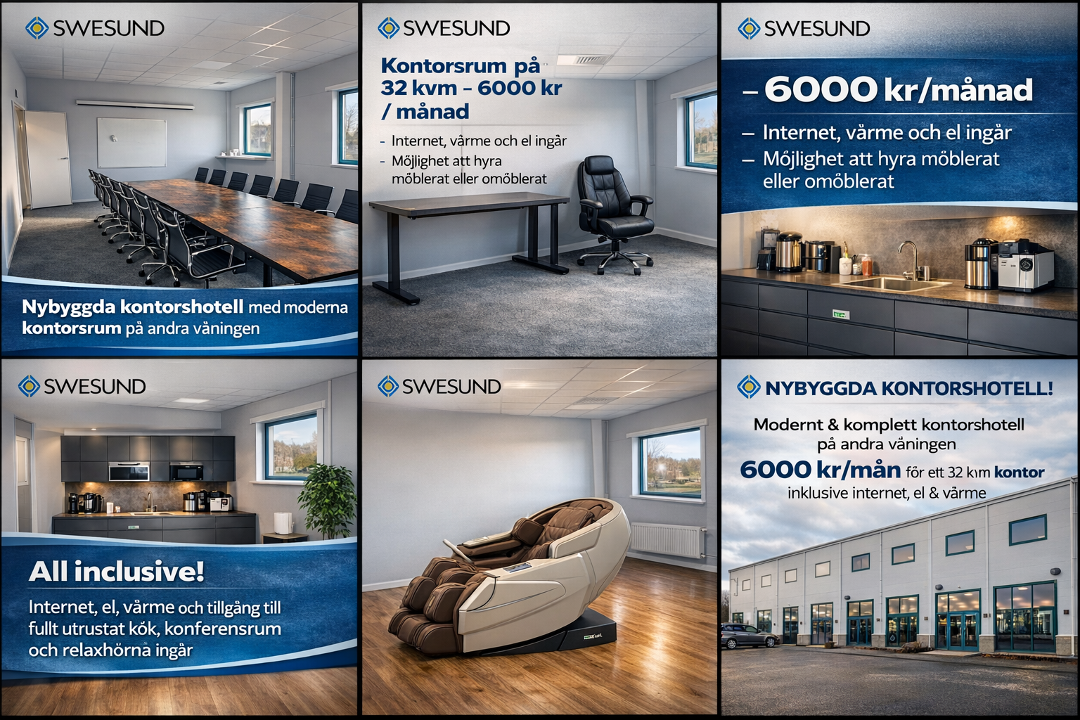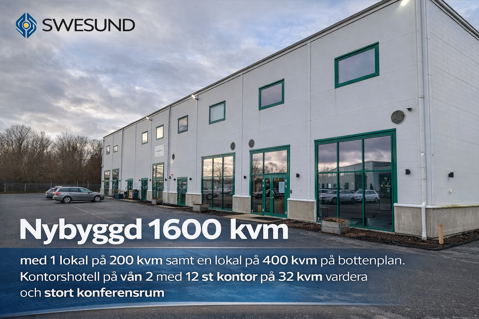 Nybyggd fastighet om ca 1 600 kvm med flexibel planlösning. På bottenplan finns lokaler om 200 kvm och 400 kvm. Våning 2 erbjuder modernt kontorshotell med 12 kontor om 32 kvm vardera samt stort konferensrum som alla hyresgäster har tillgång till. Hela byggnaden är handikappanpassad och utrustad med hiss. En modern och representativ miljö för företag som söker kvalitet och tillgänglighet.