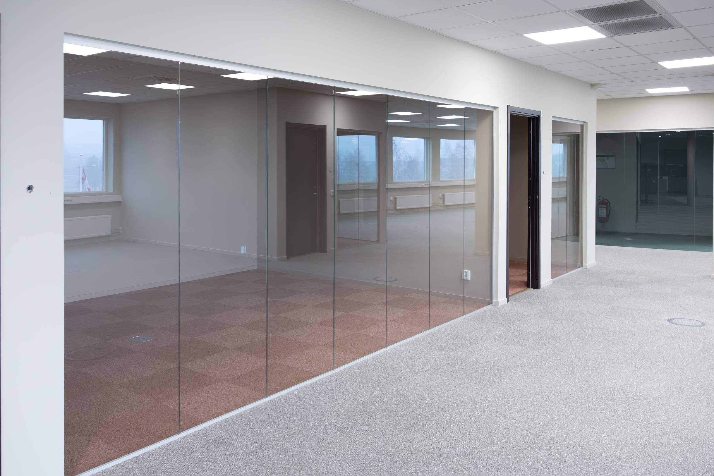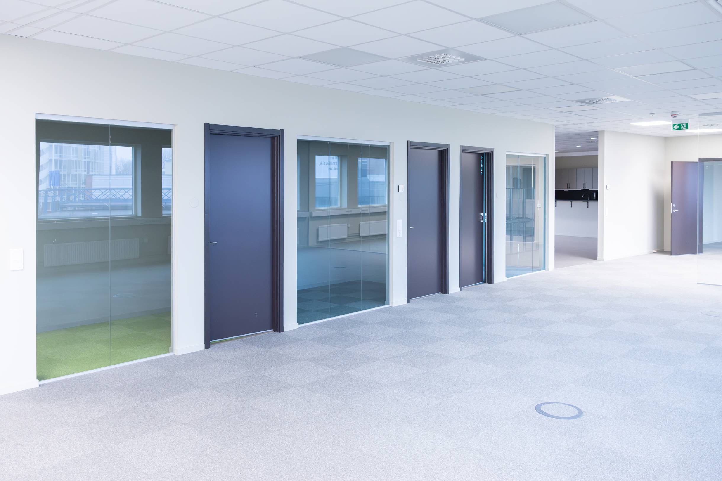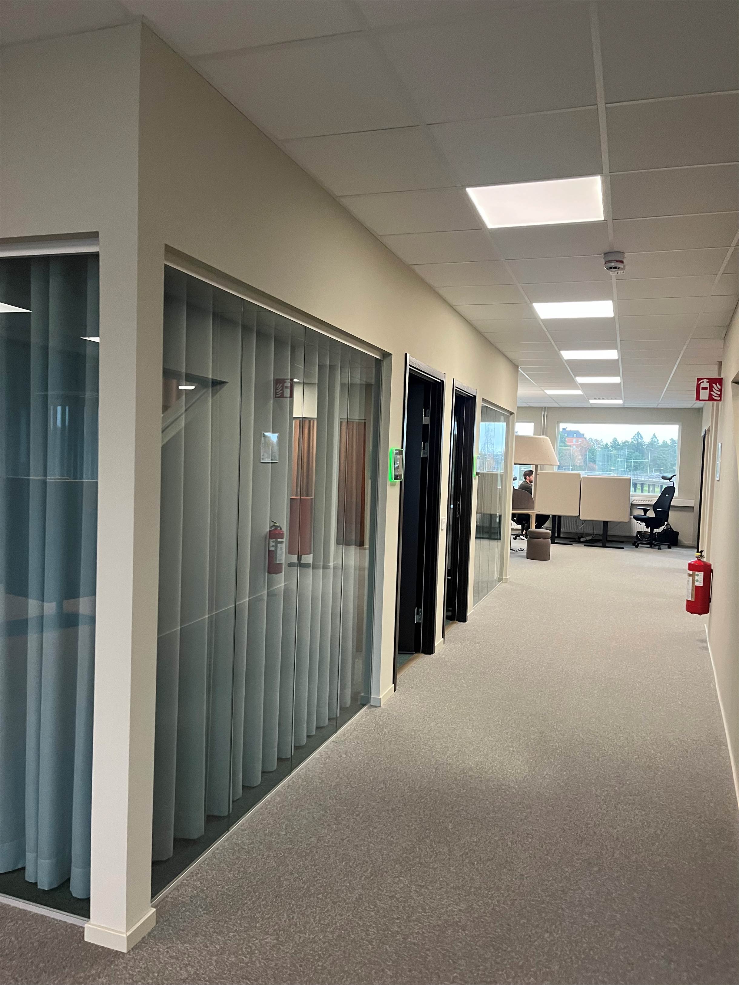 Kontorslokal i ett plan med öppet landskap, flertalet tystarum och konferensrum.
