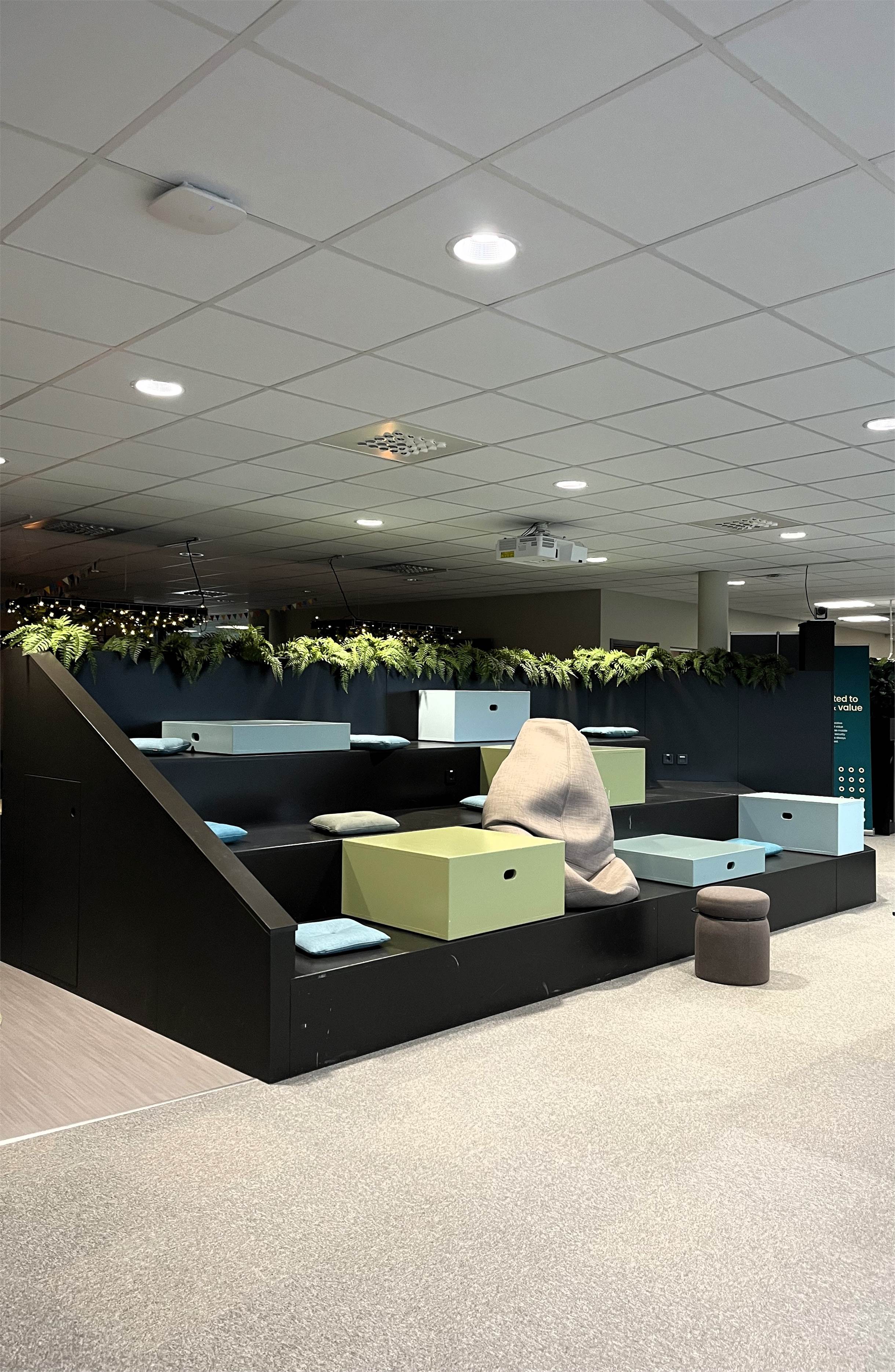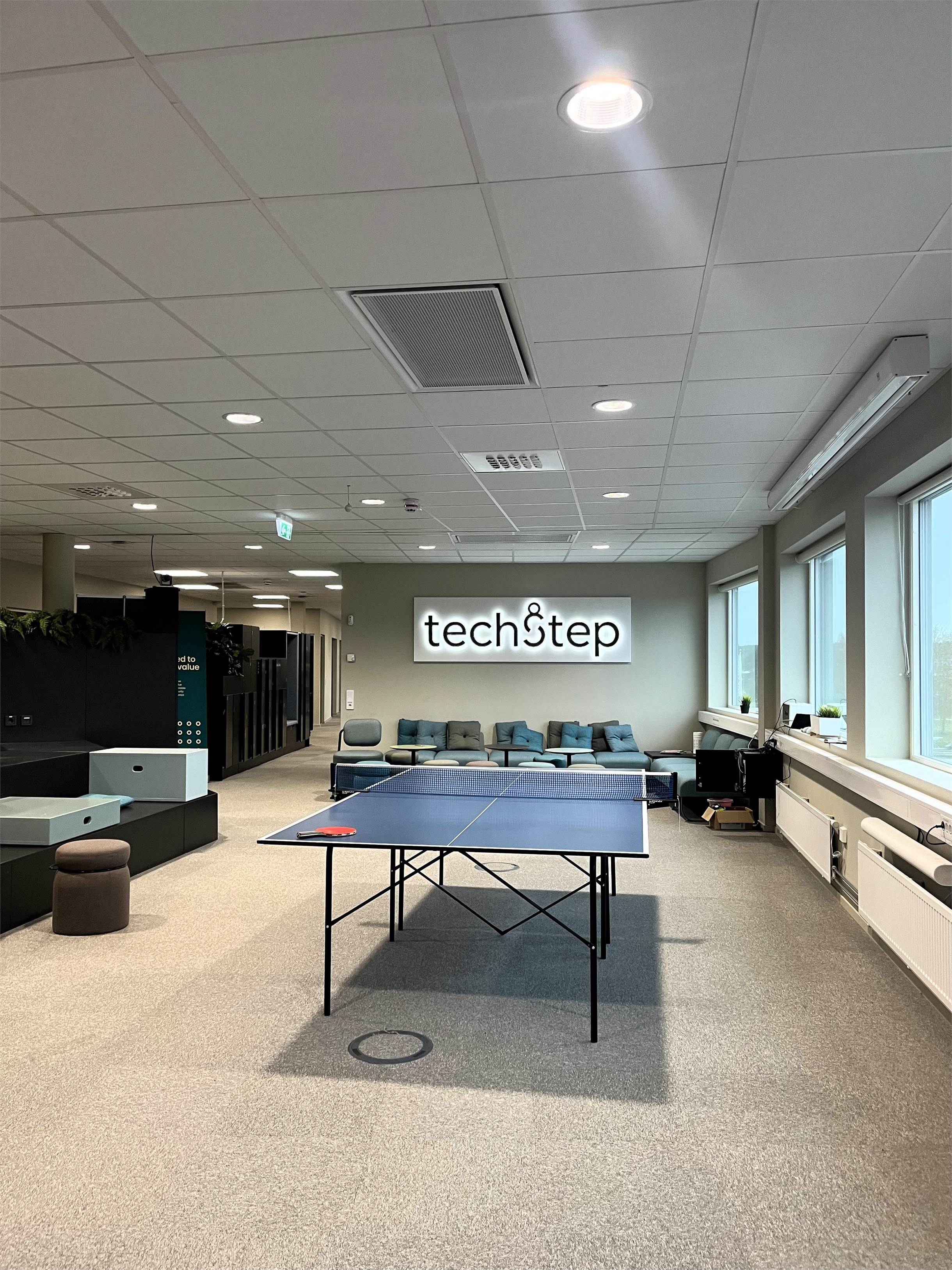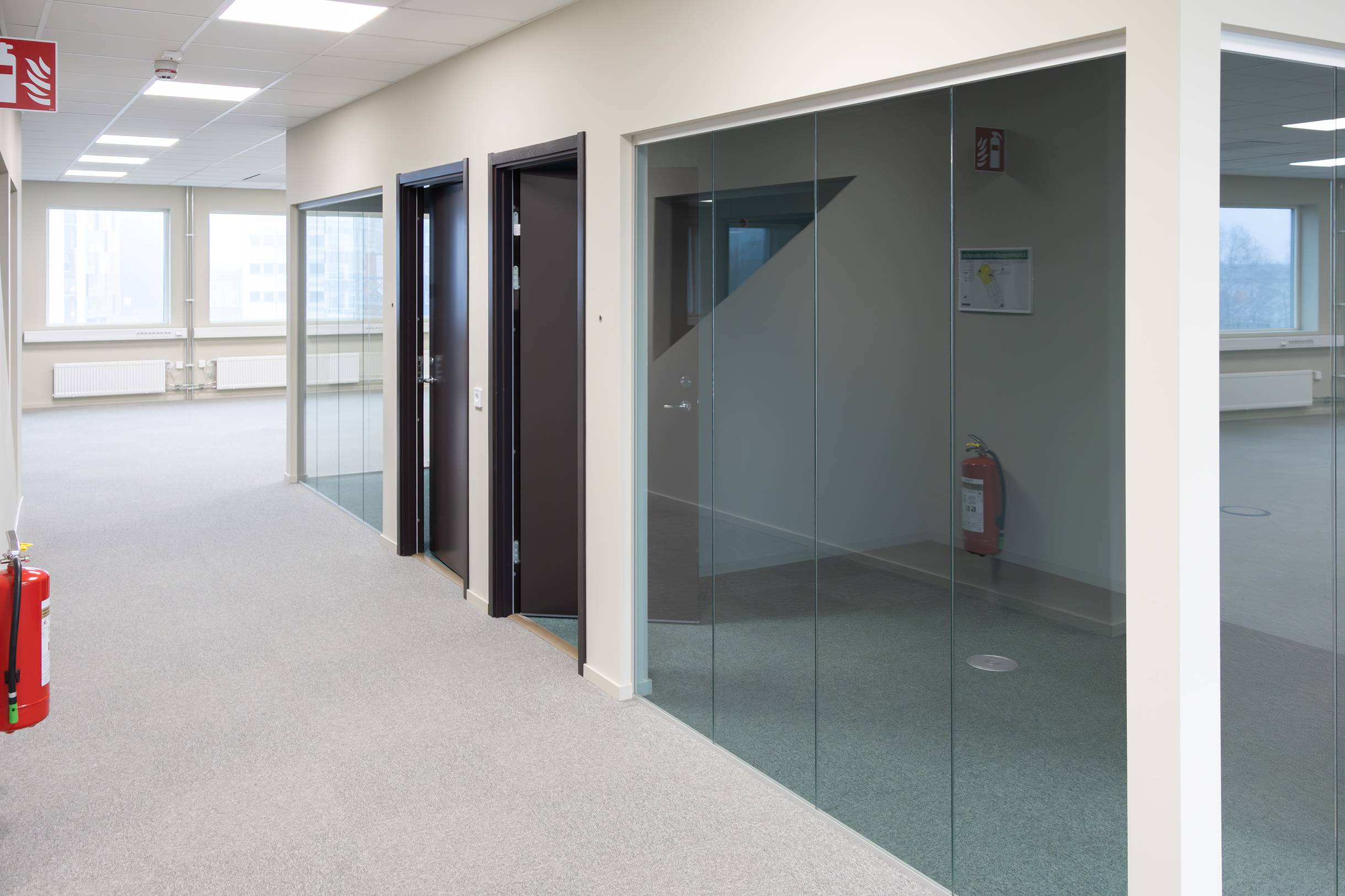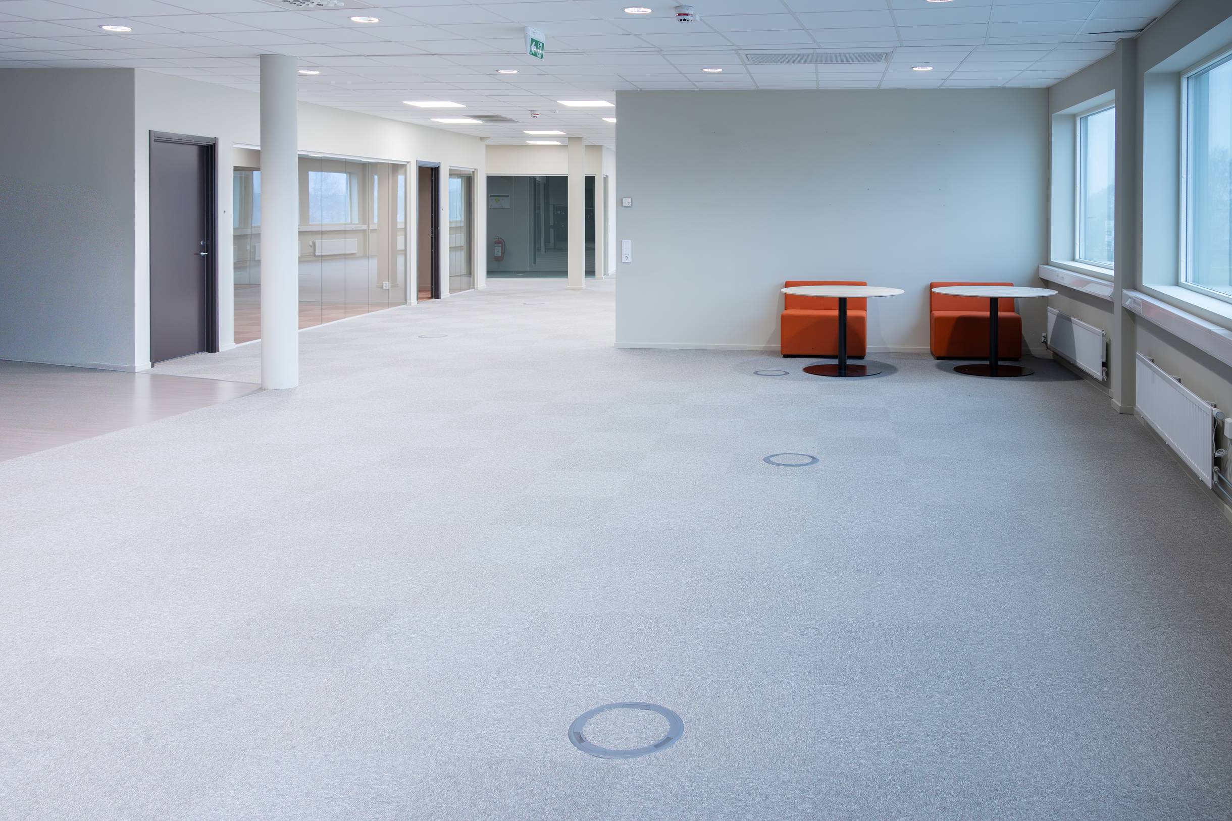 Kontorslokal i ett plan med öppet landskap, flertalet tystarum och konferensrum.