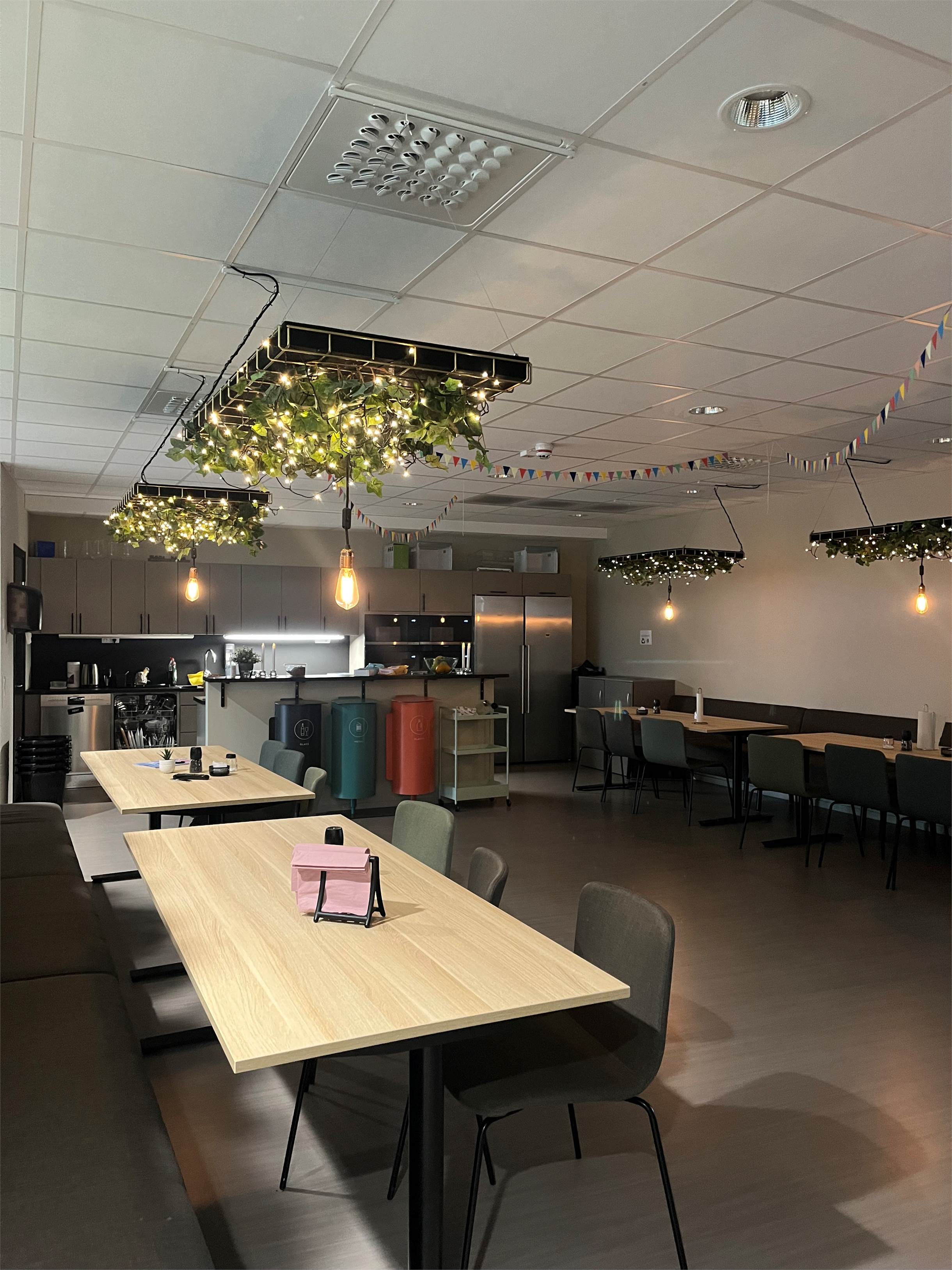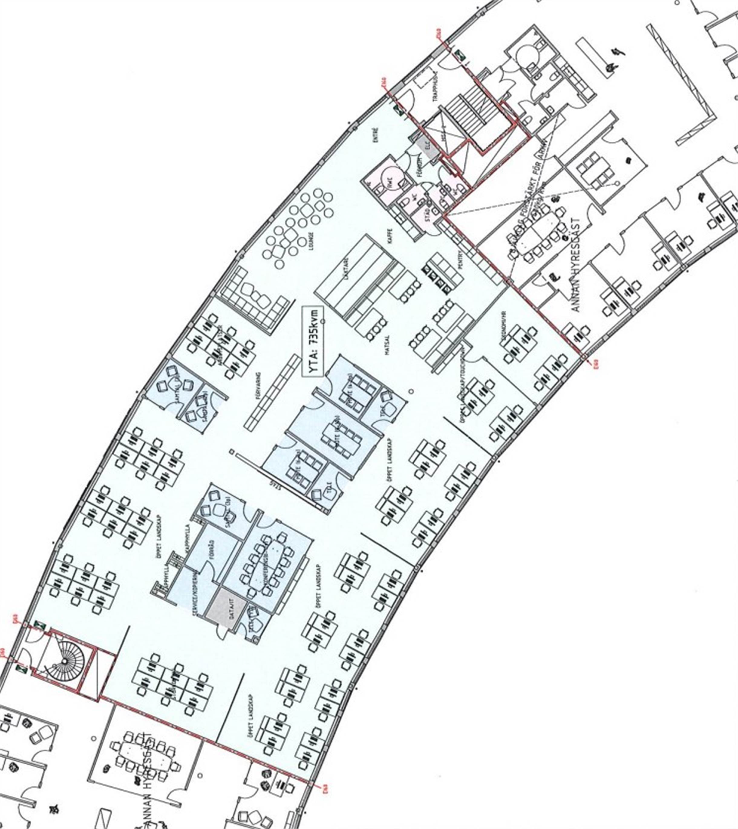 Övervägande del är öppet kontorslandskap. Ett separat kontor med ca 4 arbetsplatser.4st konferensrum, 3st telerum samt 3st samtalsrum. Gott om förvaringsmöjligheter.Trevligt pentry med en läktare som skapar delning av de öppna ytorna och inbjuder till spontana möten.