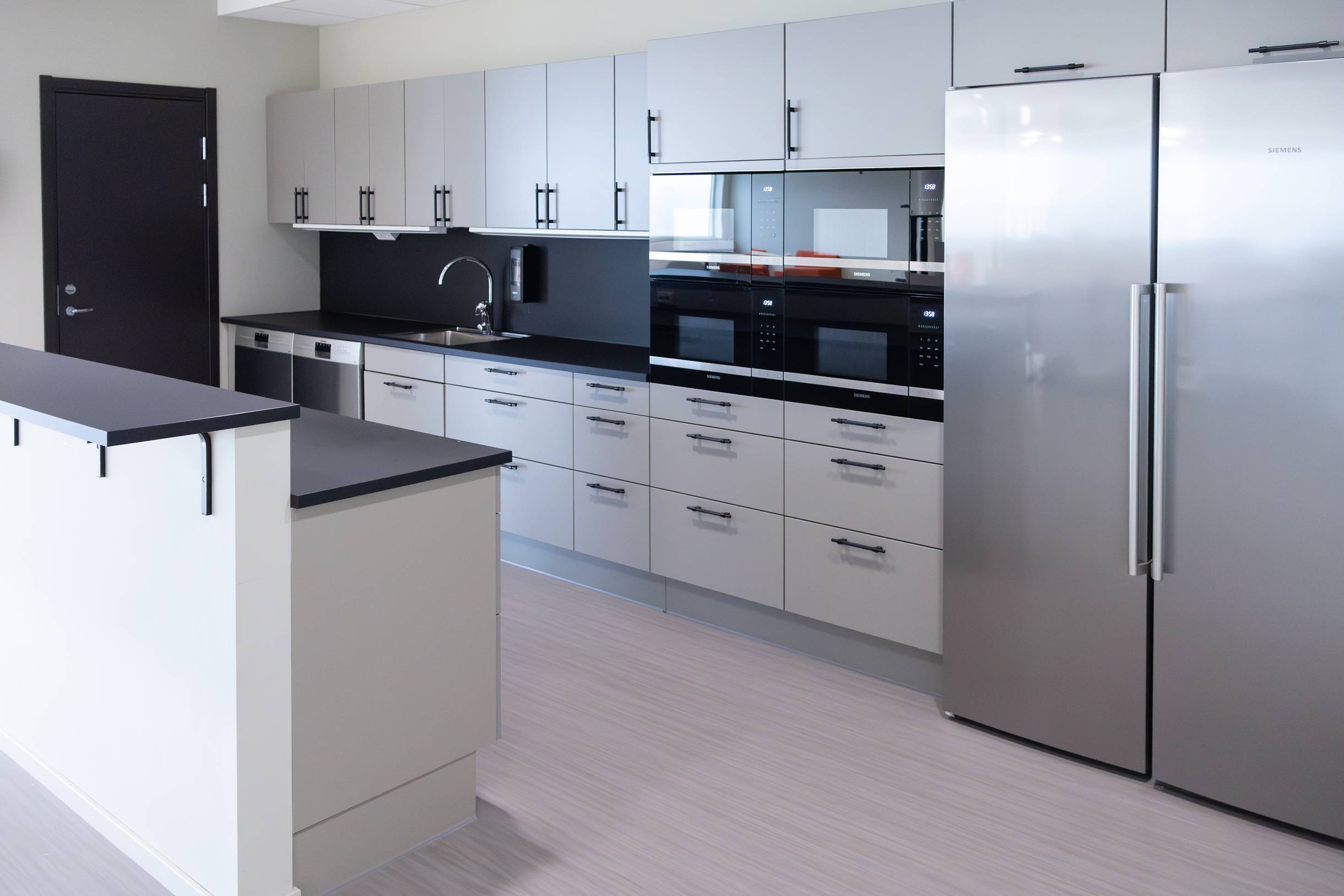 Goda förvaringsmöjligheter skapar ordning och struktur i vardagen, och det trevliga pentryt med tillhörande personalutrymme blir en naturlig samlingspunkt för pauser och informella möten.