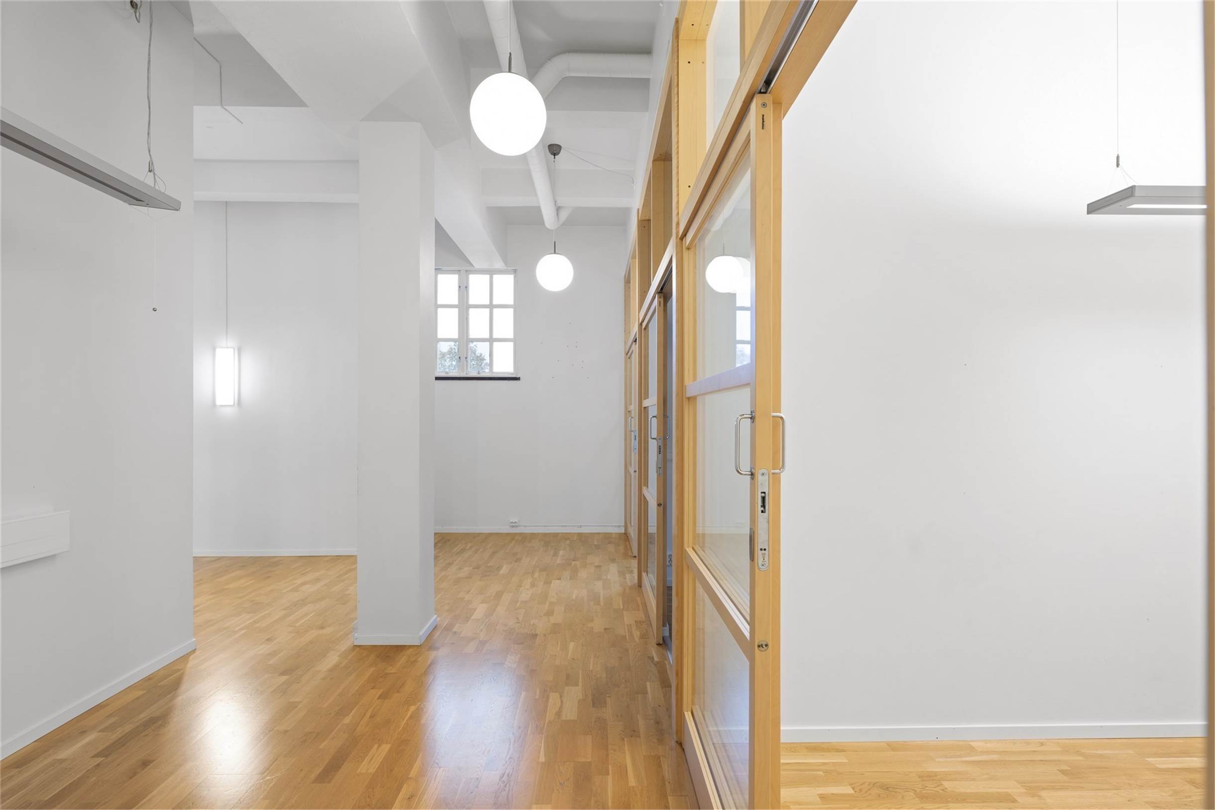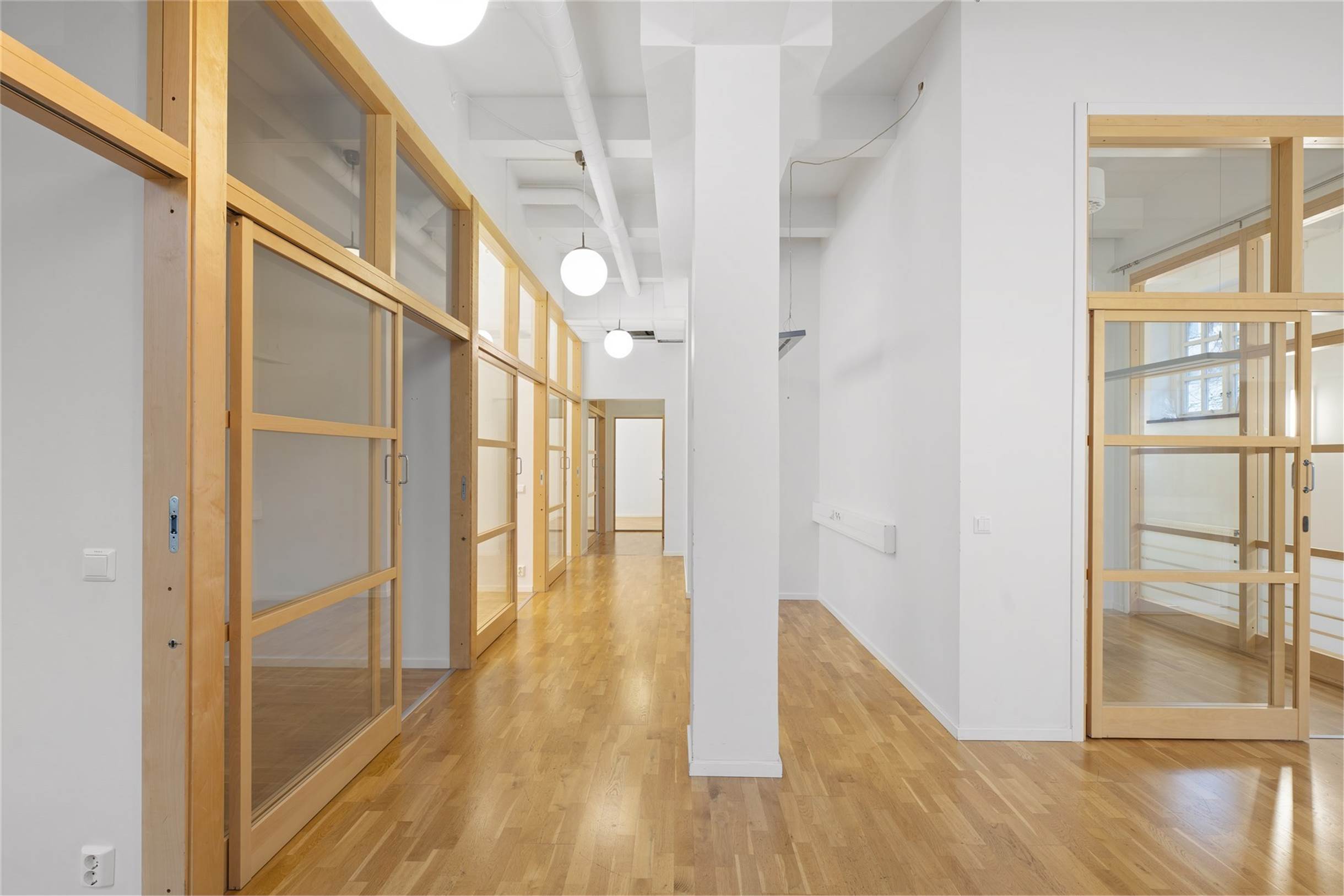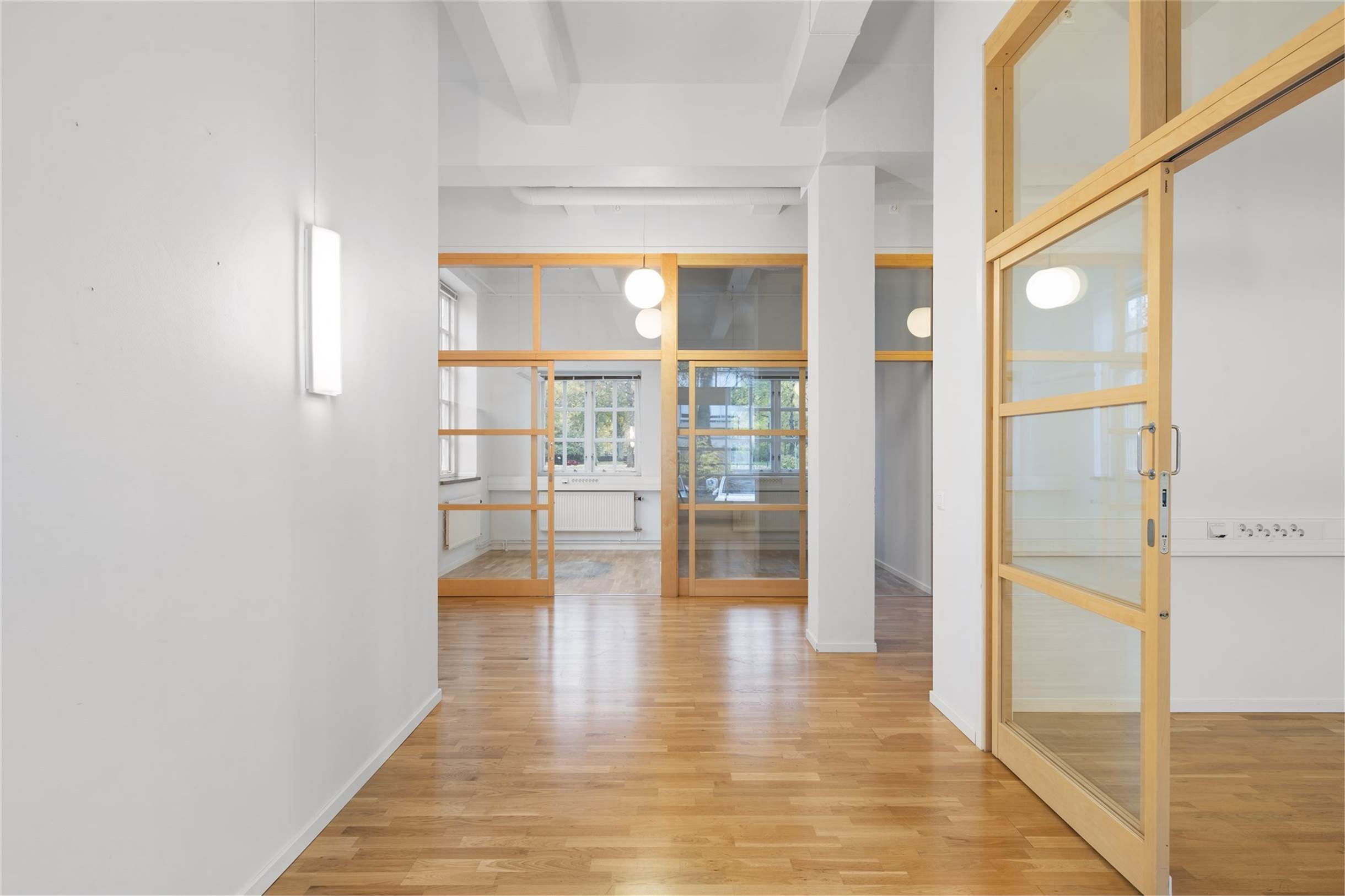 Kontoret är i två plan med en äldre charm i modern tappning. Genomgående ljusa ytskikt och en tilltalande planlösning med både separata kontor och kontorsrum där det går att sitta flera.