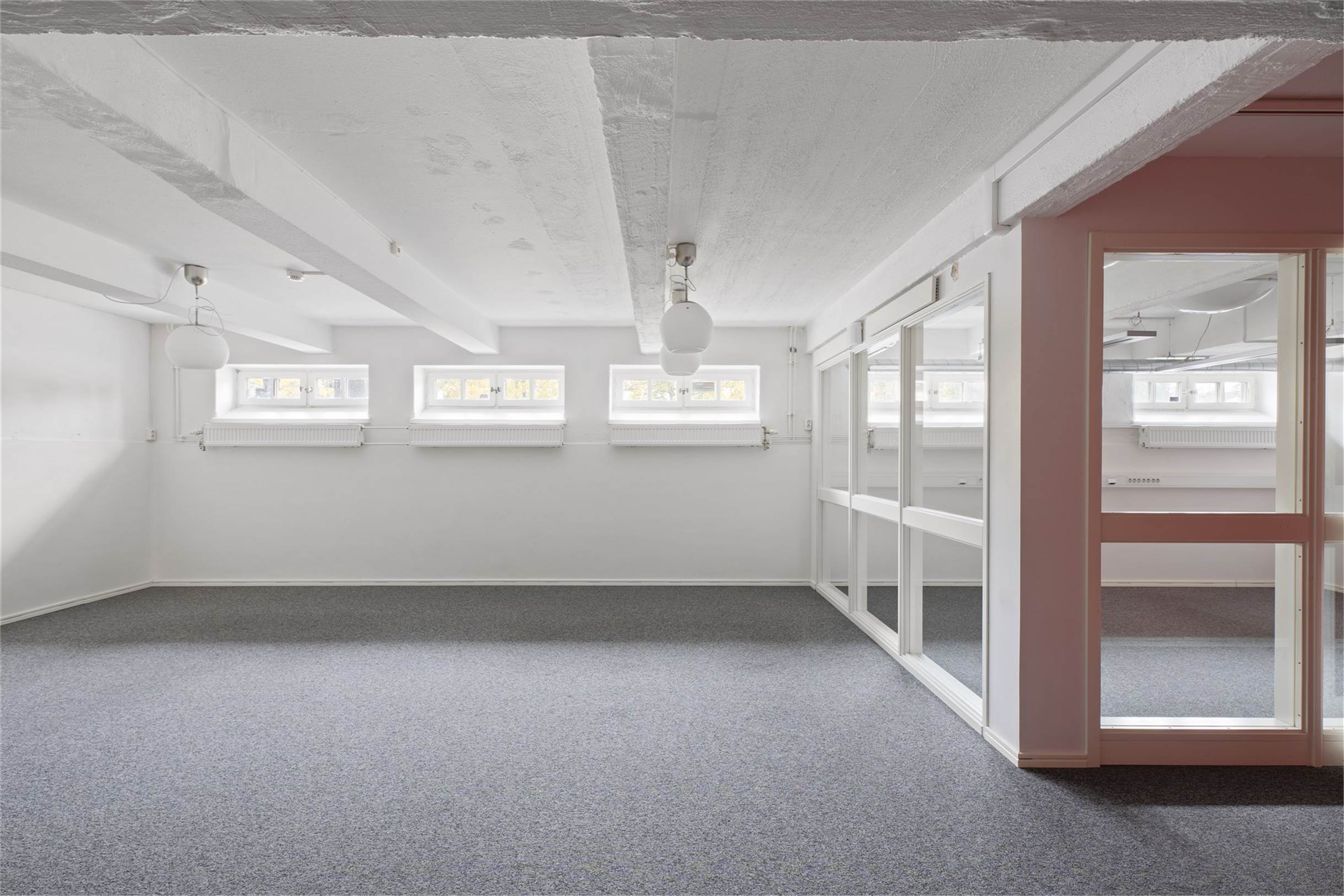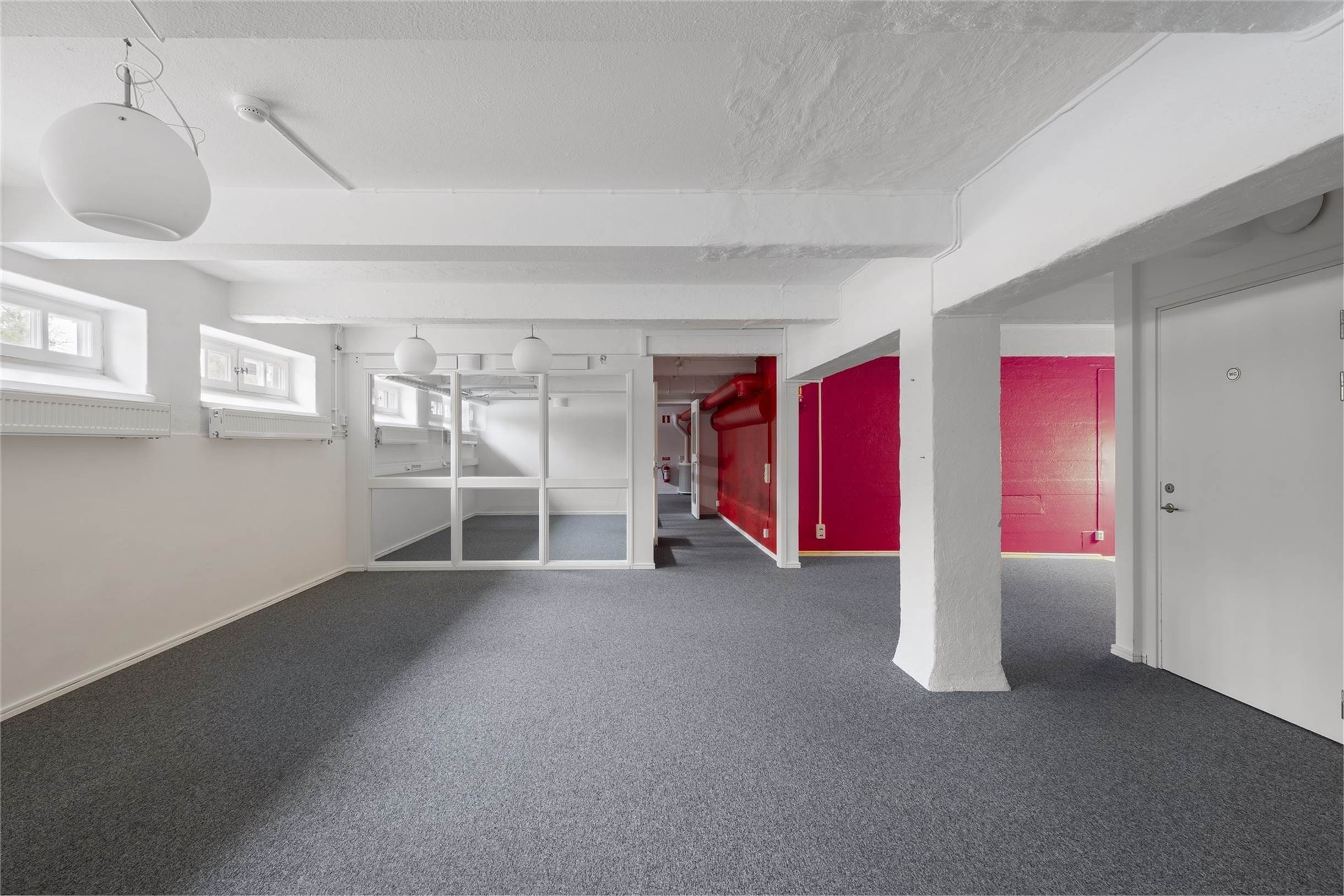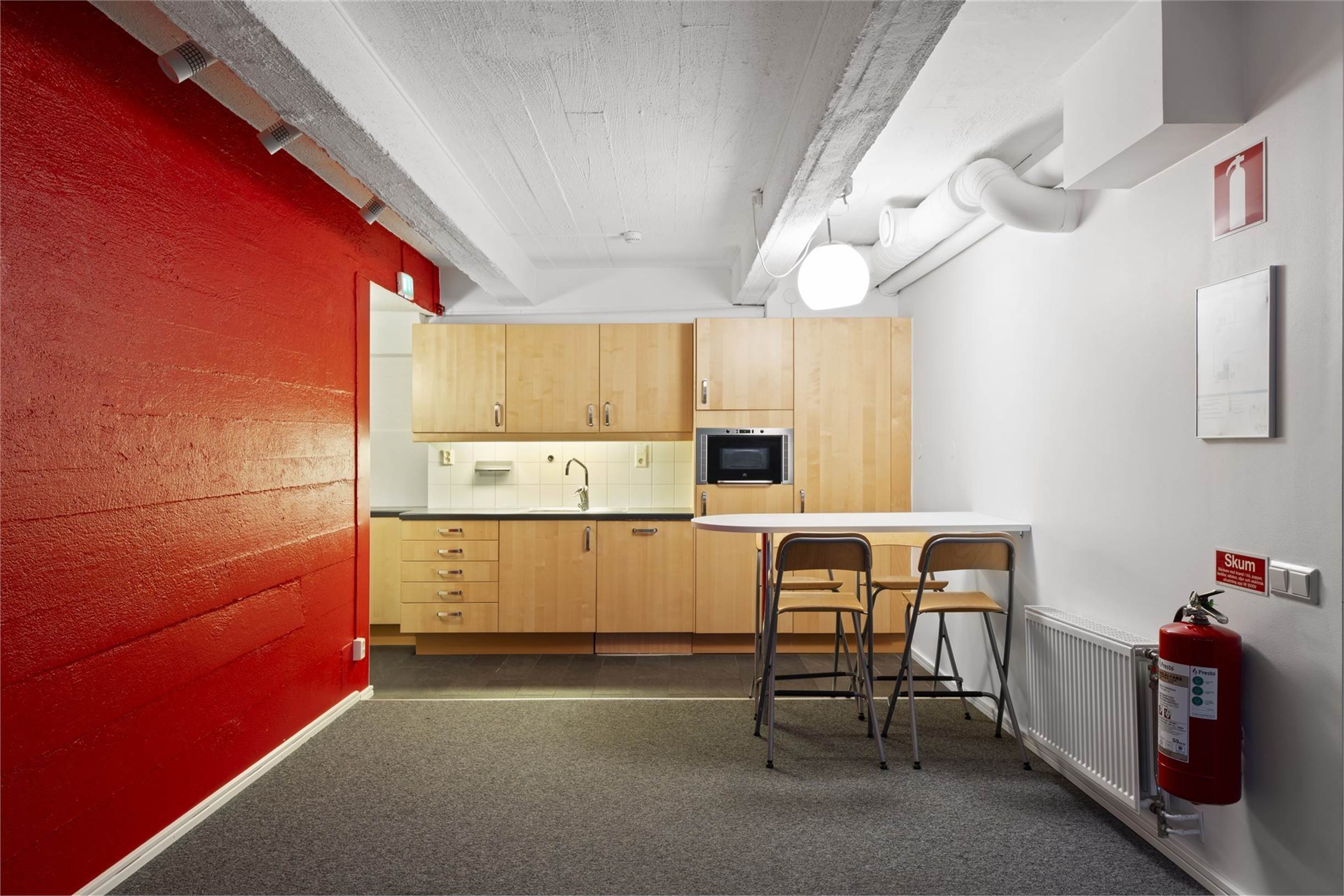 Lokalen om 228 kvm erbjuder på övre planet en hall med plats för ytterkläder och två toaletter. Vidare in i lokalen finns flera kontorsrum med en yta för soffgrupp i mitten. En trappa ner finns en större social yta med anslutande pentry. Här finn splats för både stort matbord och soffgrupp. Det finns även två större rum för flera arbetsplatser eller konferens samt bastu med dusch. Markplanet har en yta om 112 kvm och källarytan 116 kvm.