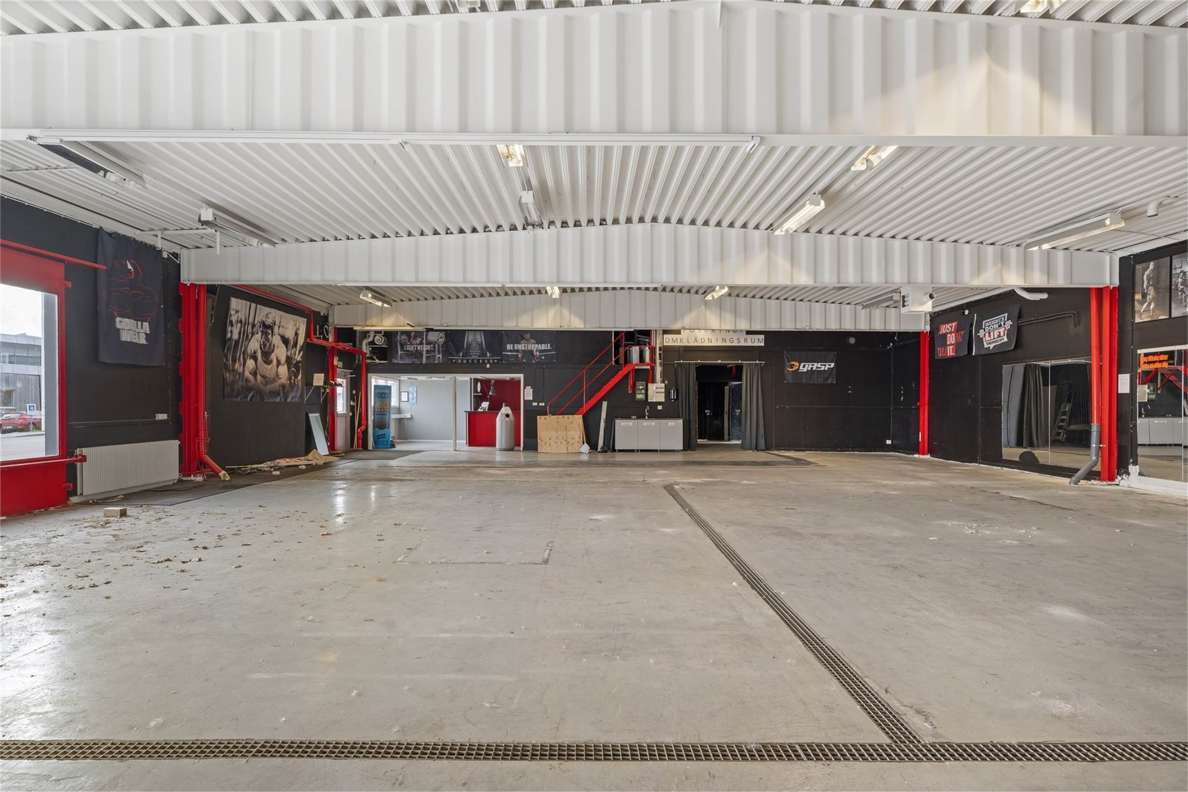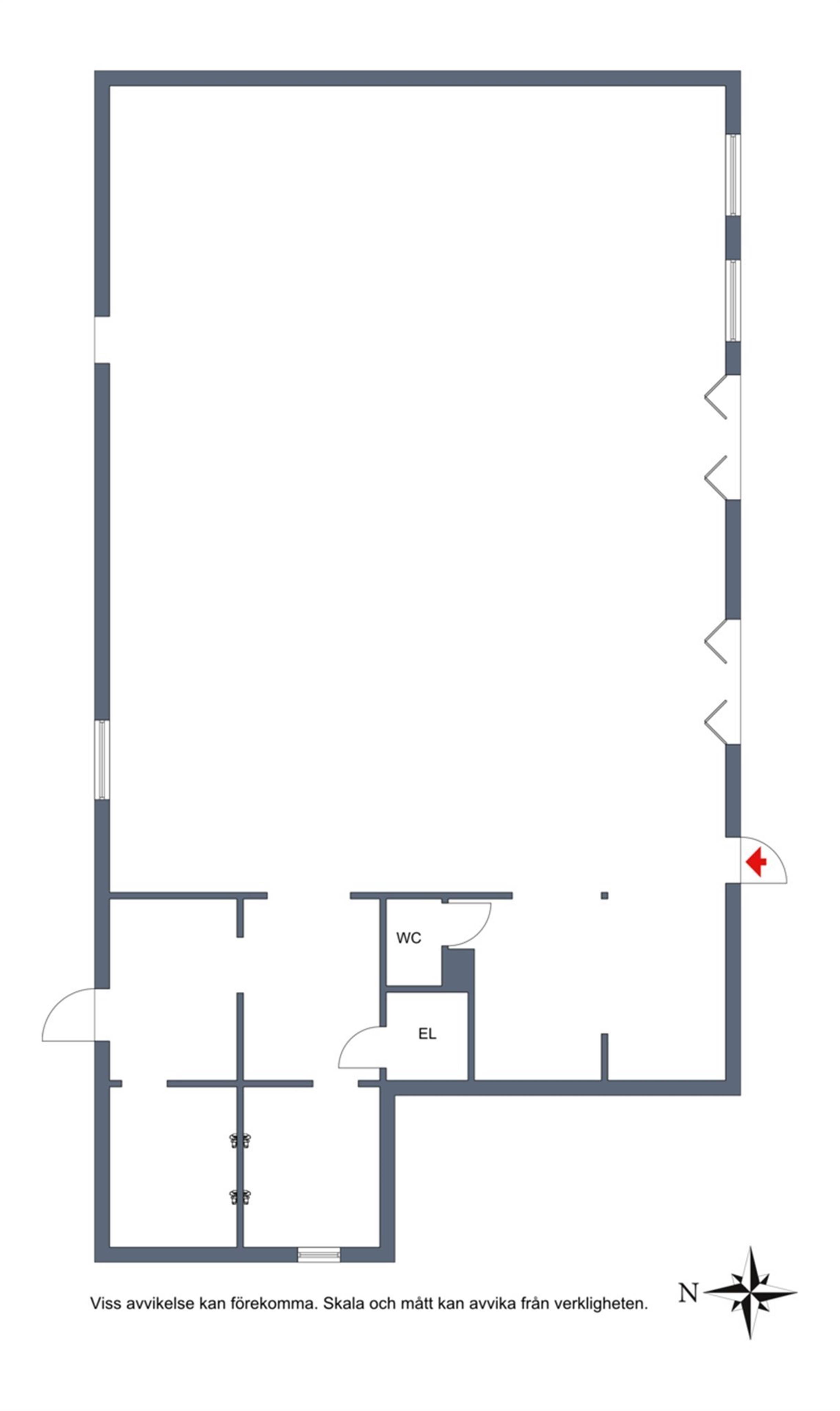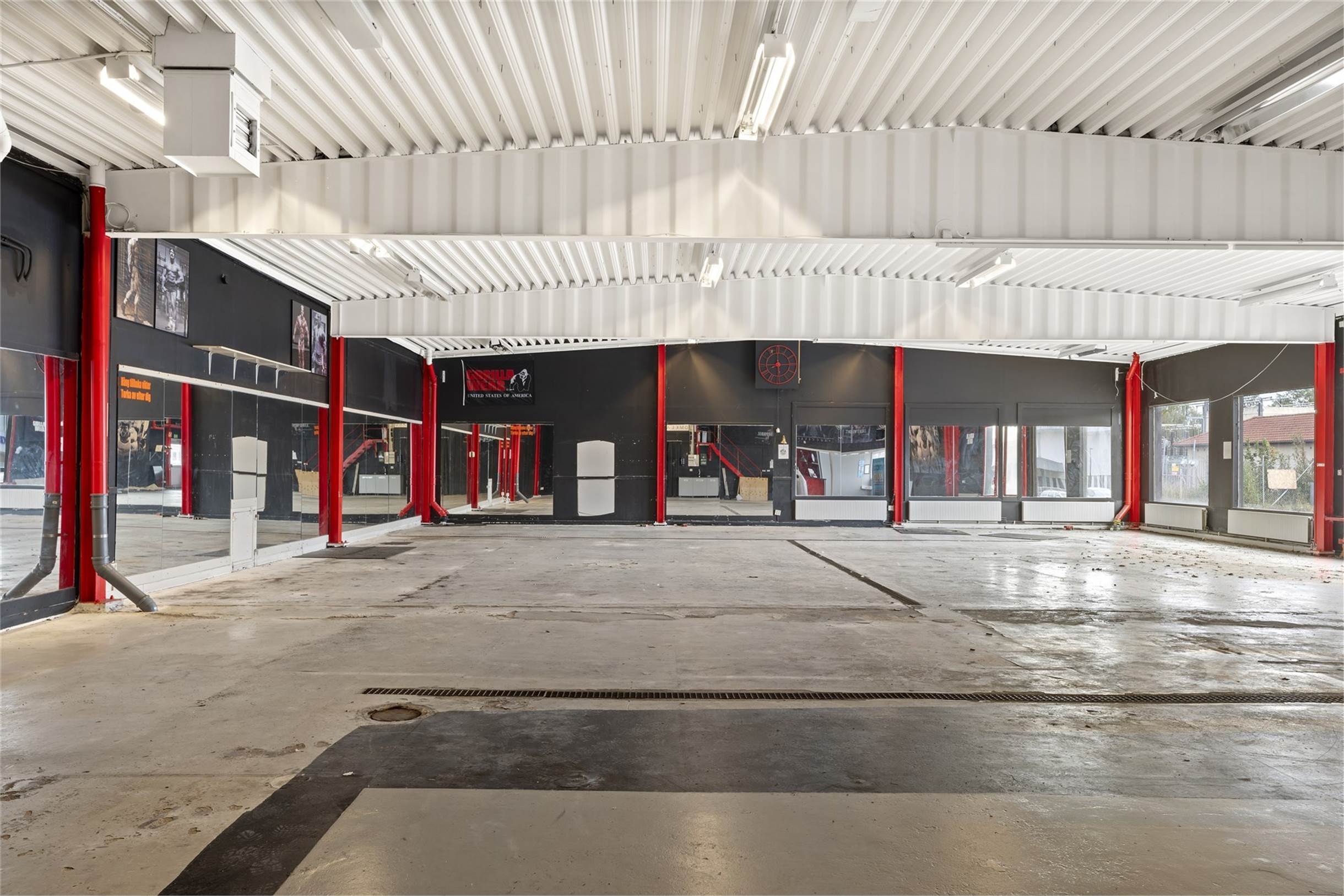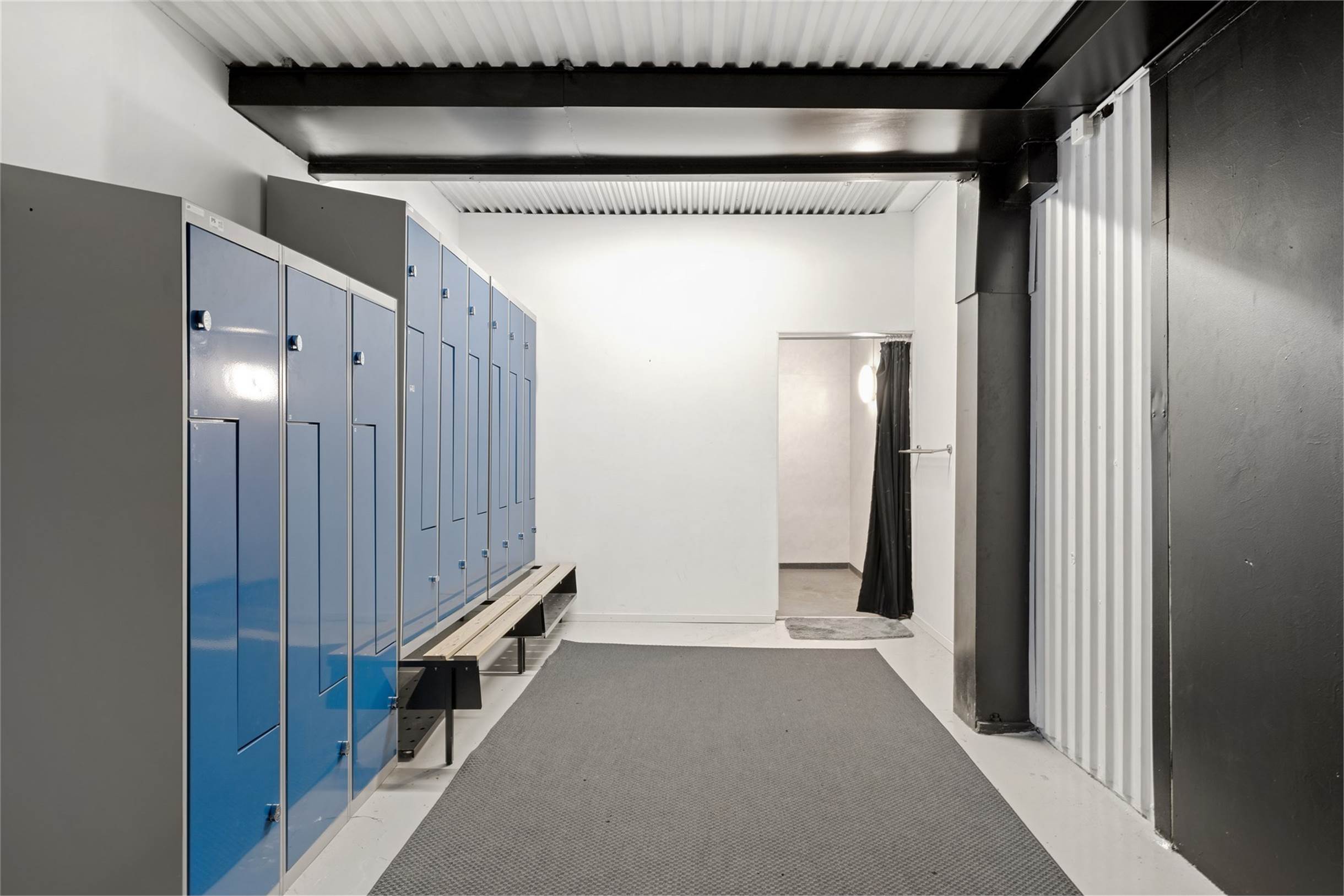 Den öppna ytan sträcker sig centralt i lokalen och lämpar sig utmärkt för butiksyta, showroom, open office, träningsverksamhet eller annan verksamhet. Längre in i lokalen finns praktiska personalutrymmen, inklusive rymliga omklädningsrum, duschmöjligheter samt WC. Dessa är smart placerade i anslutning till den mer privata delen av lokalen, vilket skapar en naturlig arbetszon avskild från kund/arbetsflödet.
