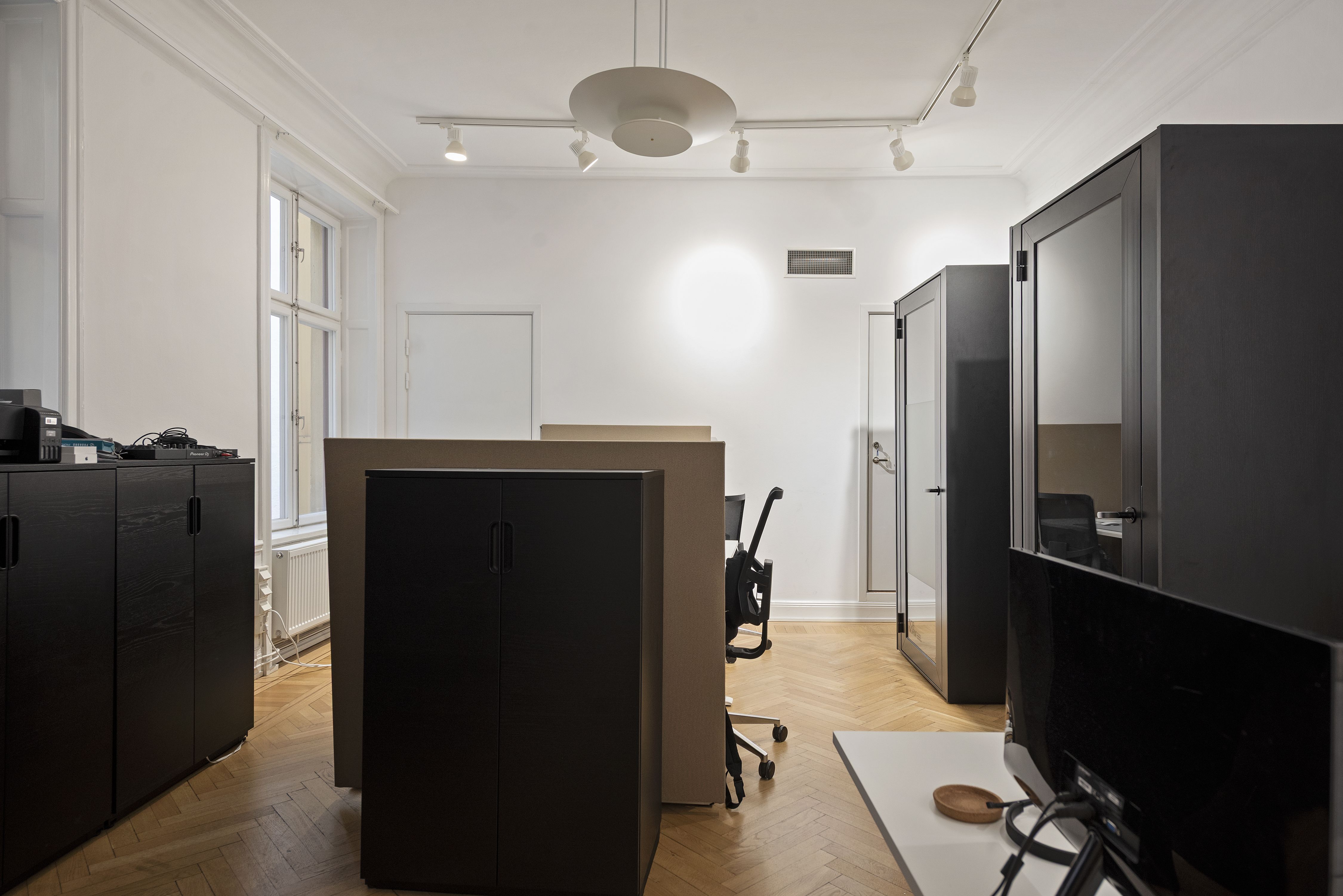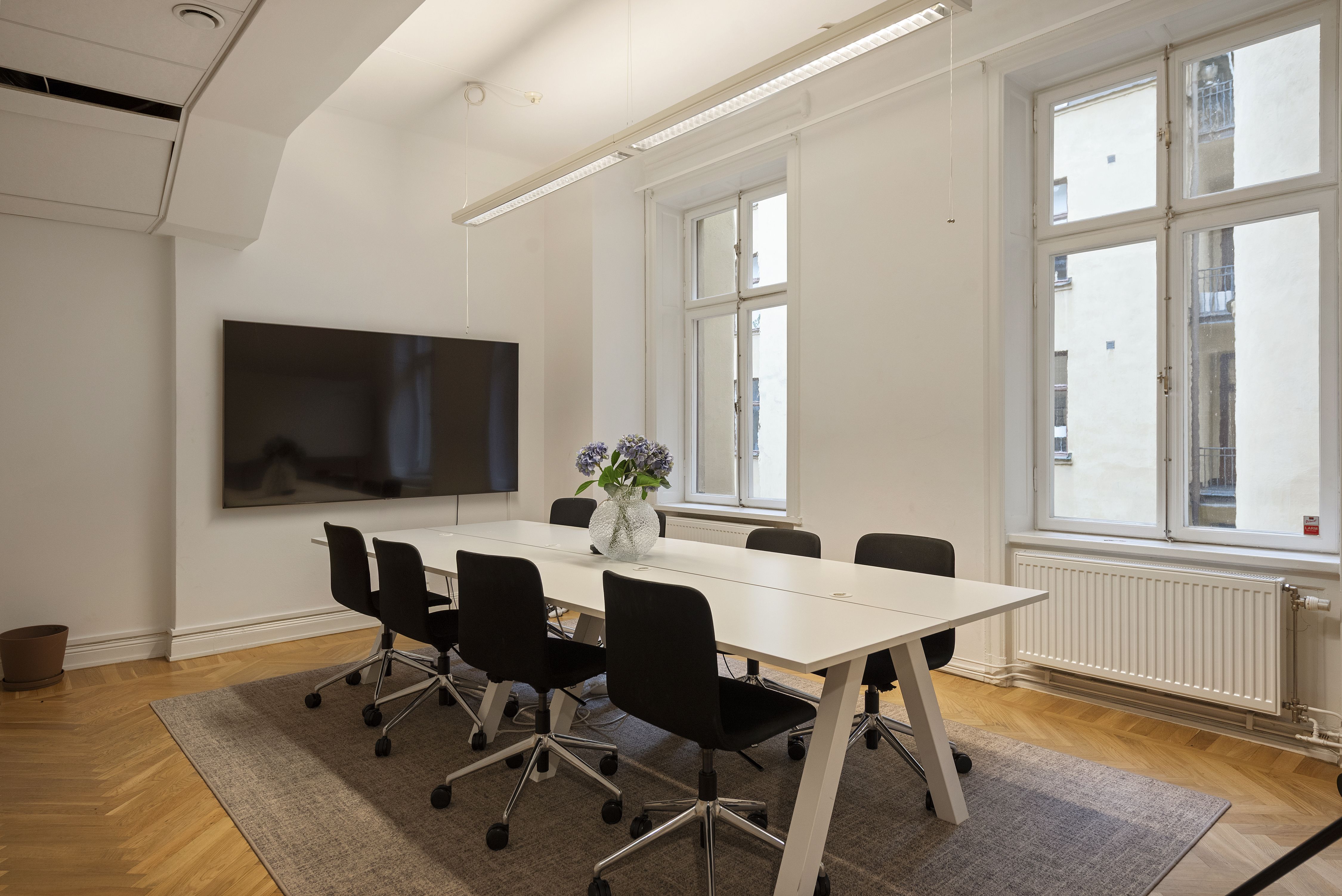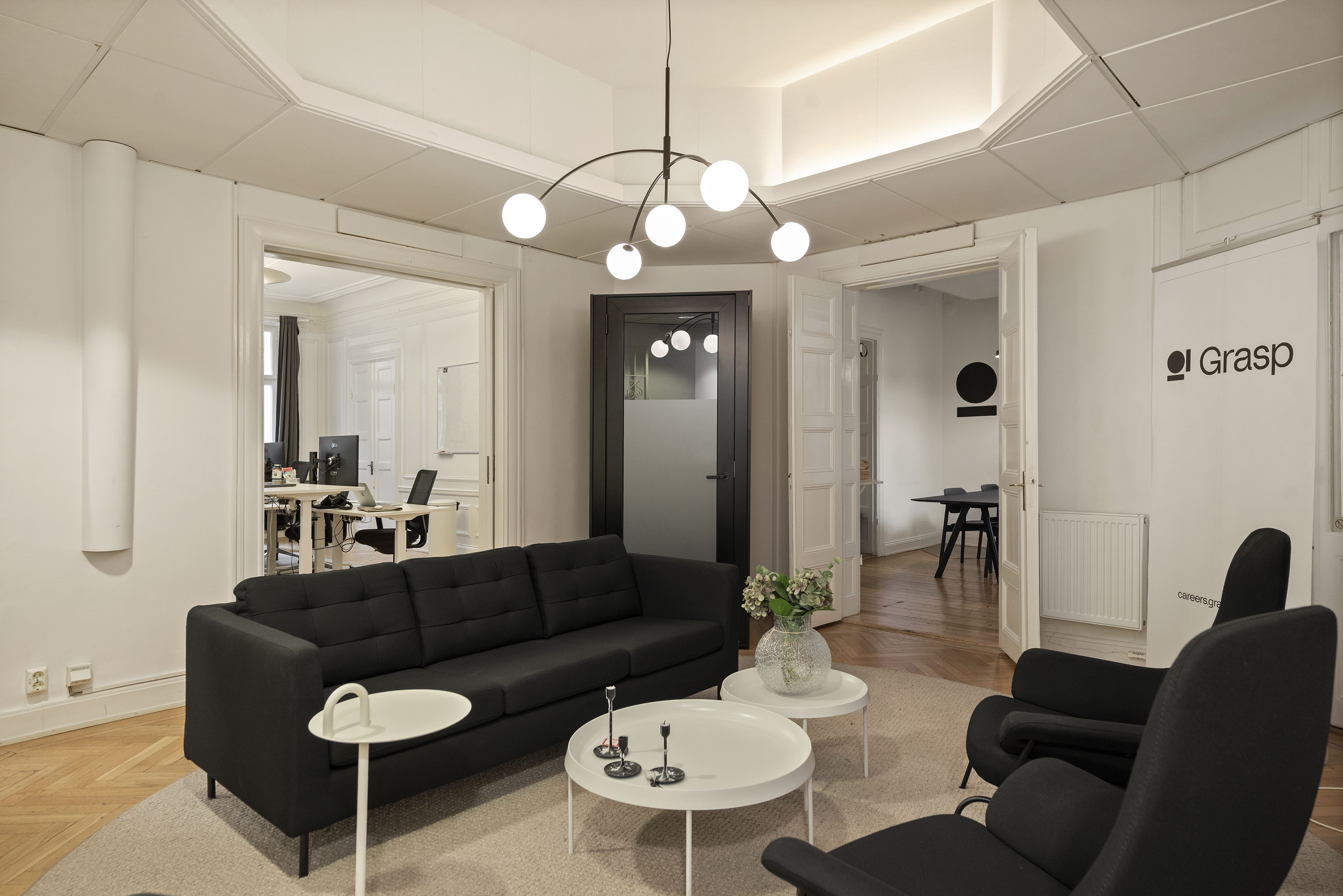 Lokalen ligger 2 tr upp i huset där du möts av en väldigt trevlig social yta med möjlighet till reception eller soffgrupp. Därefter har du rum i olika storlekar, totalt 5 st rum där man även har placerat ut samtalspoddar utöver detta. Pentryt har ett tillhörande utrymme perfekt för att samlas hela bolaget.