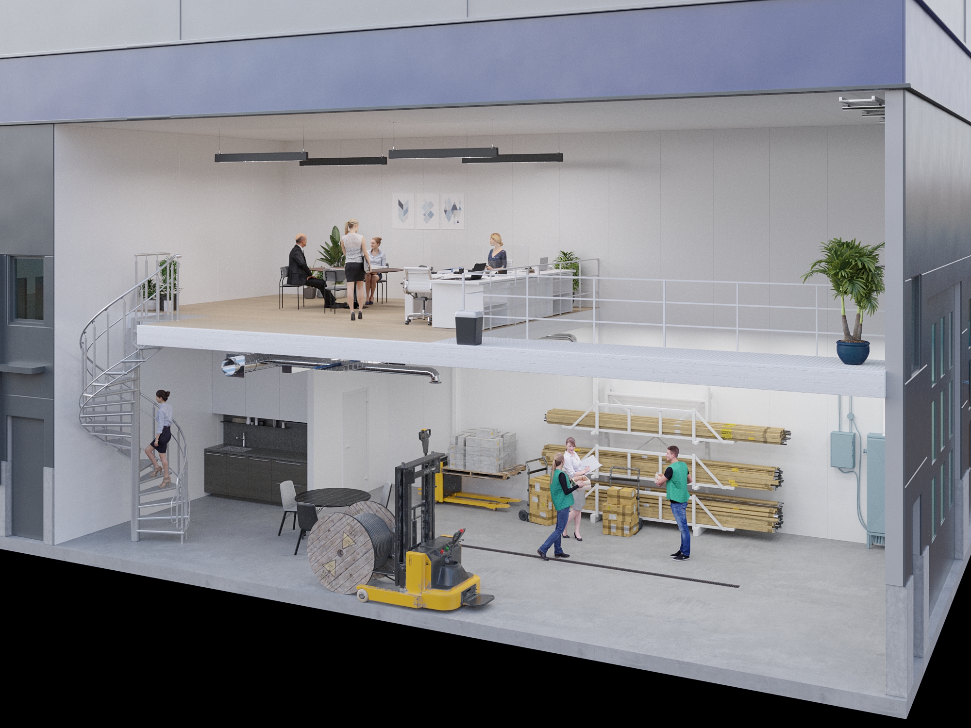 Öppen lageryta med tillhörande kontor på entresolplan.