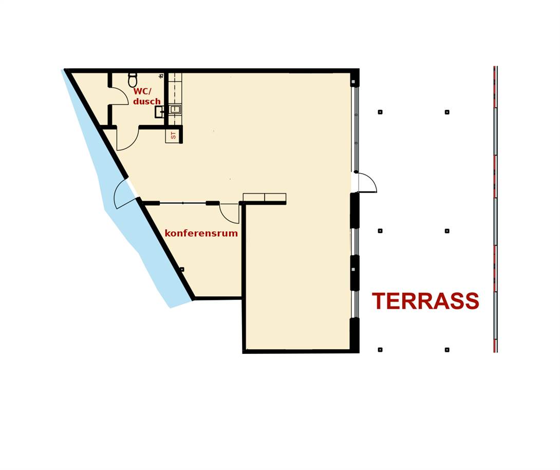 Planlösningen består av en större öppen yta plus en mindre öppen yta, konferensrum, pentry med kylskåp, diskmaskin och mikrougn, plus kaklad toalett med dusch (handikappanpassad) plus städutrymme. Se skiss.