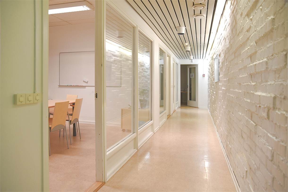 Planlösningen består av en stor öppen yta, fem kontorsrum, förråd, kök och handikappanpassad toalett.