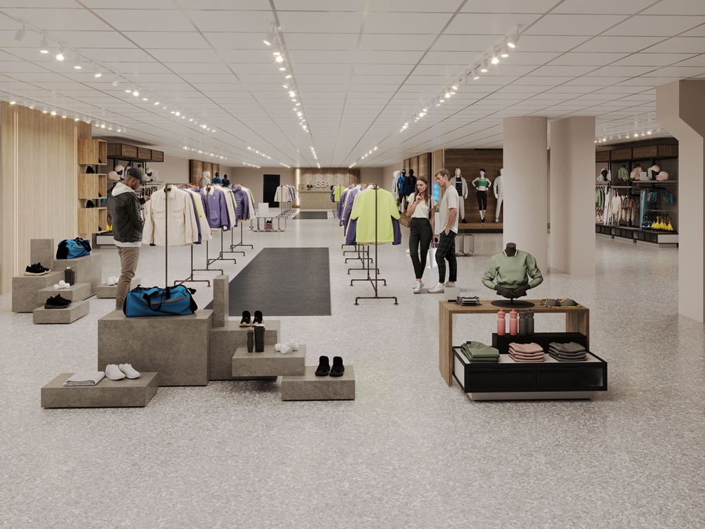 Lokalen inrymmer idag stor öppen yta samt flera förråd, kontor, kök, omklädningsrum och wc.