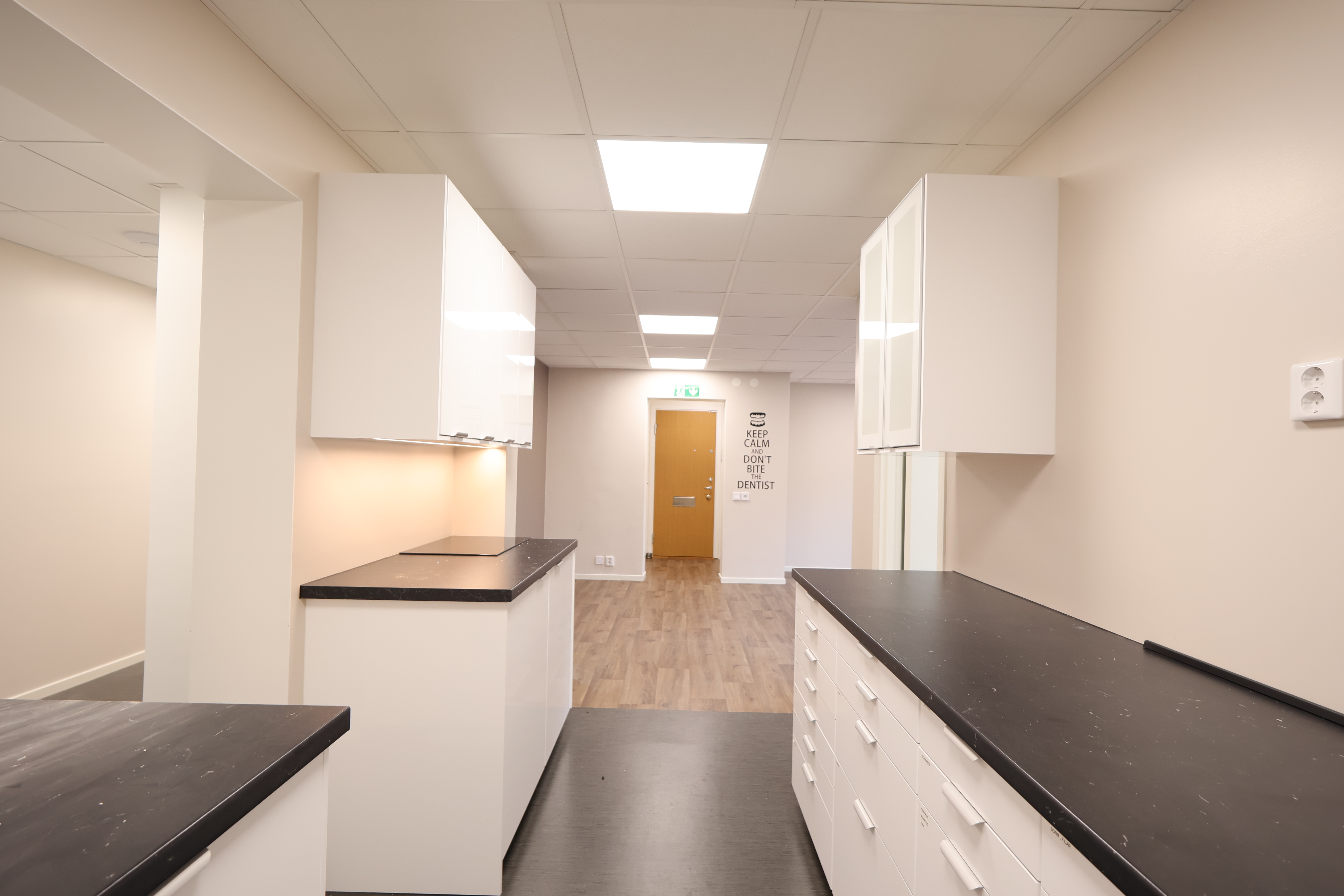 Ytorna är idag rumsindelade, vilket skapar lugna arbets- och mottagningsmiljöer, men kan med fördel anpassas för att möta just er verksamhets behov. Här finns även ett trevligt pentry med plats för sittande personal – perfekt för pauser och enklare måltider.