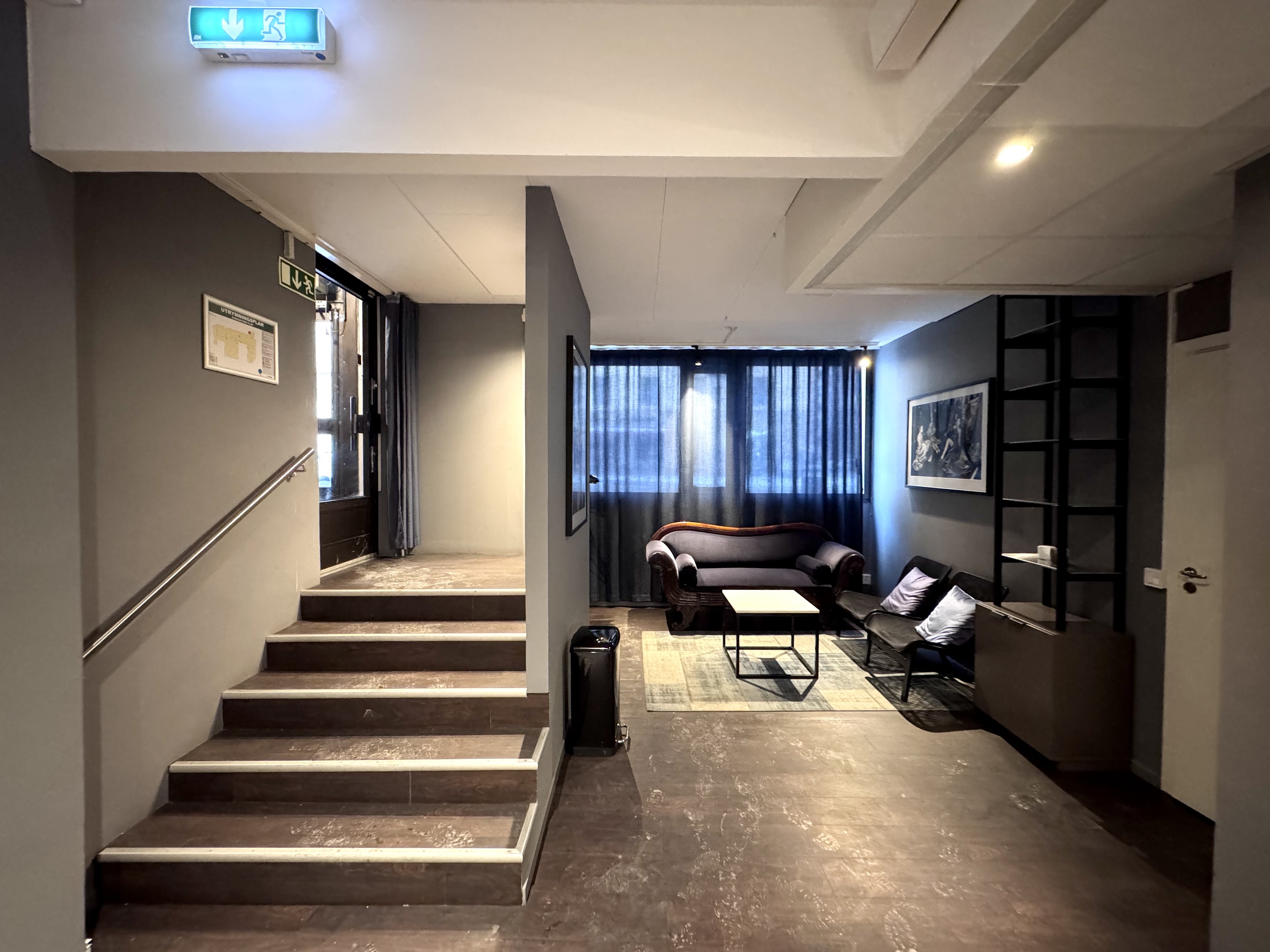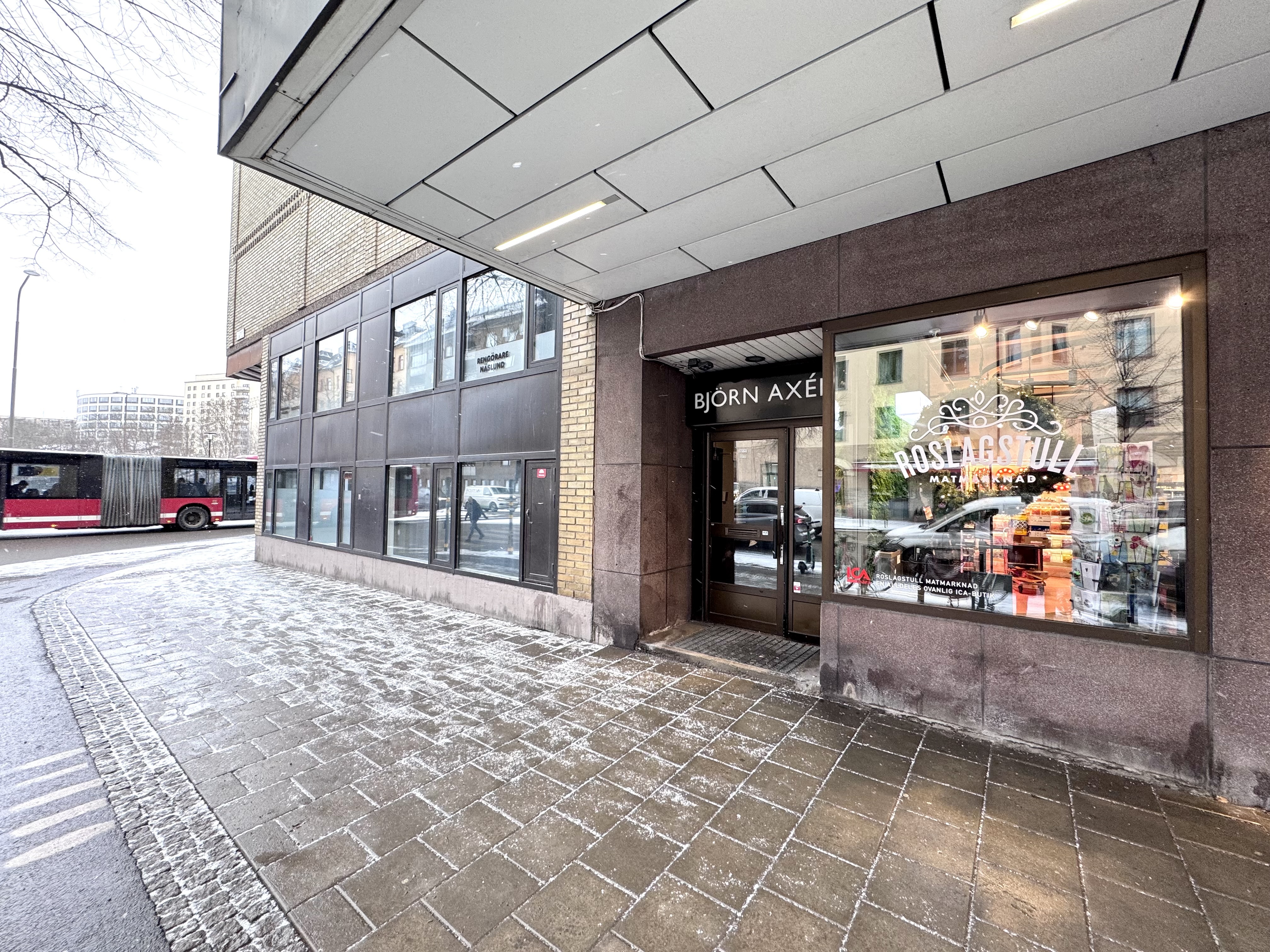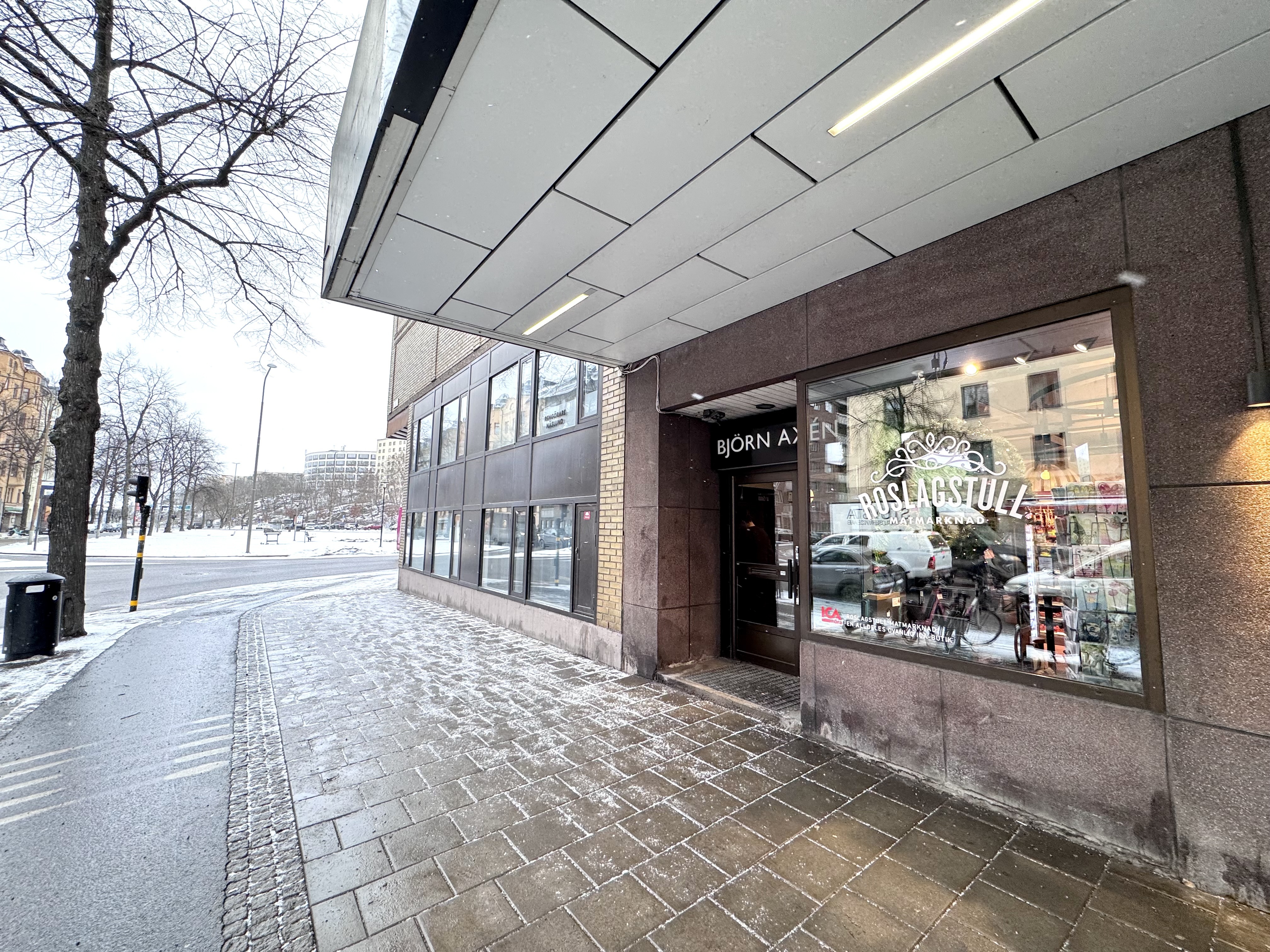 Egen ingång från Birger Jarlsgatan med några trappsteg ned, och hiss från bostadsporten påIngemarsgatan 1B.