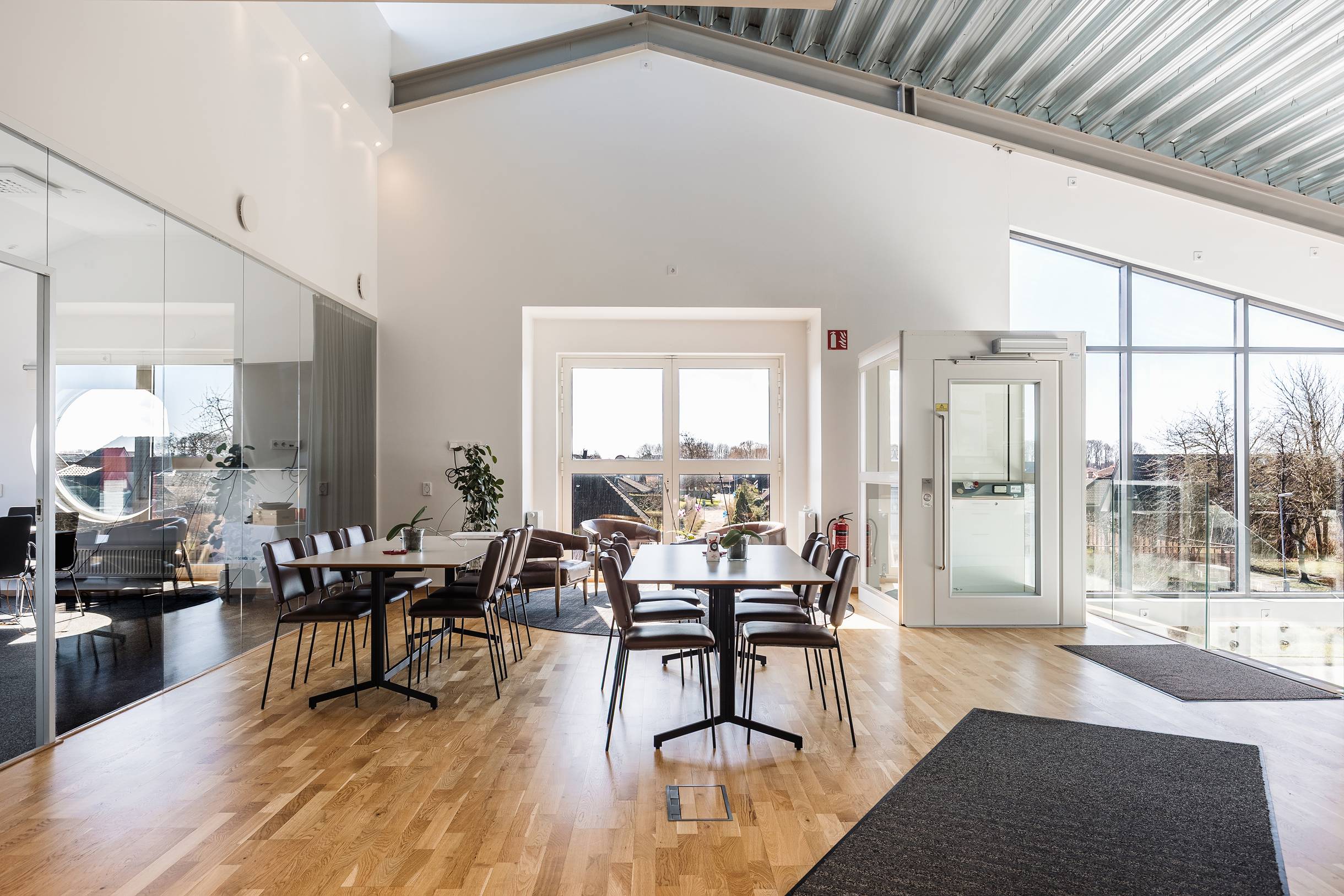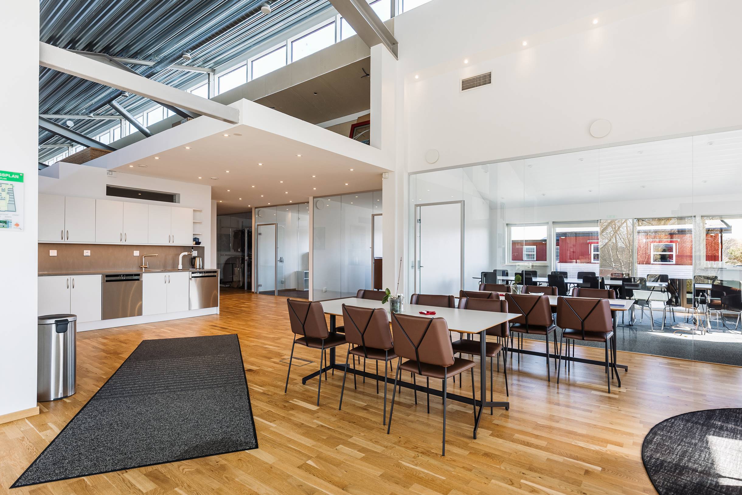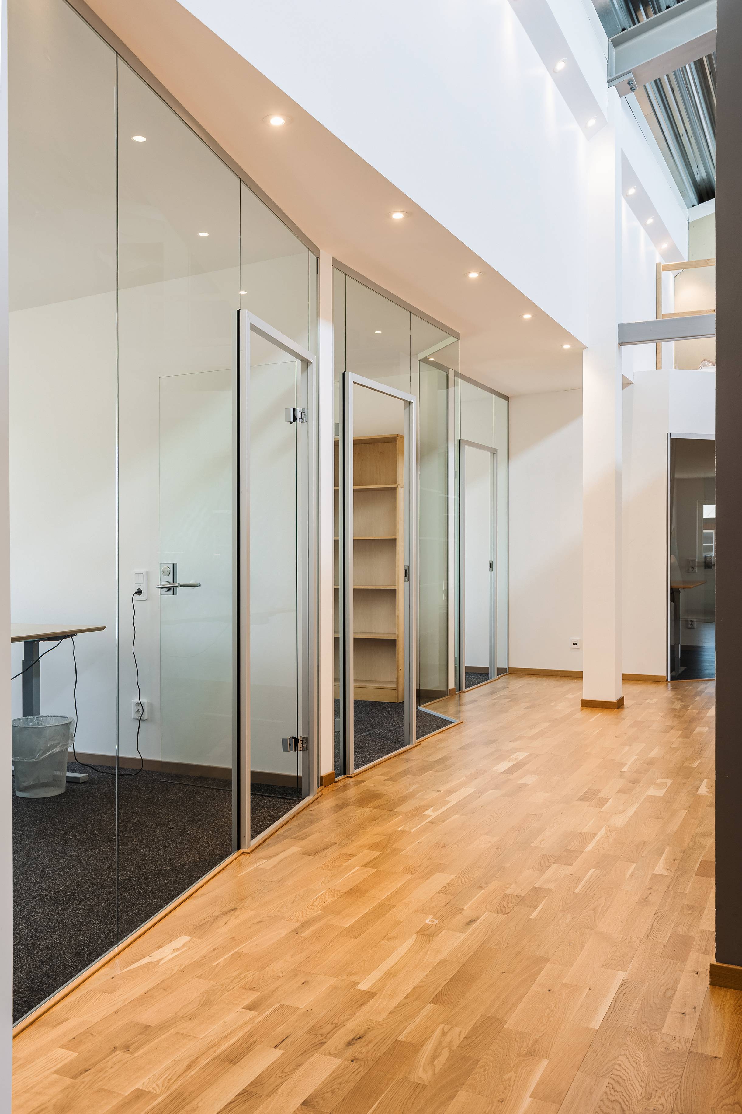 Kontorsytorna är ljusa och välplanerade med en kombination av enskilda rum och mötesrum. Glaspartierna ger ett modernt intryck och släpper in fint med dagsljus, vilket skapar en öppen och behaglig arbetsmiljö. Här finns även en lounge-/pausyta med tillhörande kök – en naturlig samlingspunkt för både interna möten och sociala stunder.