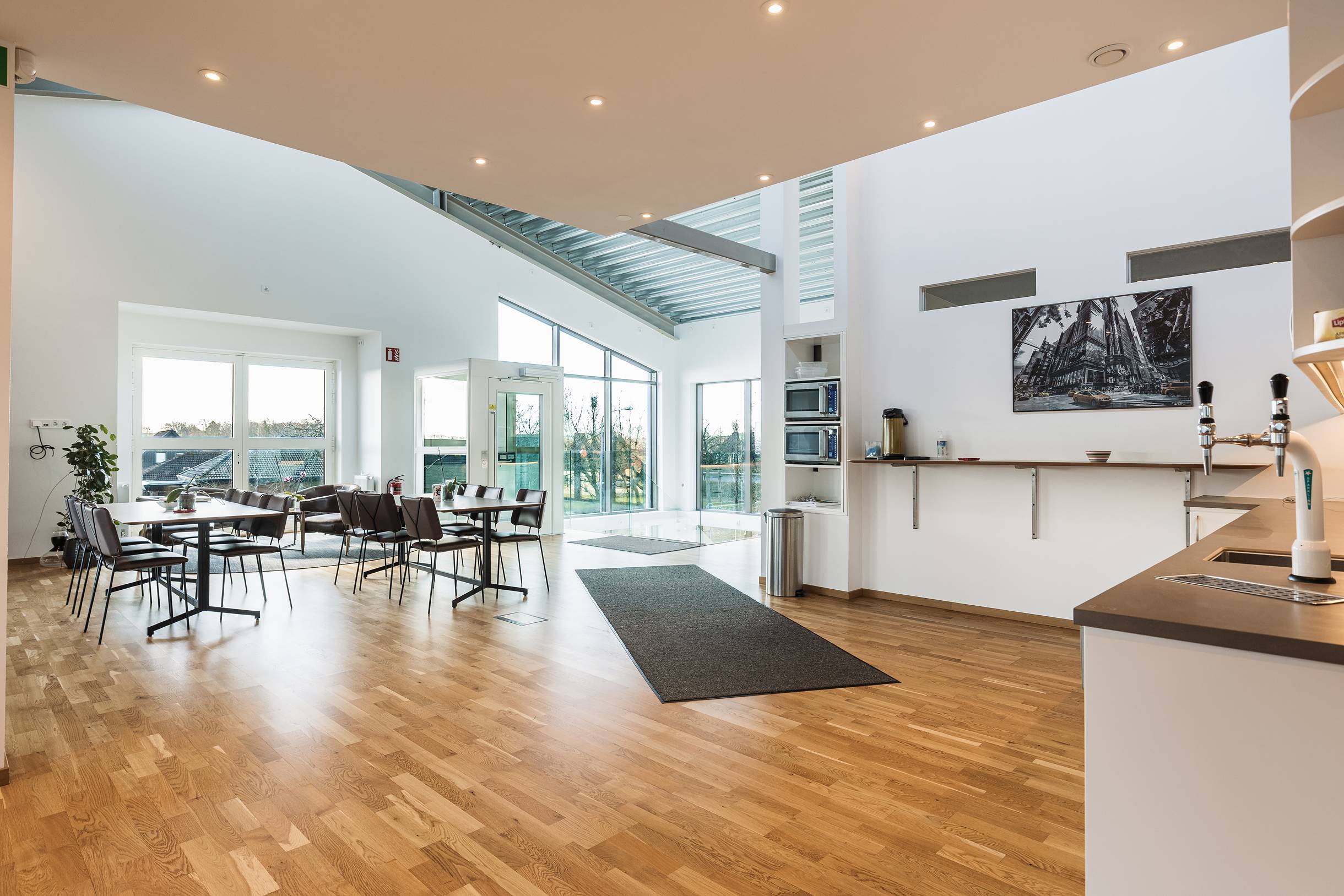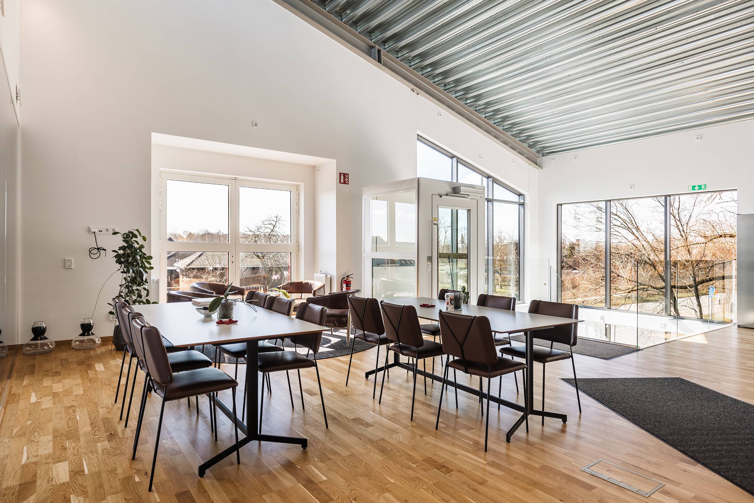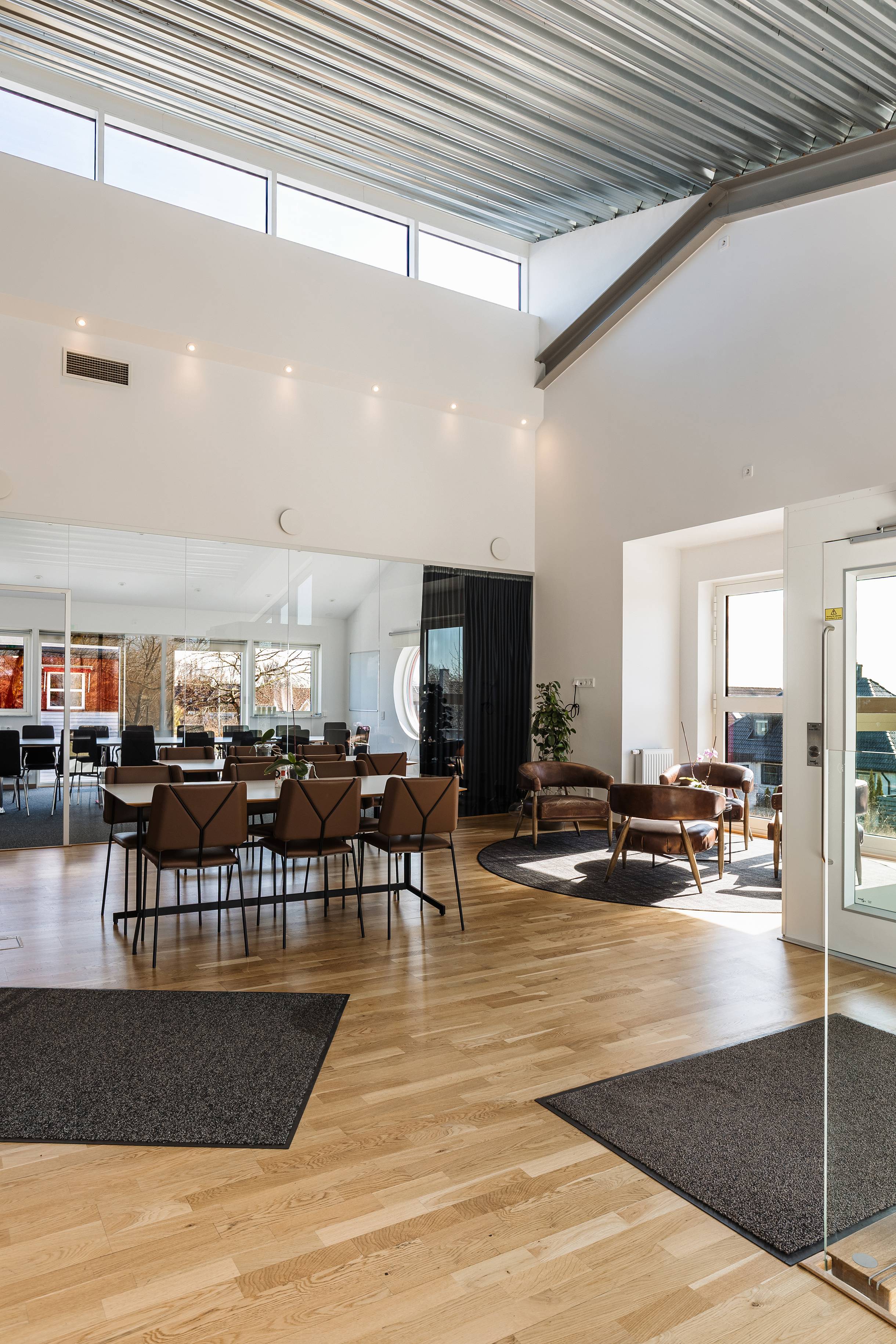 Kontorsytorna är ljusa och välplanerade med en kombination av enskilda rum och mötesrum. Glaspartierna ger ett modernt intryck och släpper in fint med dagsljus, vilket skapar en öppen och behaglig arbetsmiljö. Här finns även en lounge-/pausyta med tillhörande kök – en naturlig samlingspunkt för både interna möten och sociala stunder.
