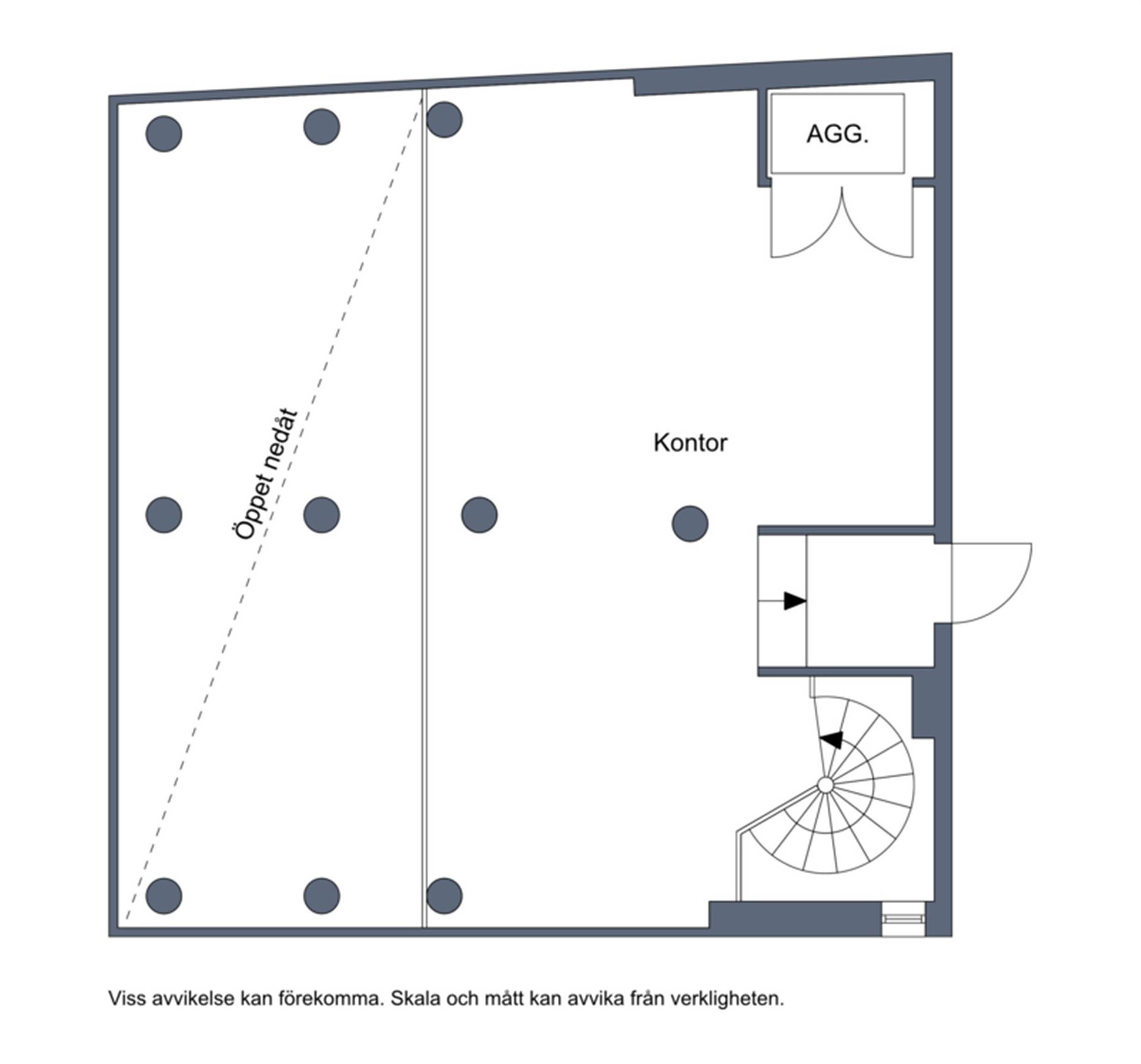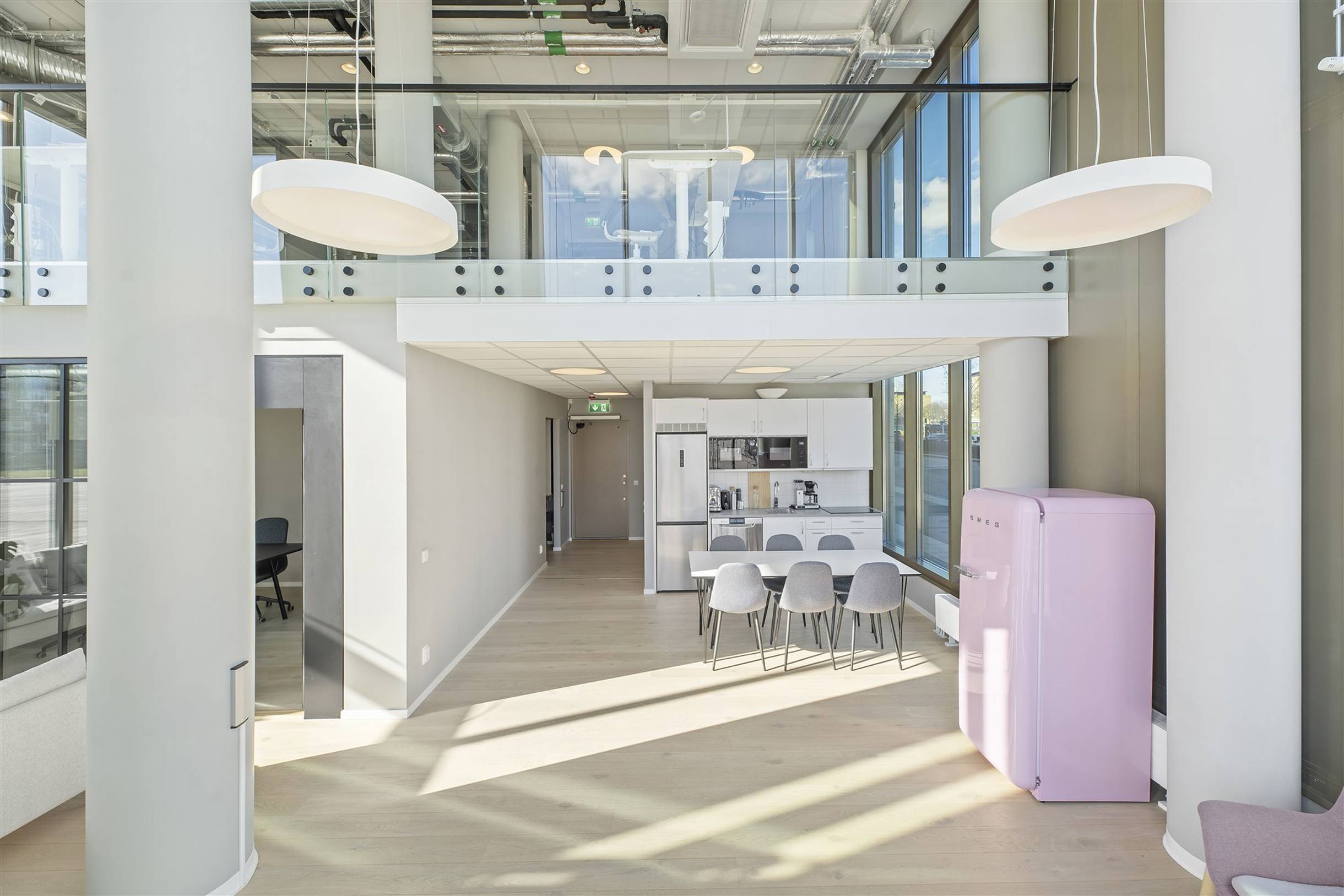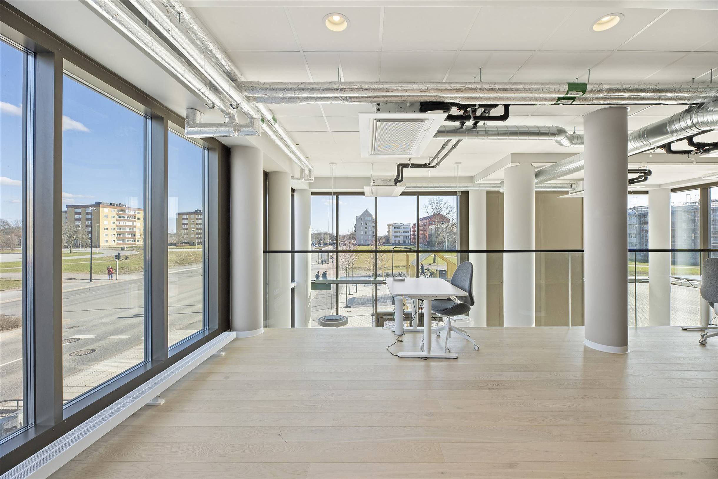 Det övre planet omfattar 55 kvm och har en öppen planlösning med utsikt ner mot entréplanet. Ytan lämpar sig för flera arbetsplatser. Lokalen har genomgående moderna ytskikt och ett generöst ljusinsläpp från stora fönsterpartier.