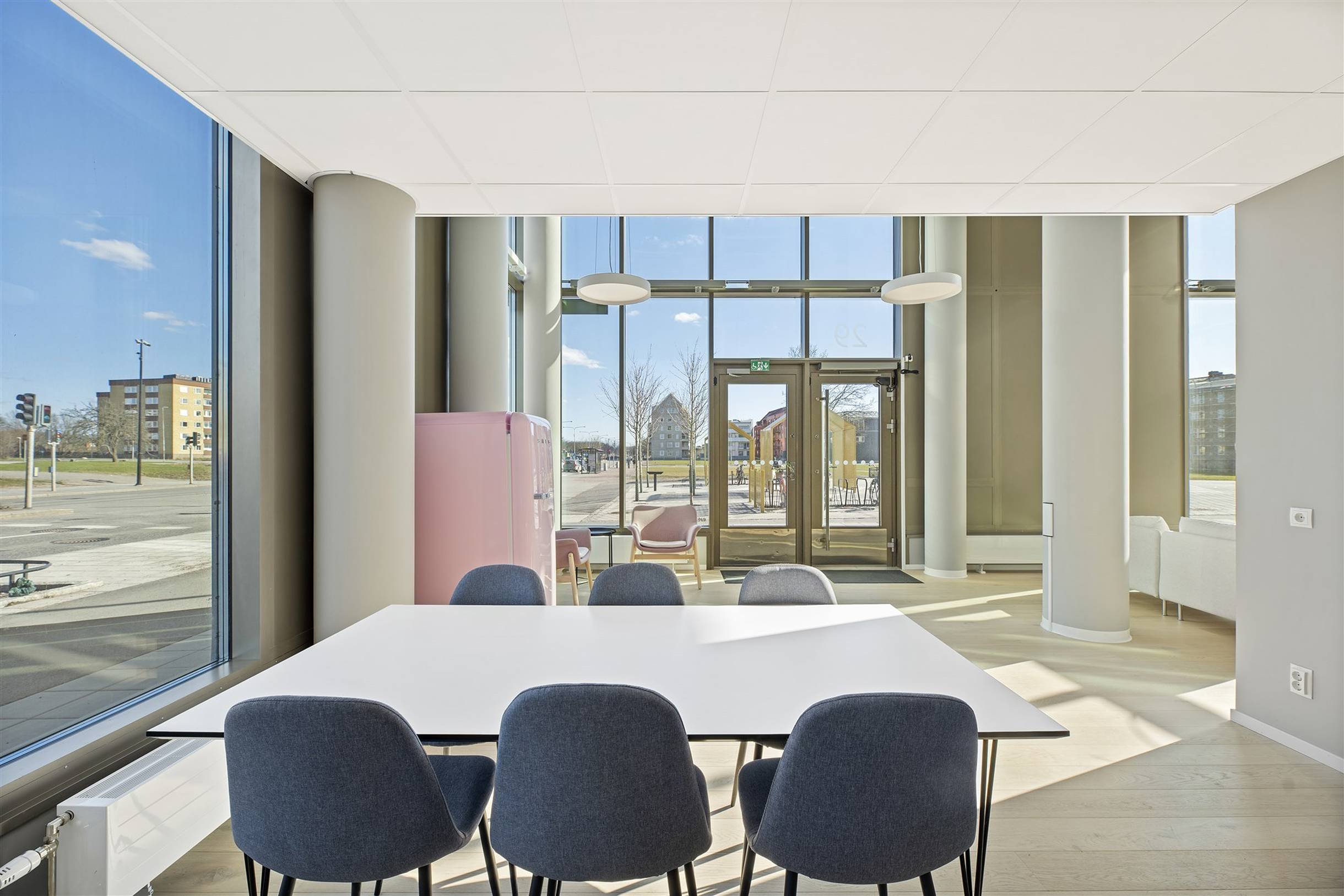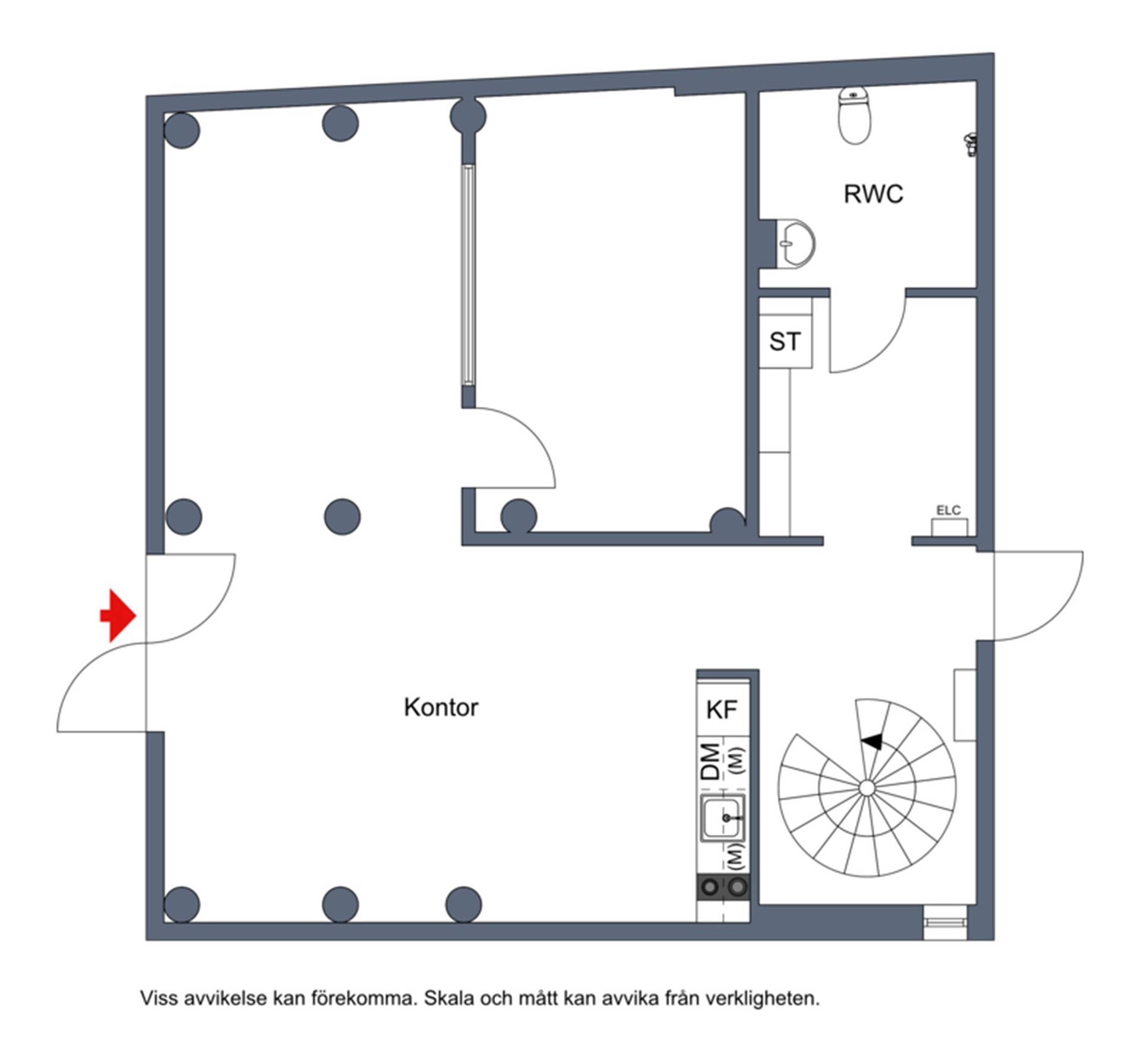 Entréplanet omfattar 86 kvm och rymmer en receptionsyta samt ett konferensrum med industriglasväggar. På entréplanet finns även ett pentry som är utrustat med kyl och frys, spishäll, diskmaskin och mikrovågsugn. Vidare finns en RWC, goda förvaringsmöjligheter samt avsedd plats för skrivare. En spiraltrappa förbinder entréplanet med det övre planet.