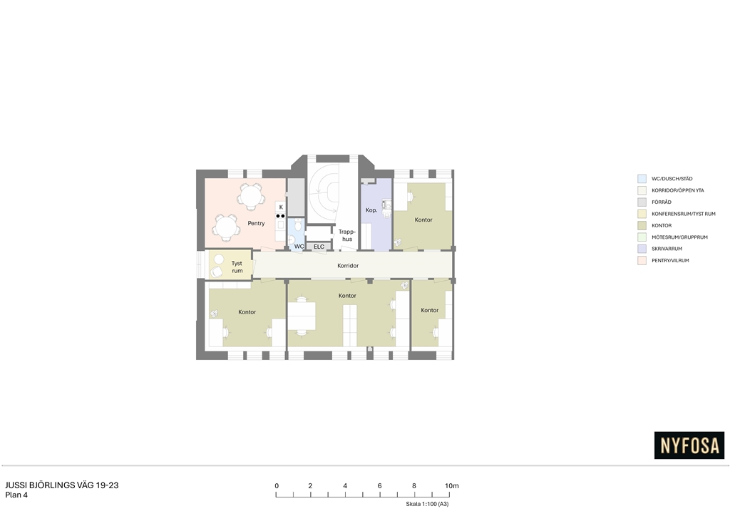 Lokalen har en flexibel planlösning som enkelt kan anpassas efter verksamhetens behov och strolek. Här finns möjlighet att skapa både öppna kontorslandskap och enskilda arbetsrum, liksom mötes- och konferensytor i varierande storlek. Lokalerna har generösa fönsterpartier som ger ett fint ljusinsläpp och skapar en trivsam arbetsmiljö. Tack vare planlösningens utformning kan ytorna effektivt nyttjas och skräddarsys för att passa allt från mindre företag till större organisationer.