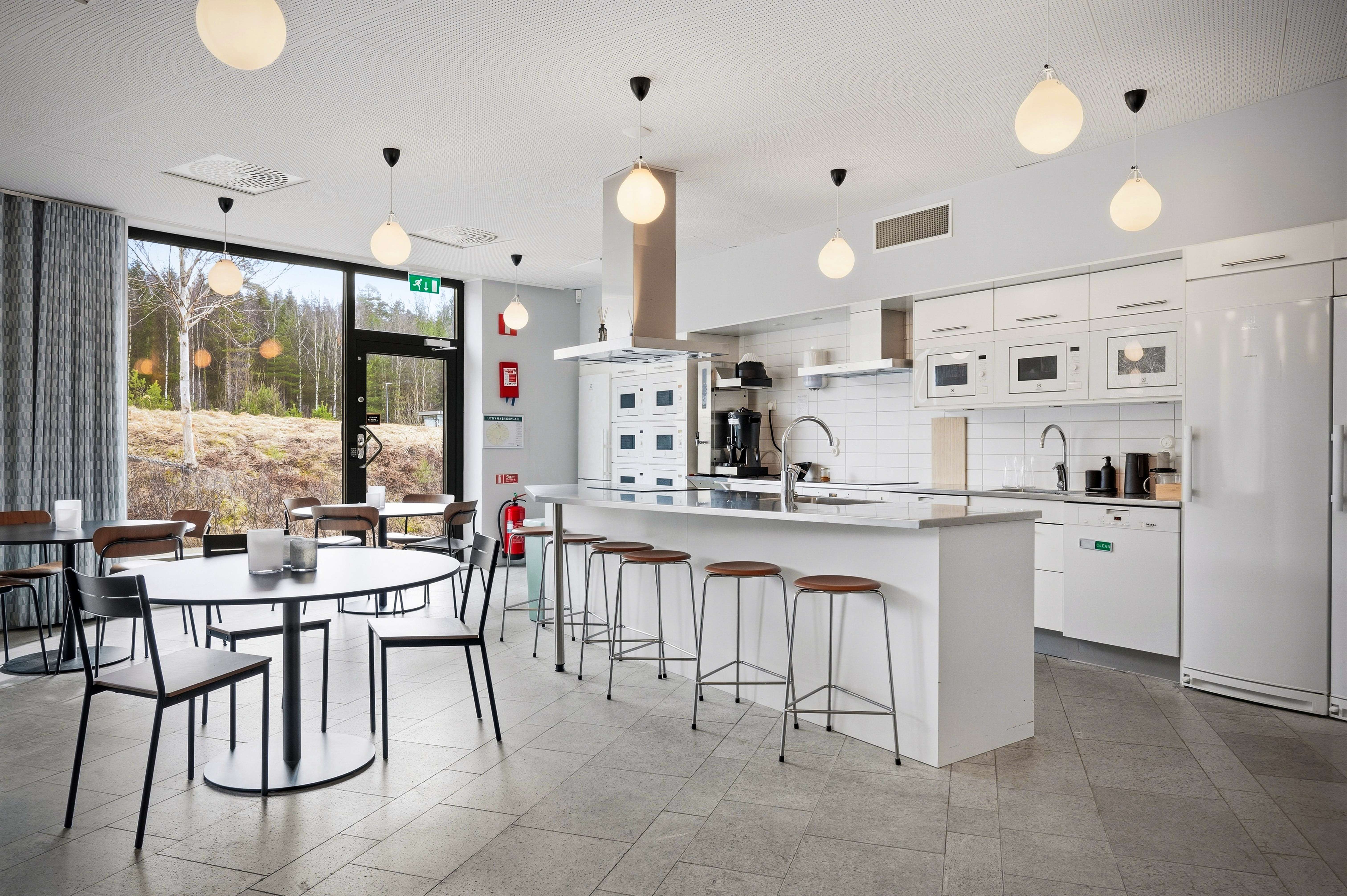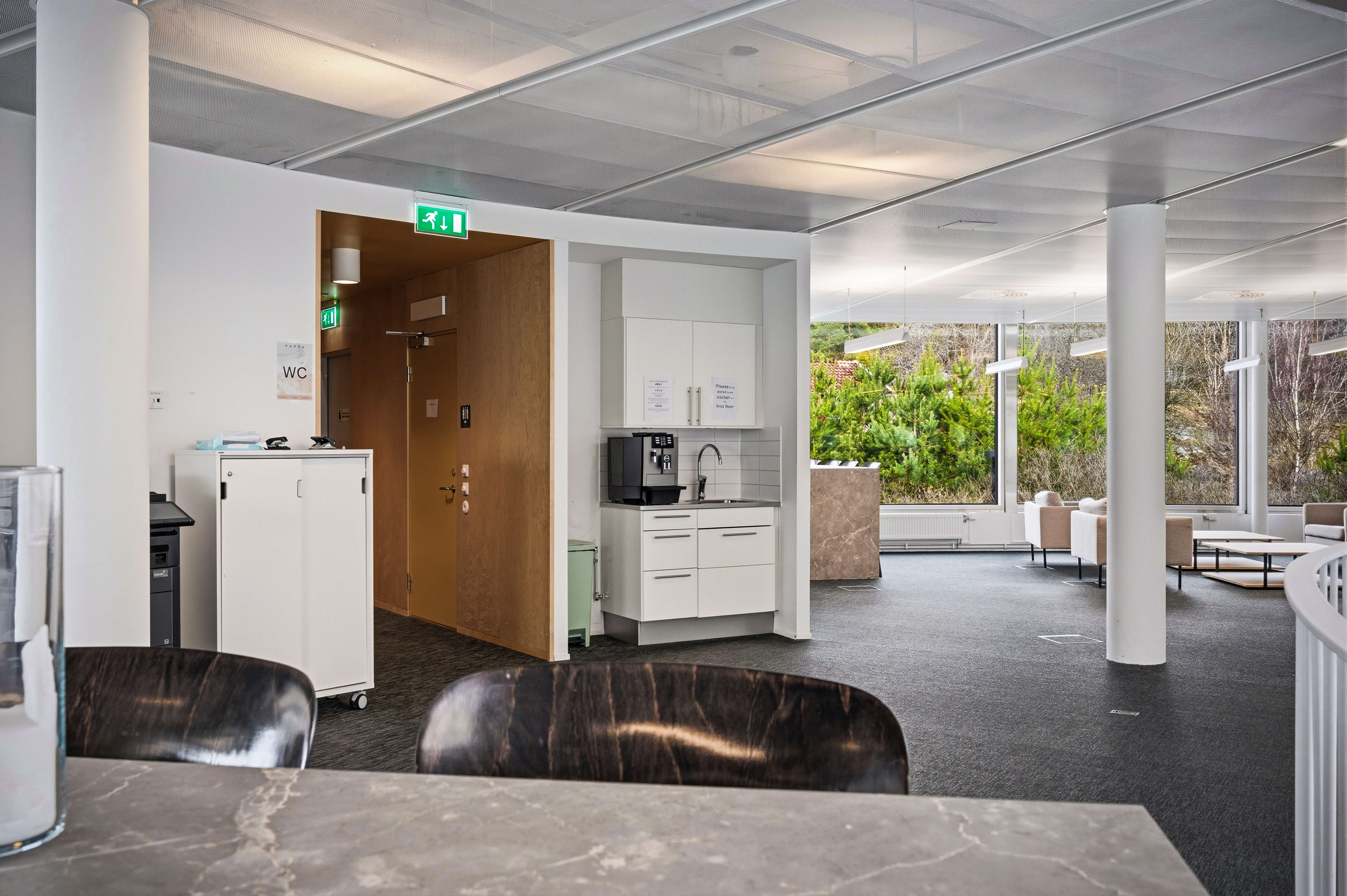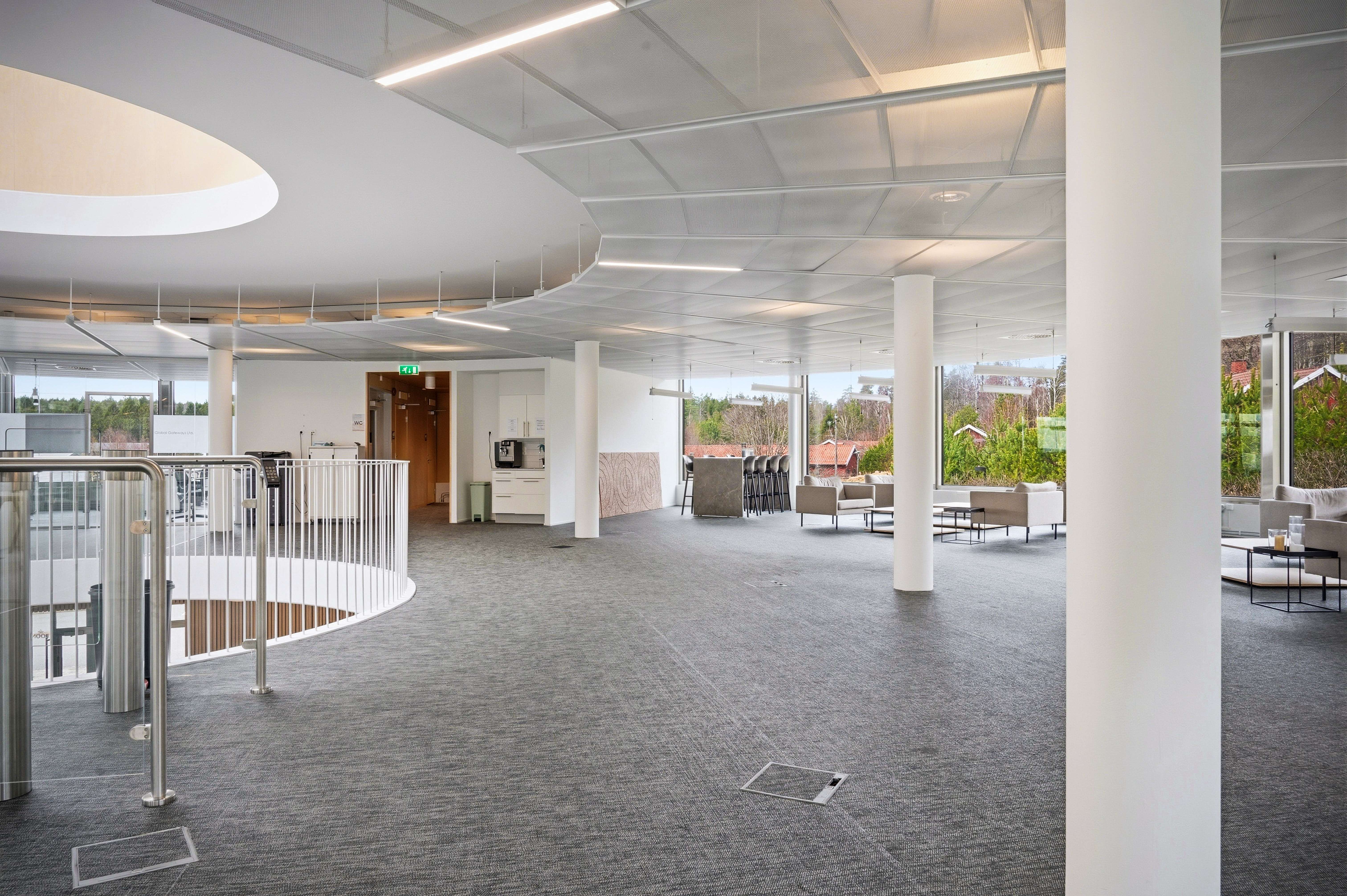 På det övre planet erbjuds moderna och flexibla kontorsytor med möjlighet till öppna landskap, teamytor och enskilda rum. Generösa glaspartier runt hela byggnaden ger ett fantastiskt ljusinsläpp och skapar en stark koppling till den omgivande grönskan.