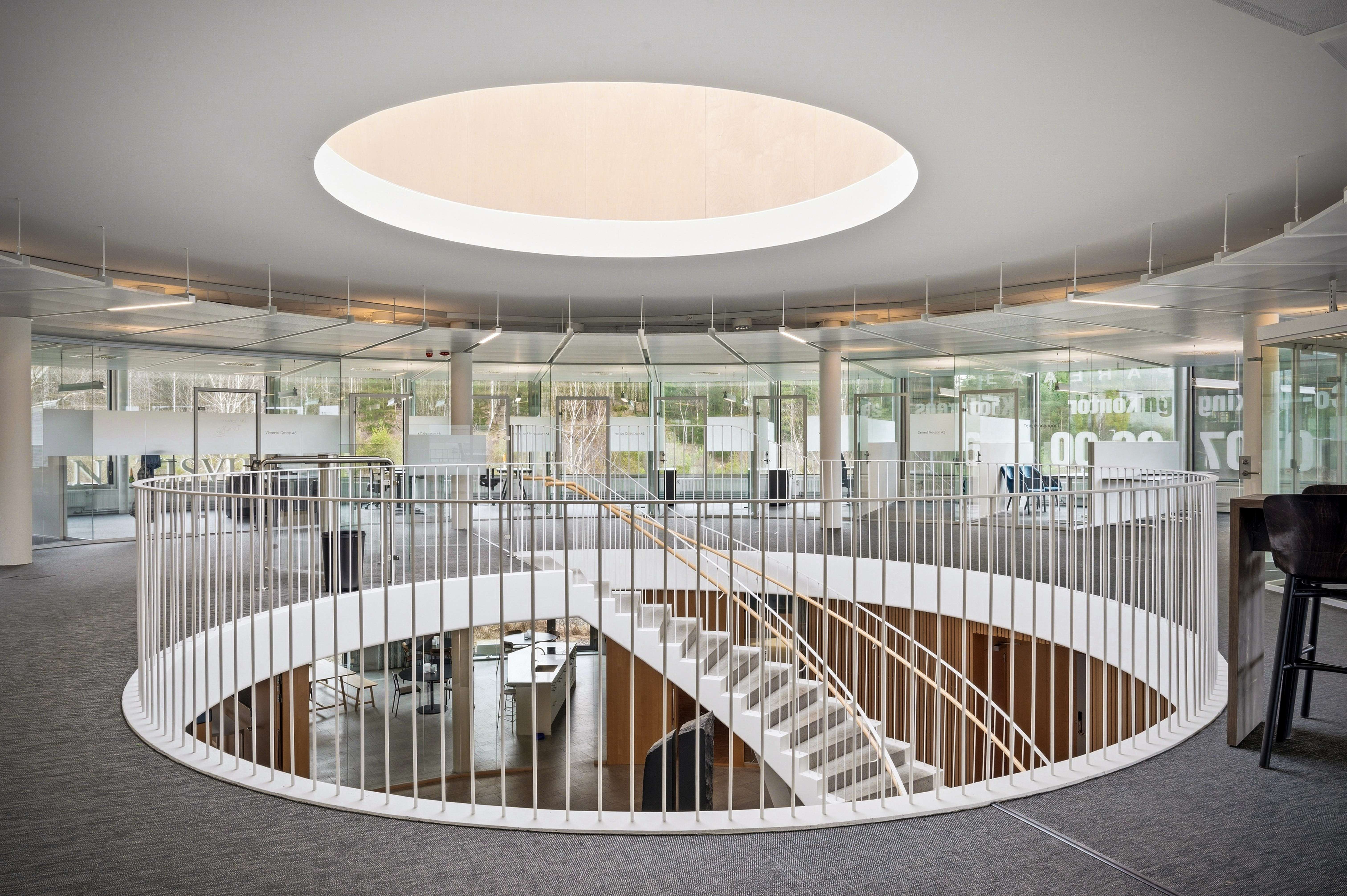 Byggnaden utmärker sig genom sin runda form och genomtänkta struktur, där ett representativt entréplan med generösa gemensamma ytor möter ett övre plan med flexibla arbetsmiljöer. Fastighetens hjärta utgörs av ett imponerande atrium med stor rymd och visuell kontakt mellan våningsplanen.