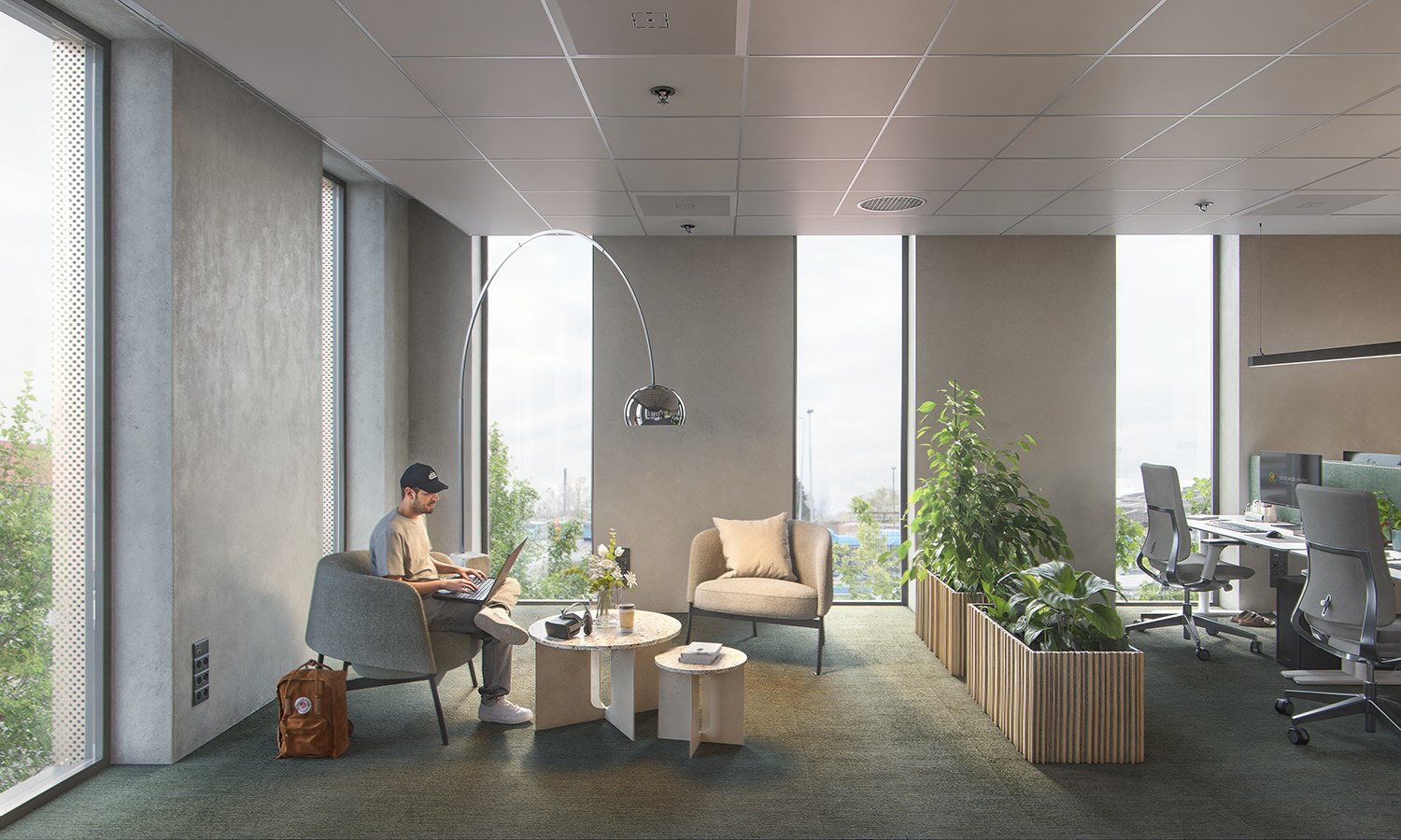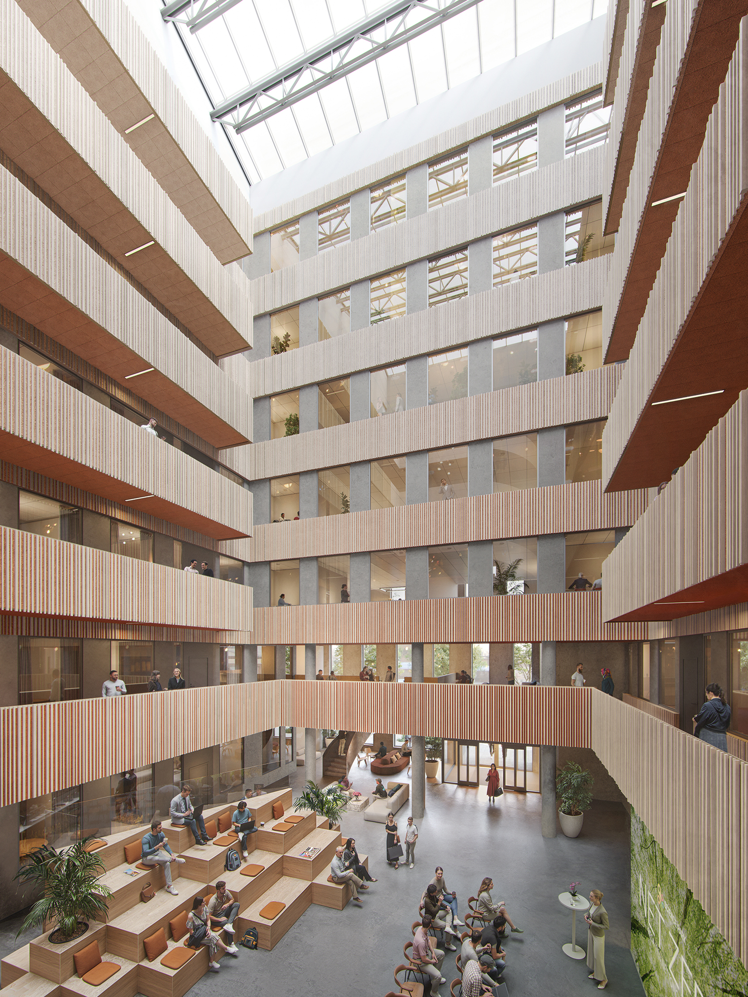 Noden är utformad efter företagens behov, med flexibla kontorsytor som kan anpassas helt efter verksamhetens önskemål – från mindre arbetsplatser till hela våningsplan. Entréplanet är husets hjärta, en öppen och tillgänglig yta för både hyresgäster och besökare som rymmer upp till 150 personer med sittplatser i olika nivåer. Här kan man arrangera mingel, evenemang och möten, samtidigt som ljusgården fungerar som en naturlig mötesplats där studenter och forskare möts med entreprenörer, utvecklare och kreatörer för inspiration och idéutbyte.