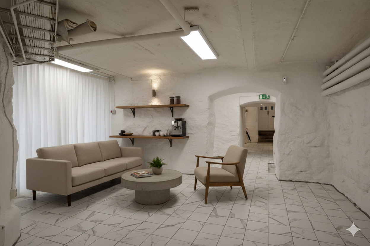 Lokalen ligger på souterrängplan och erbjuder en genomtänkt rumsindelning som skapar naturliga zoner för showroom, kontor och lager, allt under ett tak. Den egna gatuentrén ger ett representativt och välkomnande intryck och gör lokalen enkel att nyttja för olika typer av verksamheter.