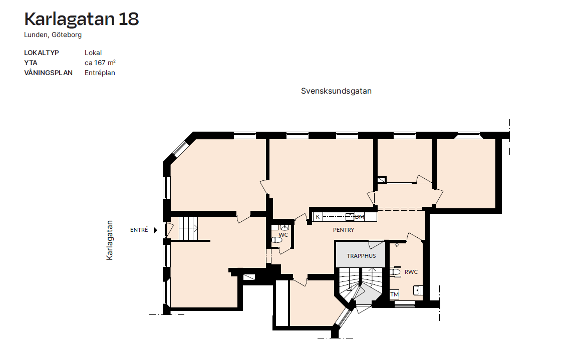 Entrén nås direkt från gatan, vilket ger ett smidigt och representativt mottagande för både medarbetare och besökare. Lokalen är utrustad med fiberanslutning och håller en genomgående funktionell standard.