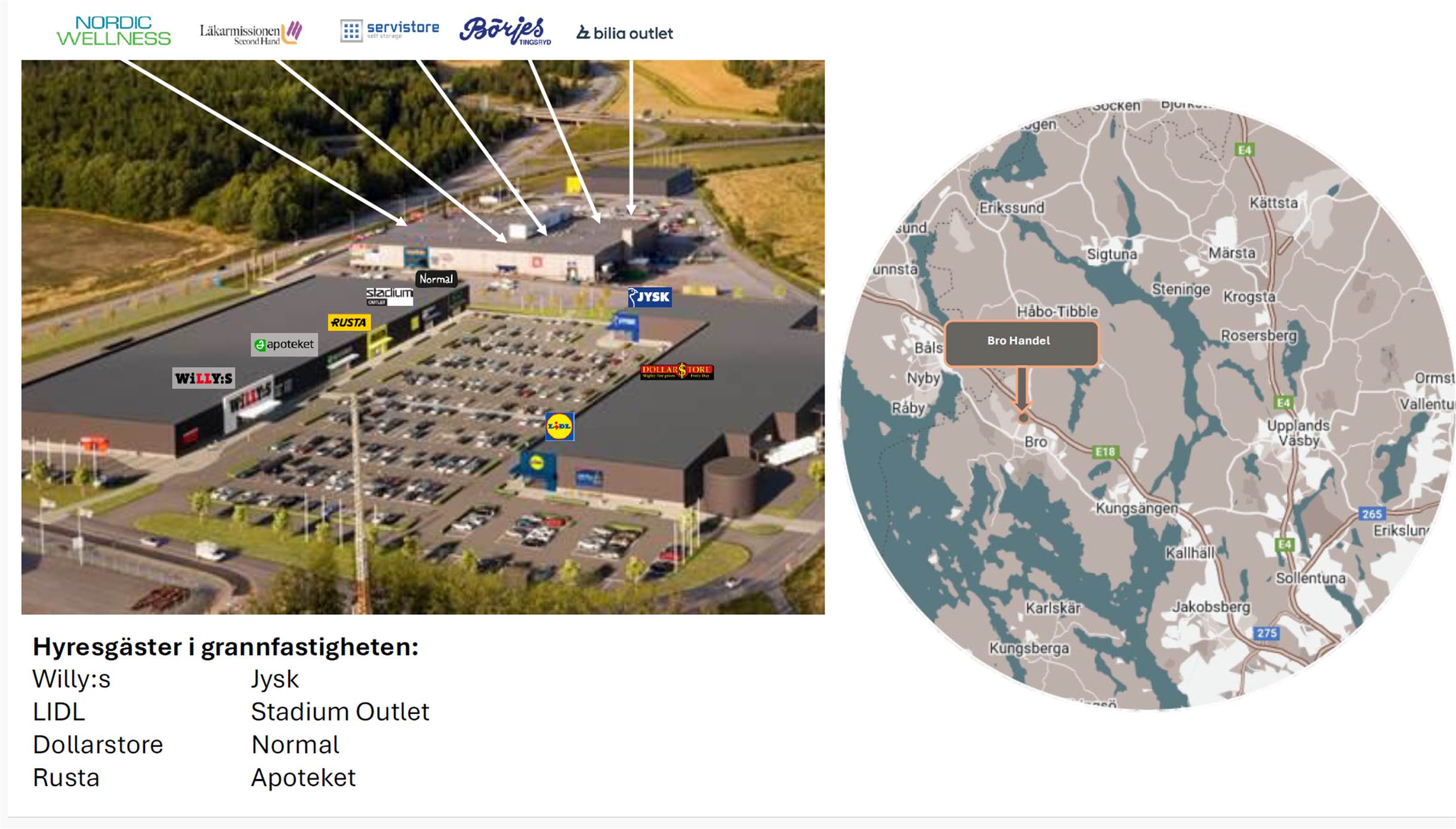 Bro Hof, Bro Travbana, Willys, Jysk, Dollarstore, Bilia Outlet och Nordic Wellness, . Rusta, Stadium Outlet, Normal, Apoteket och Lidl i området.