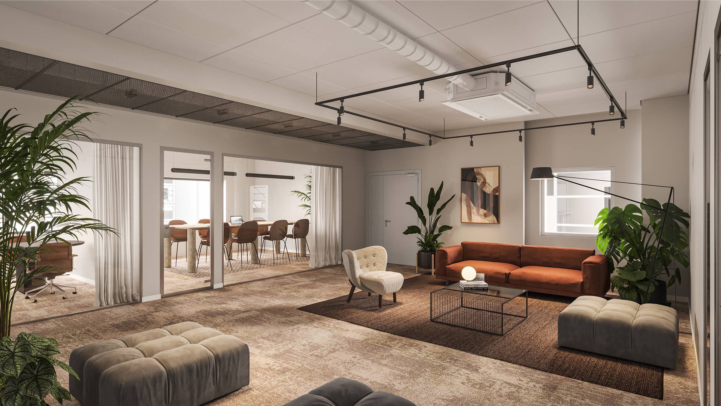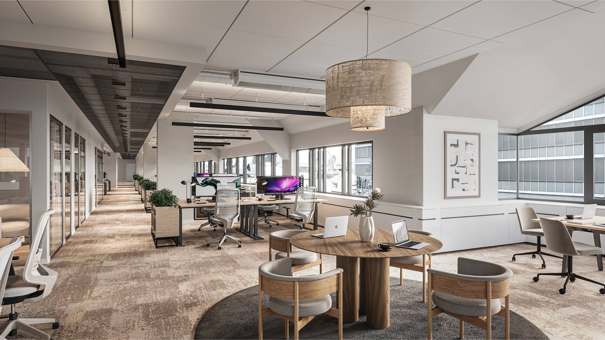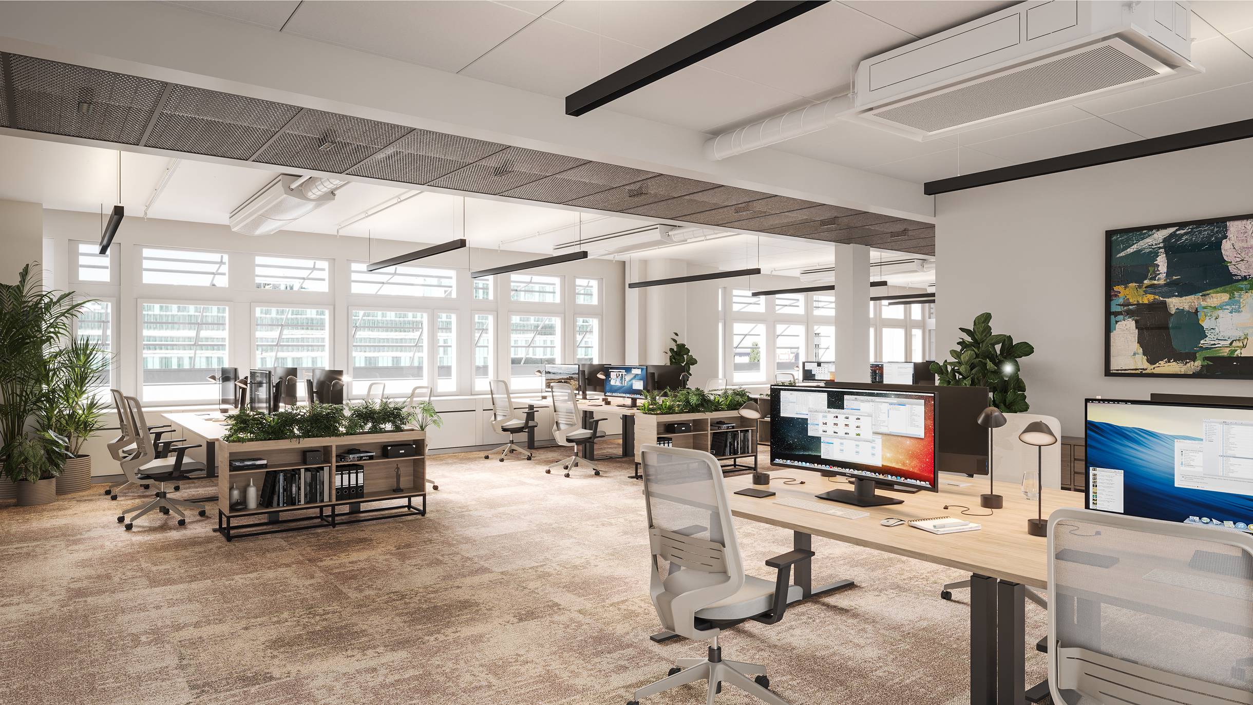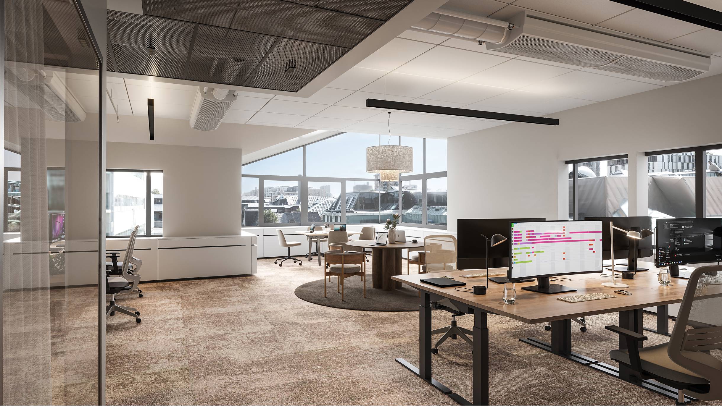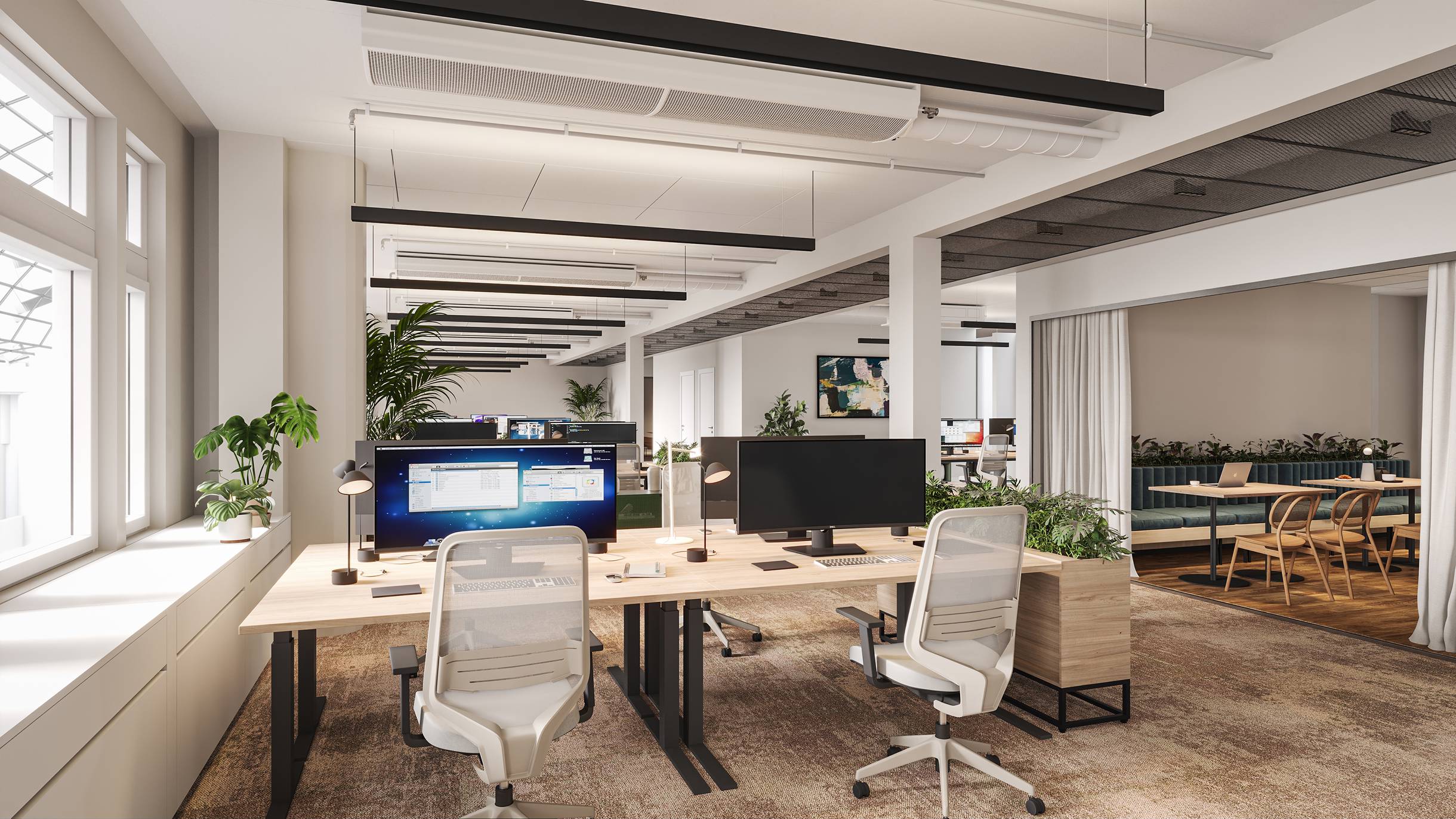 Lokalen har en bra uppdelning med intern och extern del med mötesrum för besökare. Stora öppna kontorslandskap med möjlighet att skapa aktivitetsbaserade ytor.