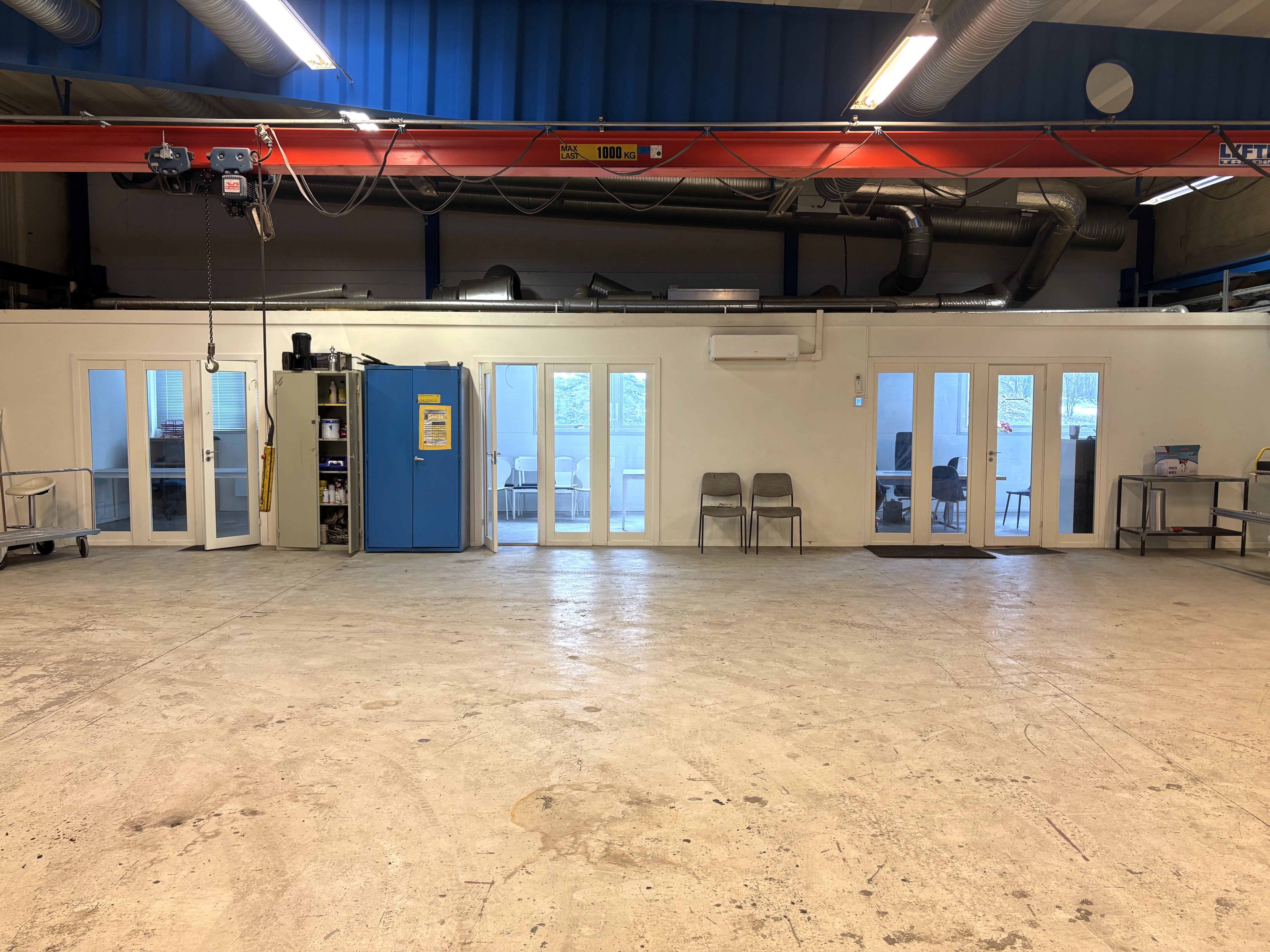 Lokalen har stora öppna ytor utan en massa bärande pelare som är i vägen och en monterad travers (1000 kg) längsmed hela lokalen. Vikporten mäter B 3,5 m och H 4 m. Takbelysningen är god och från lokalens alla fönster får man in en utmärkt ljusinsläpp. Utöver perfekta verkstadsytor finns omklädningsrum, wc, dusch, 2 kontors- och mötesrum, kök med matplats. Utanför lokalen finns bra yta för inkommande leveranser samt p-platser. Hyresvärden är öppen för att anpassa lokalen för passa hyresgästen perfekt. Denna lokal kan vara perfekt för ett företags behov men kan för rätt hyresgäster även delas upp i 2 lokaler.