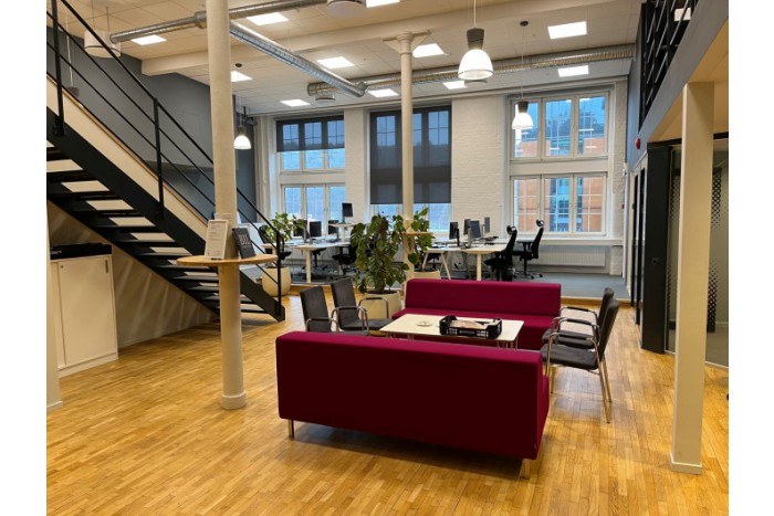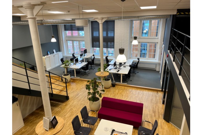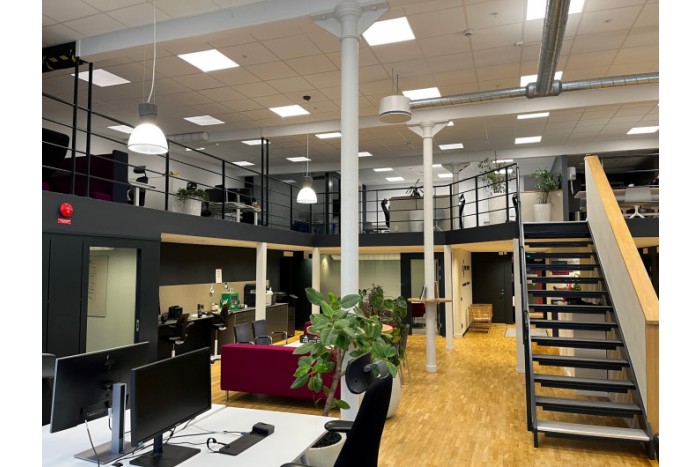 Modern kontorslokal med öppen planlösning. Vissa arbetsplatser och pausrum ligger på ett entresolplan.
