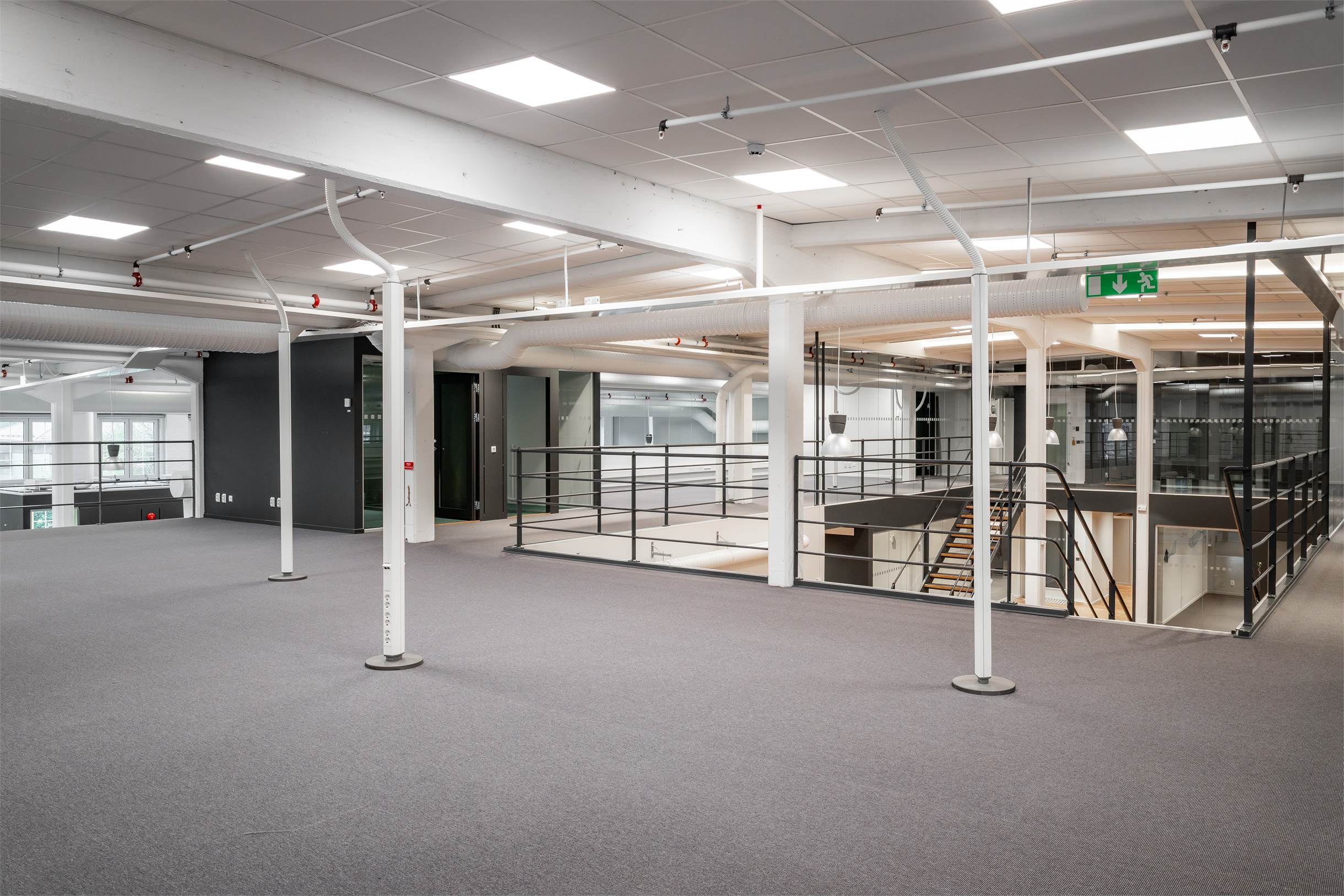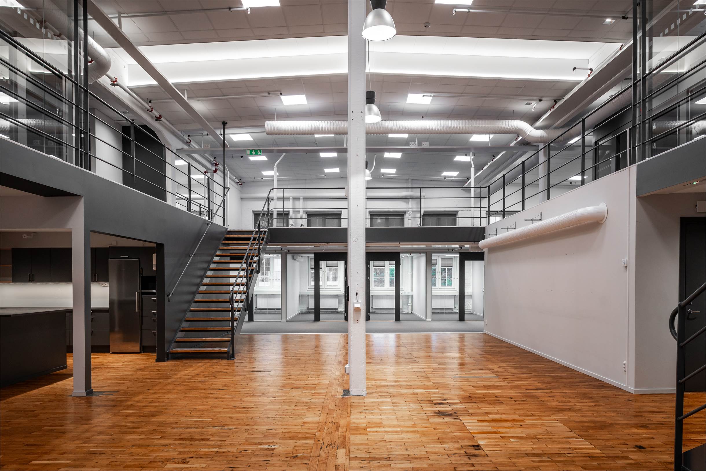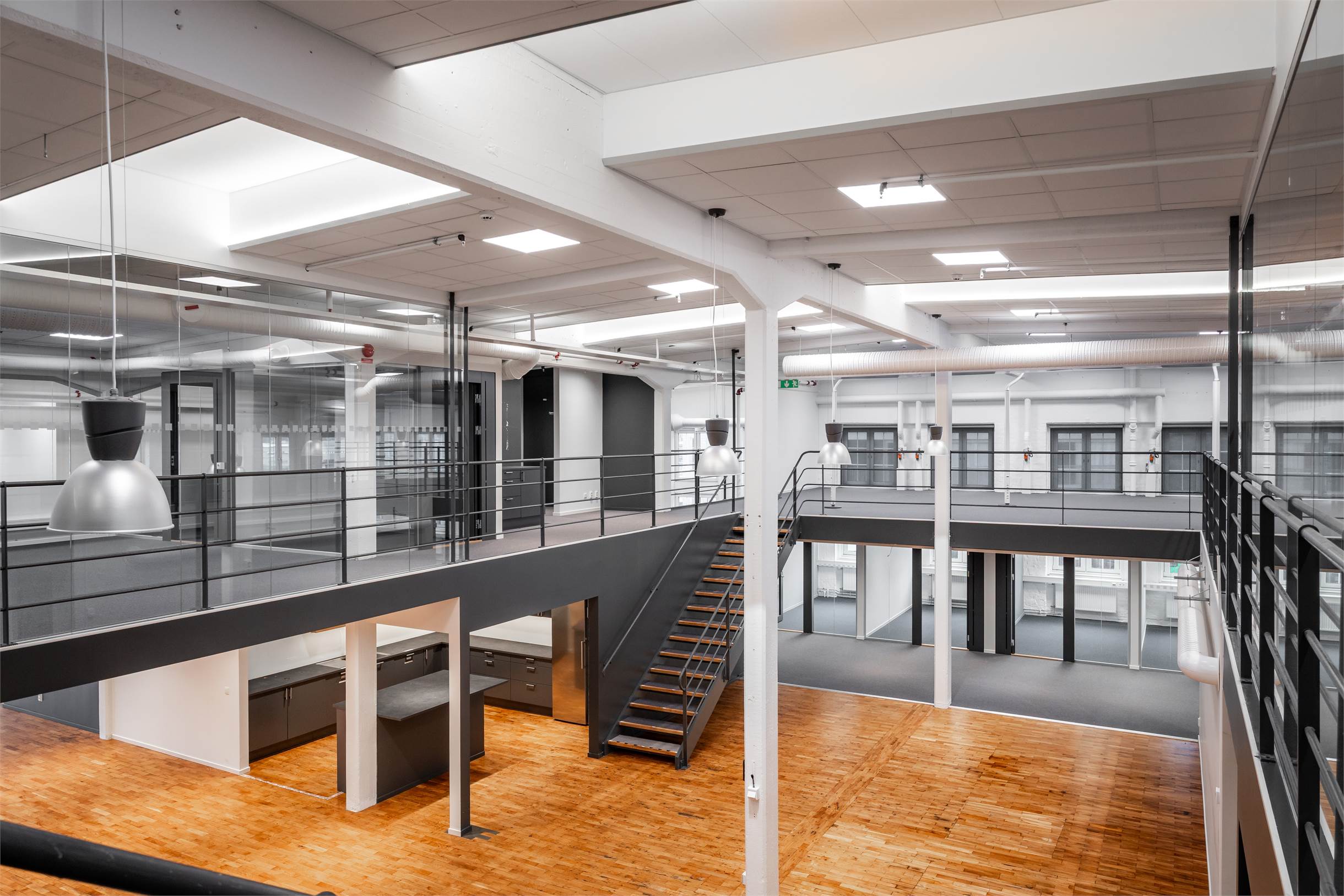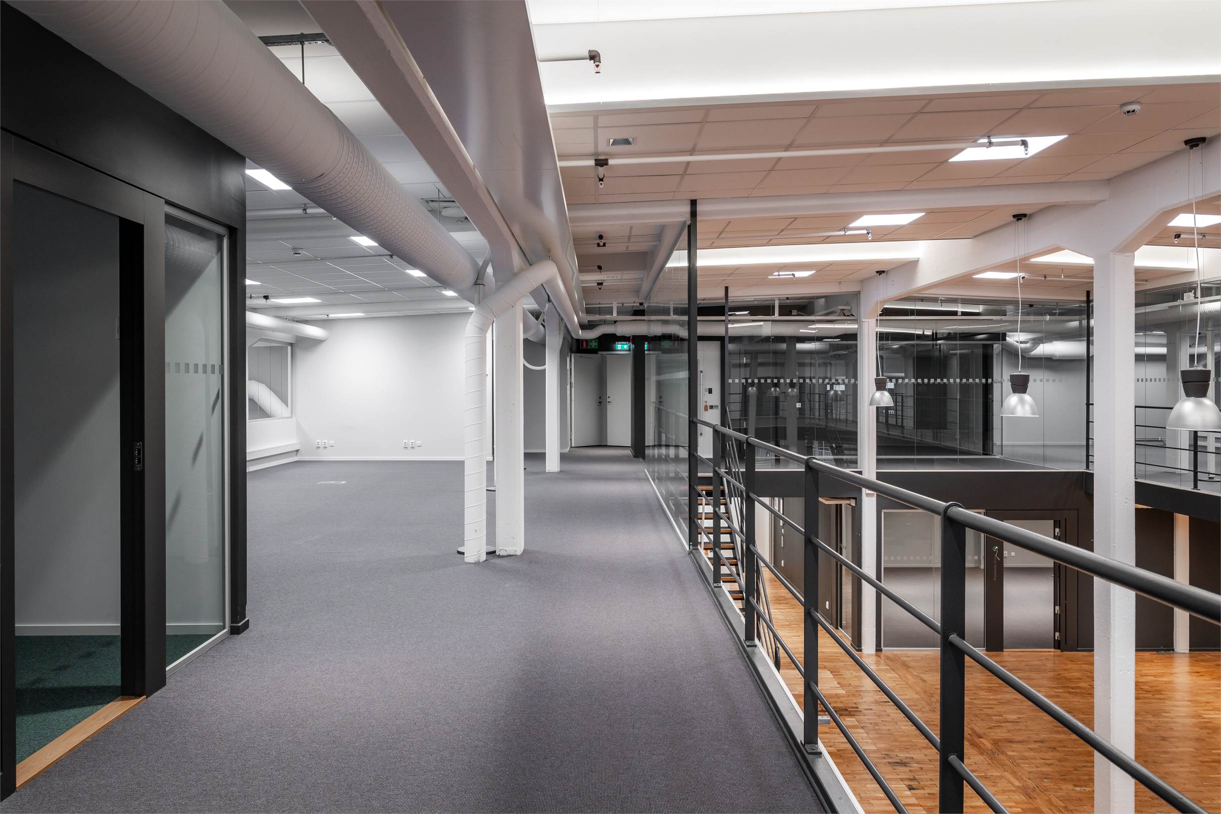 Lokalen har en planlösning med entresolplan i mitten. De varierande ytorna gör det möjligt att kombinera stora öppna arbetsytor, kontor, mötesrum och sociala zoner, perfekt för företag som vill skapa något eget och särskilja sig.