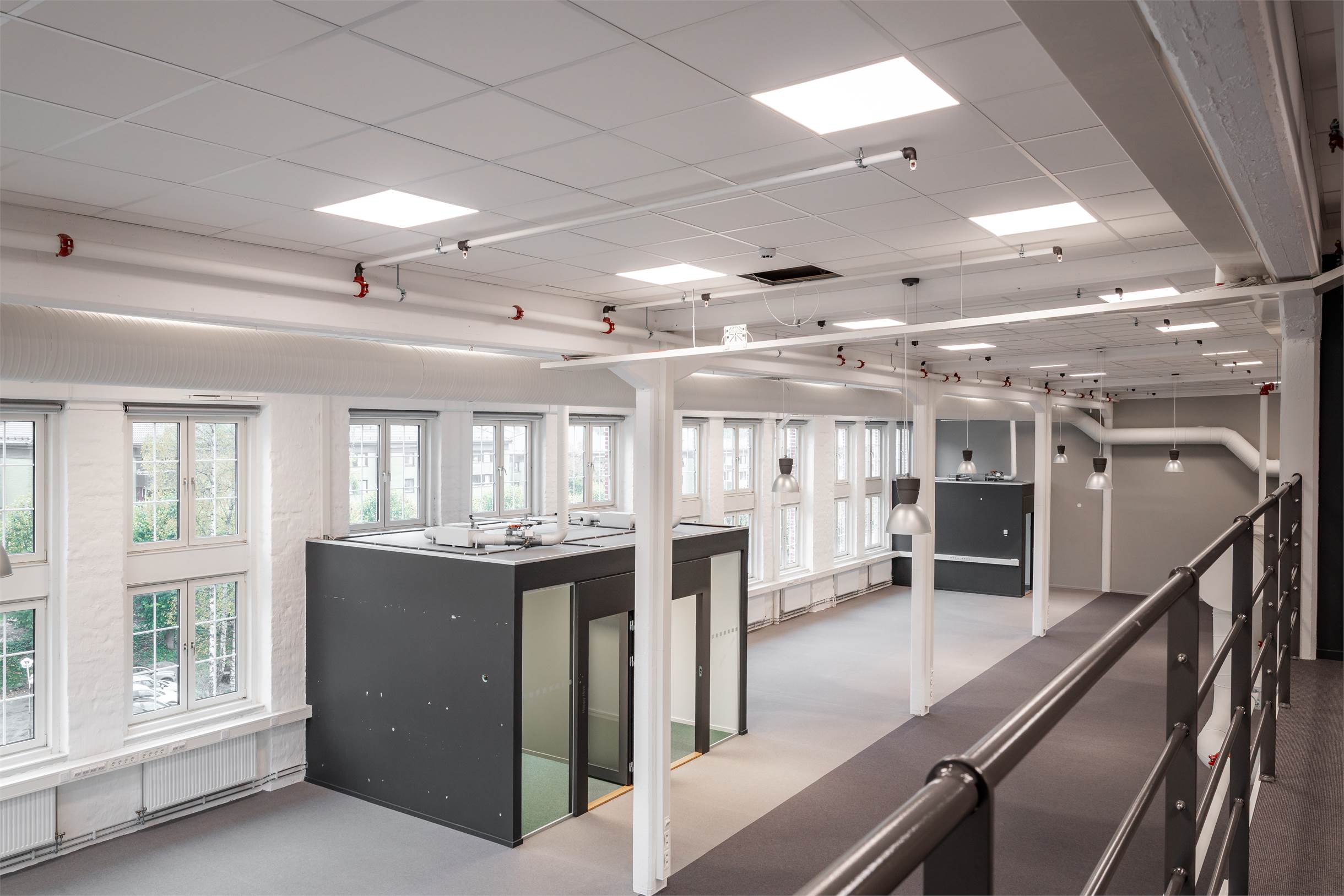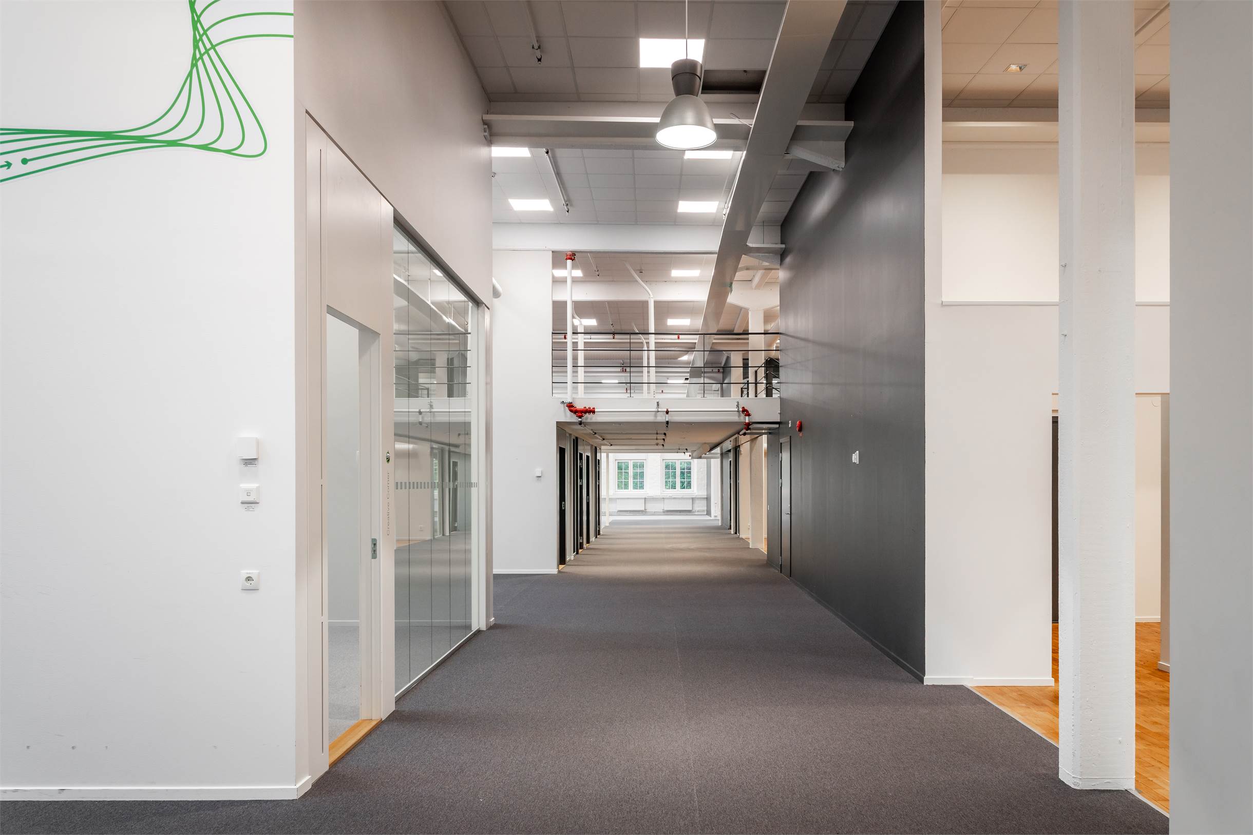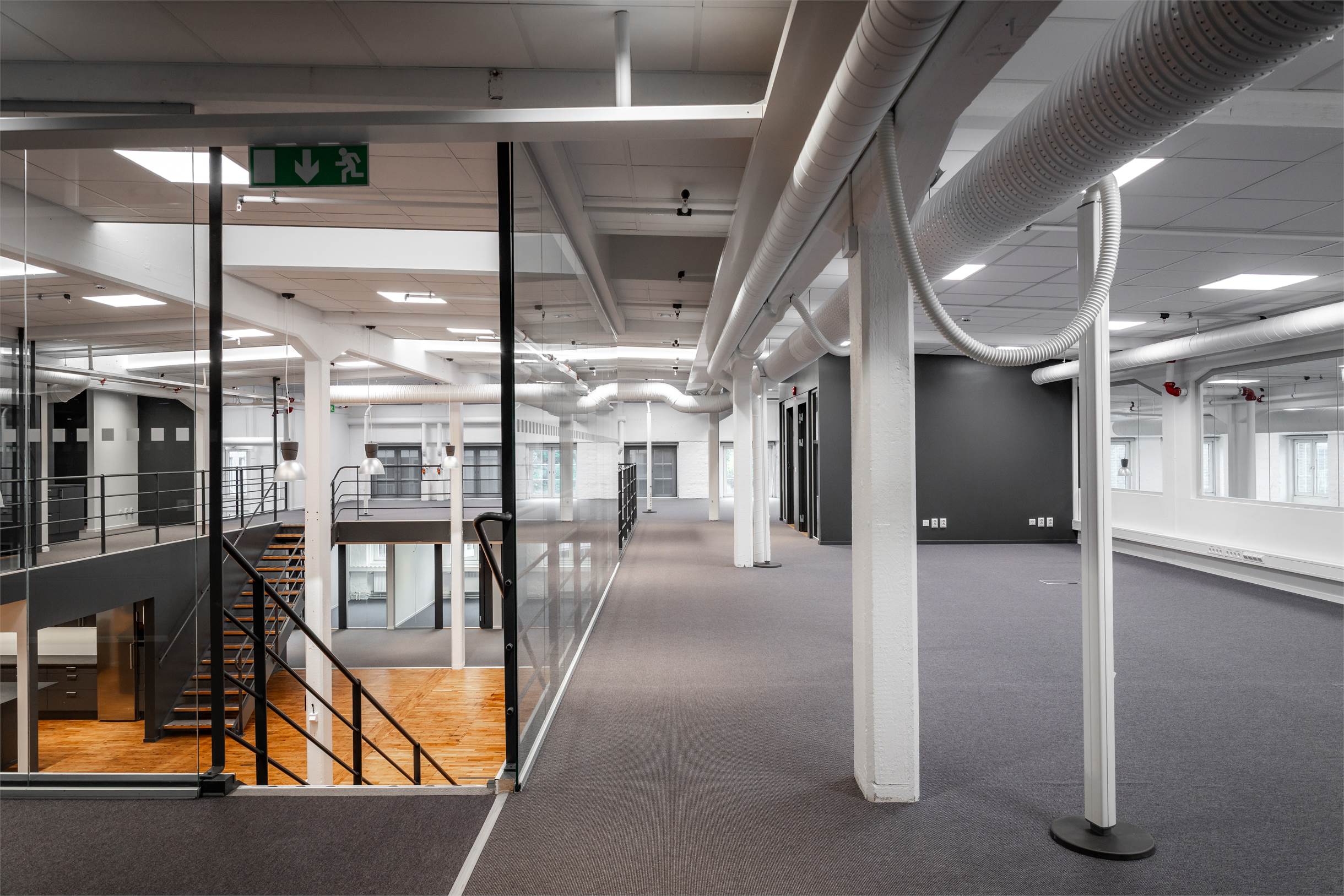 Lokalen har en planlösning med entresolplan i mitten. De varierande ytorna gör det möjligt att kombinera stora öppna arbetsytor, kontor, mötesrum och sociala zoner, perfekt för företag som vill skapa något eget och särskilja sig.