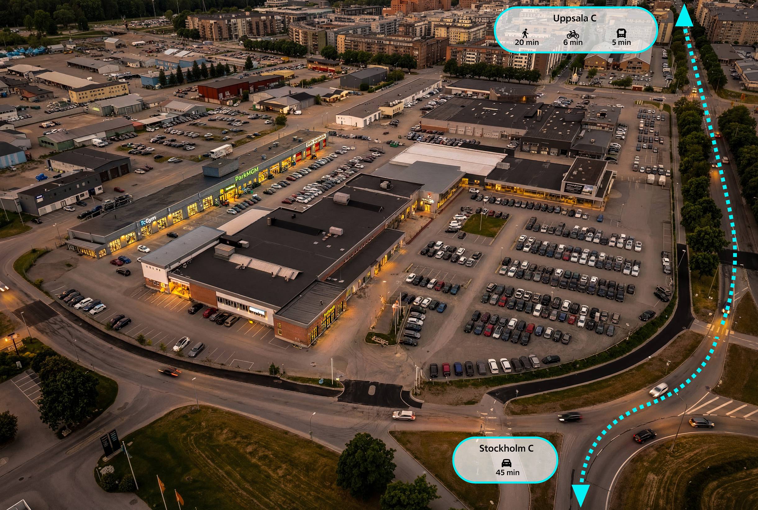 Fastigheten har ett strategiskt läge med smidiga kommunikationer – oavsett om du reser med bil eller kollektivtrafik.