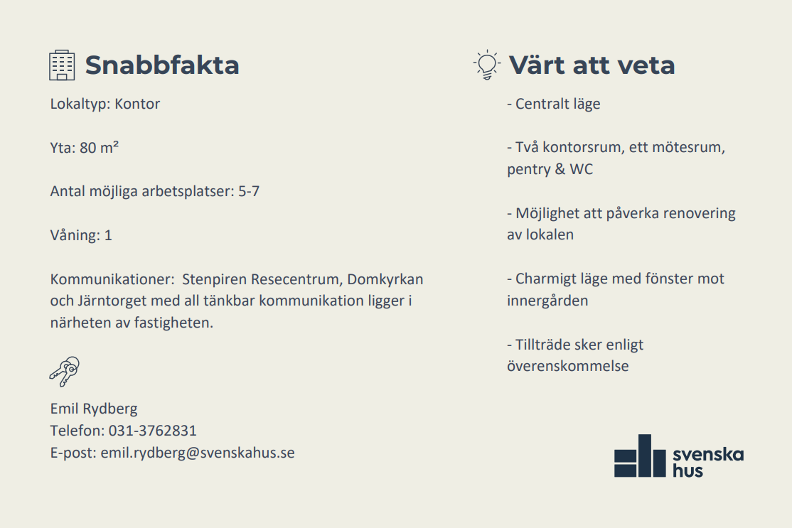 Välkommen till en mycket trevlig kontorslokal för det mindre företaget. Här erbjuds två kontorsrum samt ett mötesrum med fönster mot innergården. Mindre pentry samt WC finns att tillgå. I lokalen finns charmiga inslag med tegelvägg i original, fina trägolv och stora fönster mot Kungsgatan. Lokalen ligger med direkt närhet till flertalet lunchställen, butiker och annan service.