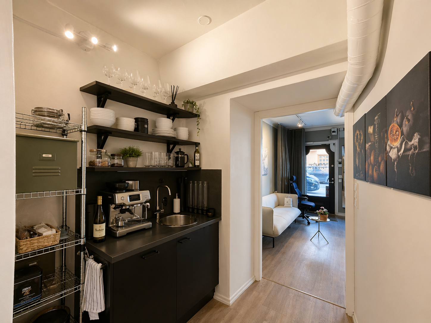 Lokalen har ett stort skyltfönster som ger fint ljusinsläpp och bra exponering mot gatan. Planlösningen är genomtänkt med ett större rum vid entrén och två mindre rum längre in, vilket gör det enkelt att anpassa efter verksamhetens behov.