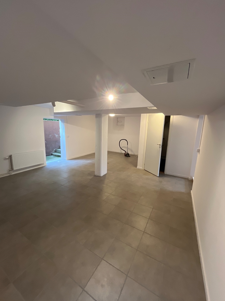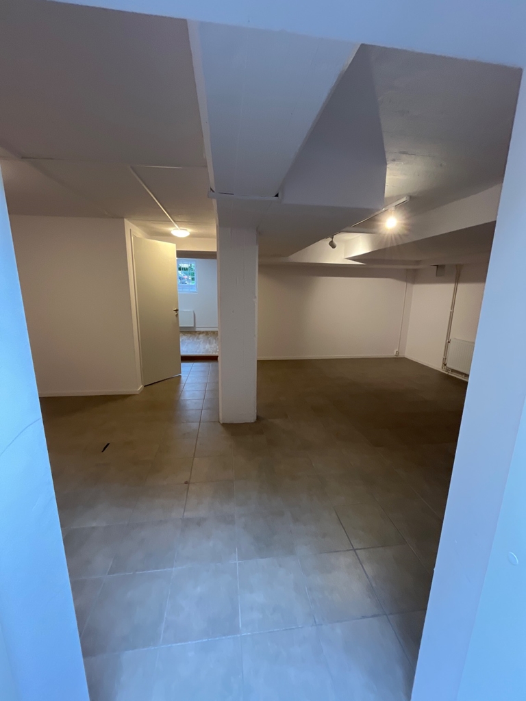 Öppen planlösning för showroom eller lager med intilligande kök/kontor.