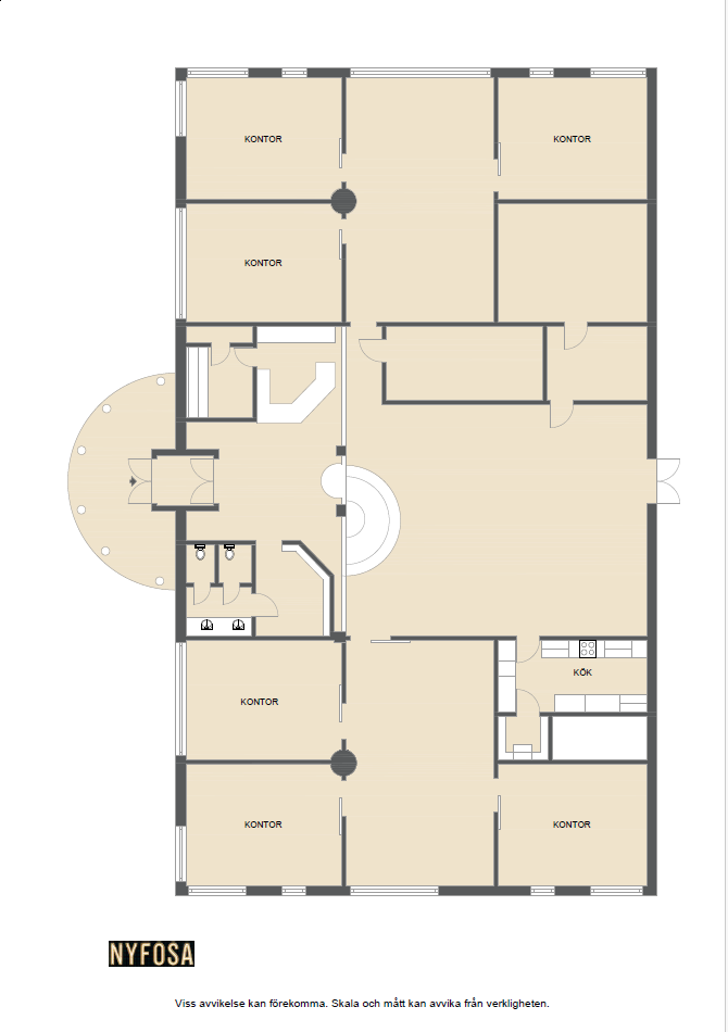 Lokalen är fördelad över två plan och har en flexibel planlösning som passar olika verksamheter. På entréplan möts man av en välkomnande reception som leder vidare till flera kontorsrum i varierande storlekar. Här finns även mötesrum, ett fullt utrustat kök med matplats. Övre plan erbjuder ytterligare kontorsrum och arbetsytor och ett stort konferensrum. Lokalen är ljus och modern med stora fönster som ger ett öppet och luftigt intryck. Planlösningen är anpassningsbar och kan utformas efter verksamhetens behov, vare sig det handlar om öppna kontorslandskap eller mer avskilda arbetsrum.