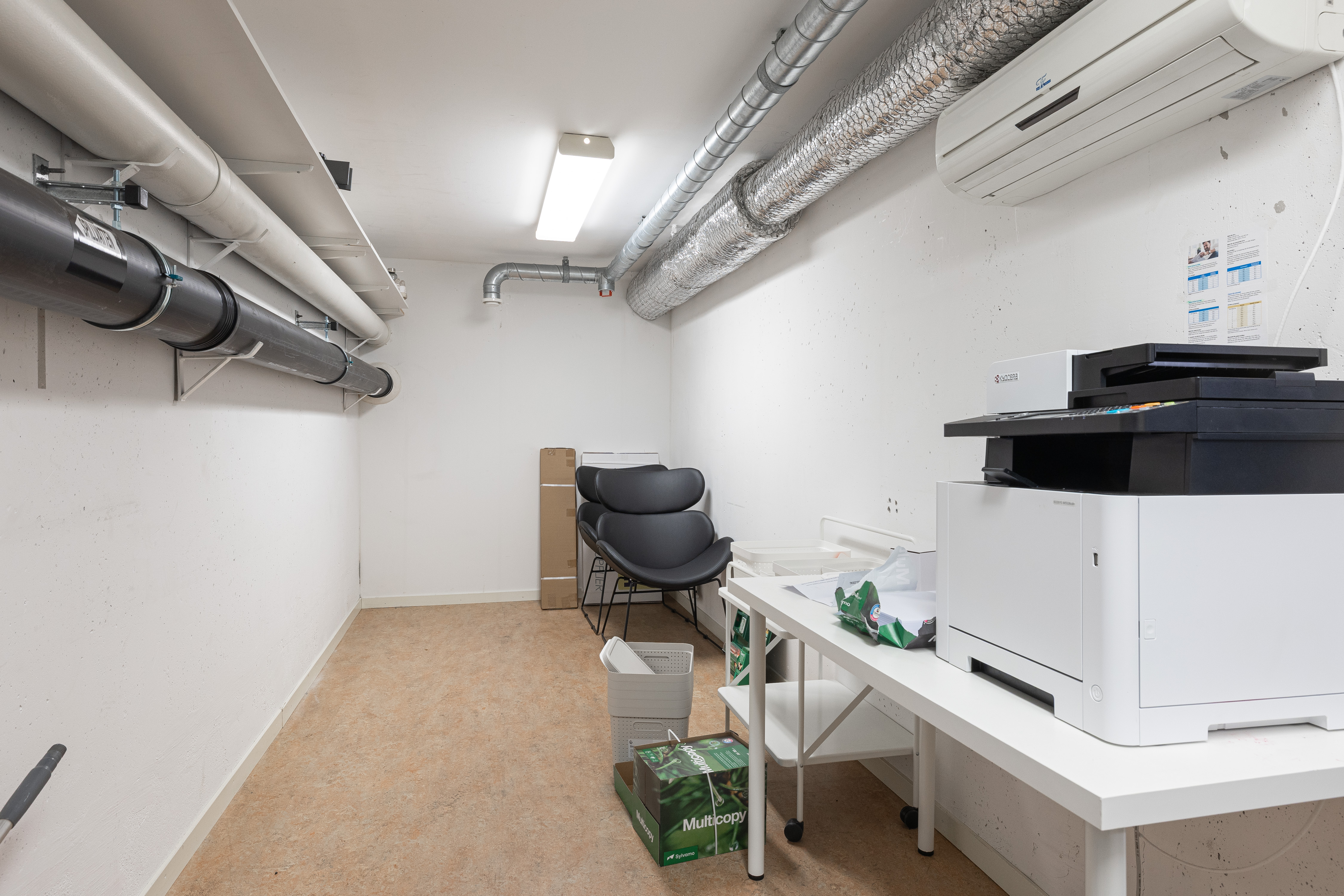 Öppen kontorsmiljö med en välplanerad planlösning. Lokalen består av ett rymligt konferensrum samt två mötesrum, alternativt extra kontorsrum. Här finns även pentry, WC med dusch och ett stort förråd.